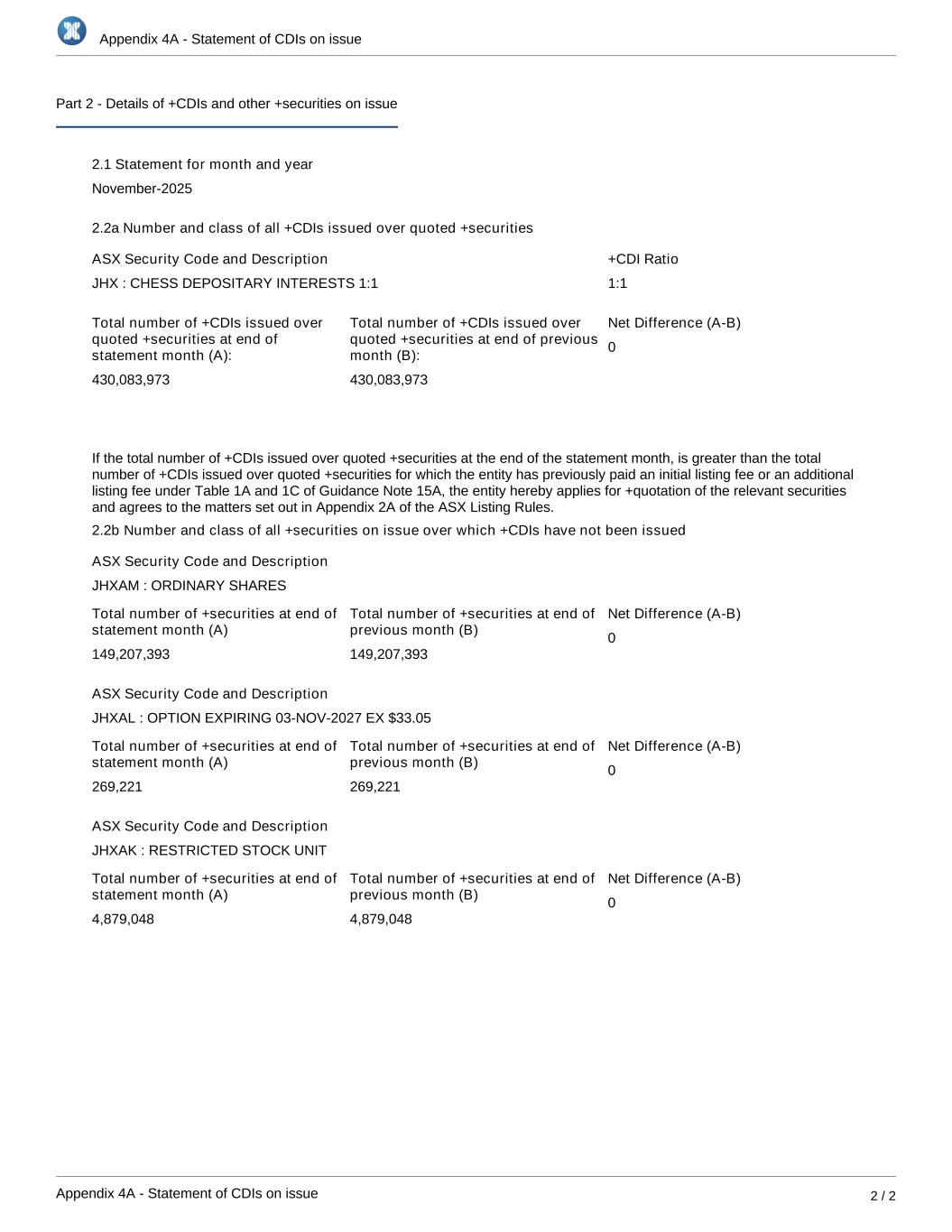 Appendix 4A - Statement of CDIs on issue Appendix 4A - Statement of CDIs on issue 2 / 2 Part 2 - Details of +CDIs and other +securities on issue 2.1 Statement for month and year November-2025 2.2a Number and class of all +CDIs issued over quoted +securities ASX Security Code and Description JHX : CHESS DEPOSITARY INTERESTS 1:1 +CDI Ratio 1:1 Total number of +CDIs issued over quoted +securities at end of statement month (A): 430,083,973 Total number of +CDIs issued over quoted +securities at end of previous month (B): 430,083,973 Net Difference (A-B) 0 If the total number of +CDIs issued over quoted +securities at the end of the statement month, is greater than the total number of +CDIs issued over quoted +securities for which the entity has previously paid an initial listing fee or an additional listing fee under Table 1A and 1C of Guidance Note 15A, the entity hereby applies for +quotation of the relevant securities and agrees to the matters set out in Appendix 2A of the ASX Listing Rules. 2.2b Number and class of all +securities on issue over which +CDIs have not been issued ASX Security Code and Description JHXAM : ORDINARY SHARES Total number of +securities at end of statement month (A) 149,207,393 Total number of +securities at end of previous month (B) 149,207,393 Net Difference (A-B) 0 ASX Security Code and Description JHXAL : OPTION EXPIRING 03-NOV-2027 EX $33.05 Total number of +securities at end of statement month (A) 269,221 Total number of +securities at end of previous month (B) 269,221 Net Difference (A-B) 0 ASX Security Code and Description JHXAK : RESTRICTED STOCK UNIT Total number of +securities at end of statement month (A) 4,879,048 Total number of +securities at end of previous month (B) 4,879,048 Net Difference (A-B) 0