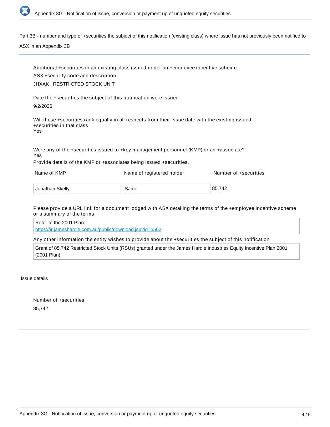 Appendix 3G - Notification of issue, conversion or payment up of unquoted equity securities Appendix 3G - Notification of issue, conversion or payment up of unquoted equity securities 4 / 6 Part 3B - number and type of +securities the subject of this notification (existing class) where issue has not previously been notified to ASX in an Appendix 3B Additional +securities in an existing class issued under an +employee incentive scheme ASX +security code and description JHXAK : RESTRICTED STOCK UNIT Date the +securities the subject of this notification were issued 9/2/2026 Will these +securities rank equally in all respects from their issue date with the existing issued +securities in that class Were any of the +securities issued to +key management personnel (KMP) or an +associate? Provide details of the KMP or +associates being issued +securities. Name of KMP Name of registered holder Number of +securities Jonathan Skelly Same 85,742 Please provide a URL link for a document lodged with ASX detailing the terms of the +employee incentive scheme or a summary of the terms Refer to the 2001 Plan: https://ir.jameshardie.com.au/public/download.jsp?id=5562 Any other information the entity wishes to provide about the +securities the subject of this notification Grant of 85,742 Restricted Stock Units (RSUs) granted under the James Hardie Industries Equity Incentive Plan 2001 (2001 Plan) Issue details Number of +securities 85,742 Yes Yes