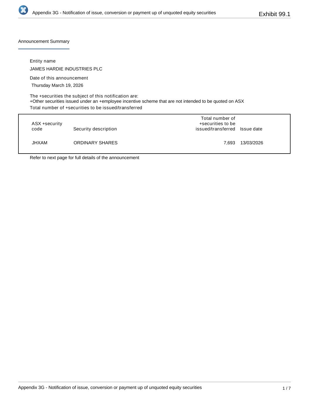Appendix 3G - Notification of issue, conversion or payment up of unquoted equity securities Appendix 3G - Notification of issue, conversion or payment up of unquoted equity securities 1 / 7 Announcement Summary Entity name JAMES HARDIE INDUSTRIES PLC Date of this announcement Thursday March 19, 2026 The +securities the subject of this notification are: Total number of +securities to be issued/transferred ASX +security code Security description Total number of +securities to be issued/transferred Issue date JHXAM ORDINARY SHARES 7,693 13/03/2026 Refer to next page for full details of the announcement +Other securities issued under an +employee incentive scheme that are not intended to be quoted on ASX