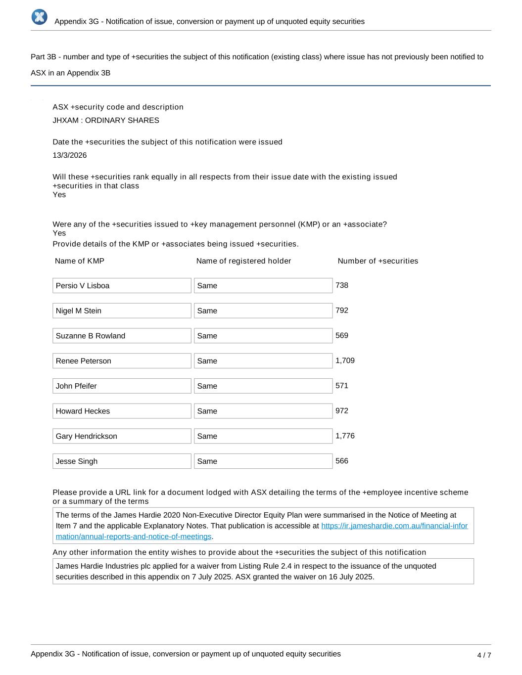 Appendix 3G - Notification of issue, conversion or payment up of unquoted equity securities Appendix 3G - Notification of issue, conversion or payment up of unquoted equity securities 4 / 7 Part 3B - number and type of +securities the subject of this notification (existing class) where issue has not previously been notified to ASX in an Appendix 3B ASX +security code and description JHXAM : ORDINARY SHARES Date the +securities the subject of this notification were issued 13/3/2026 Will these +securities rank equally in all respects from their issue date with the existing issued +securities in that class Were any of the +securities issued to +key management personnel (KMP) or an +associate? Provide details of the KMP or +associates being issued +securities. Name of KMP Name of registered holder Number of +securities Persio V Lisboa Same 738 Nigel M Stein Same 792 Suzanne B Rowland Same 569 Renee Peterson Same 1,709 John Pfeifer Same 571 Howard Heckes Same 972 Gary Hendrickson Same 1,776 Jesse Singh Same 566 Please provide a URL link for a document lodged with ASX detailing the terms of the +employee incentive scheme or a summary of the terms The terms of the James Hardie 2020 Non-Executive Director Equity Plan were summarised in the Notice of Meeting at Item 7 and the applicable Explanatory Notes. That publication is accessible at https://ir.jameshardie.com.au/financial-infor . mation/annual-reports-and-notice-of-meetings Any other information the entity wishes to provide about the +securities the subject of this notification James Hardie Industries plc applied for a waiver from Listing Rule 2.4 in respect to the issuance of the unquoted securities described in this appendix on 7 July 2025. ASX granted the waiver on 16 July 2025. Yes Yes