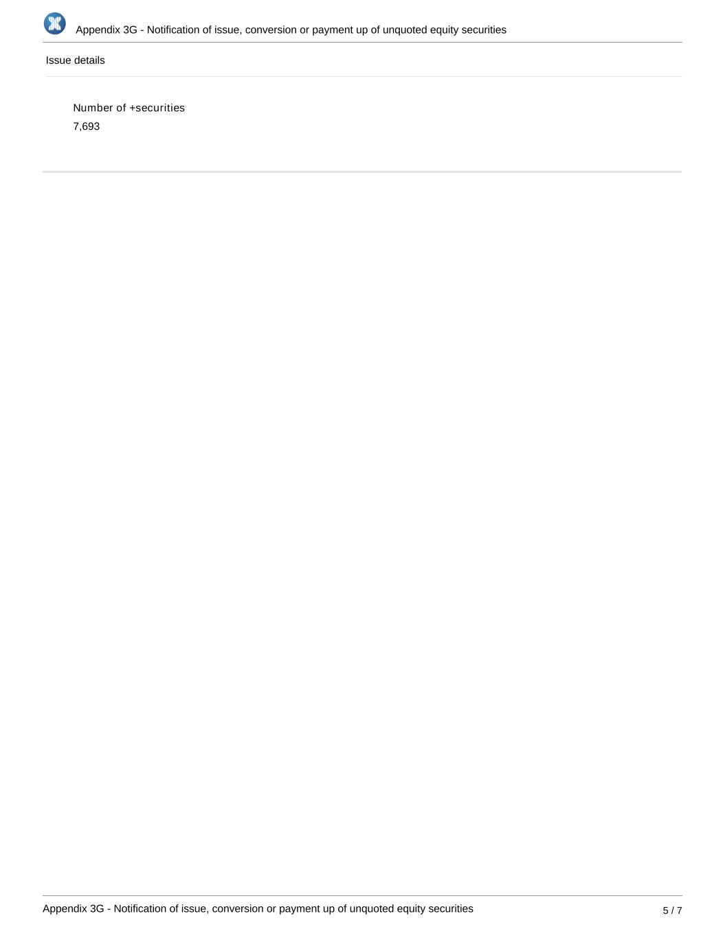 Appendix 3G - Notification of issue, conversion or payment up of unquoted equity securities Appendix 3G - Notification of issue, conversion or payment up of unquoted equity securities 5 / 7 Issue details Number of +securities 7,693