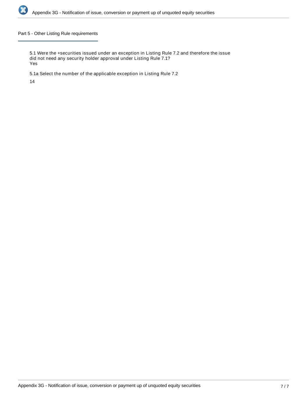 Appendix 3G - Notification of issue, conversion or payment up of unquoted equity securities Appendix 3G - Notification of issue, conversion or payment up of unquoted equity securities 7 / 7 Part 5 - Other Listing Rule requirements 5.1 Were the +securities issued under an exception in Listing Rule 7.2 and therefore the issue did not need any security holder approval under Listing Rule 7.1? 5.1a Select the number of the applicable exception in Listing Rule 7.2 14 Yes