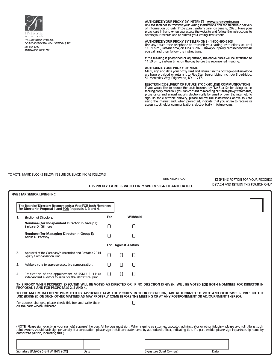AUTHORIZE YOUR PROXY BY INTERNET - www.proxyvote.com Use the internet to transmit your voting instructions and for electronic delivery of information up until 11:59 p.m., Eastern time, on June 8, 2020. Have your proxy card in hand when you access the website and follow the instructions to obtain your records and to submit your voting instructions. AUTHORIZE YOUR PROXY BY TELEPHONE - 1-800-690-6903 Use any touch-tone telephone to transmit your voting instructions up until 11:59 p.m., Eastern time, on June 8, 2020. Have your proxy card in hand when you call and then follow the instructions. FIVE STAR SENIOR LIVING INC. C/O BROADRIDGE FINANCIAL SOLUTIONS, INC. P.O. BOX 1342 BRENTWOOD, NY 11717 If the meeting is postponed or adjourned, the above times will be extended to 11:59 p.m., Eastern time, on the day before the reconvened meeting. AUTHORIZE YOUR PROXY BY MAIL Mark, sign and date your proxy card and return it in the postage-paid envelope we have provided or return it to Five Star Senior Living Inc., c/o Broadridge, 51 Mercedes Way, Edgewood, NY 11717. ELECTRONIC DELIVERY OF FUTURE STOCKHOLDER COMMUNICATIONS If you would like to reduce the costs incurred by Five Star Senior Living Inc. in mailing proxy materials, you can consent to receiving all future proxy statements, proxy cards and annual reports electronically by email or over the internet. To sign up for electronic delivery, please follow the instructions above to vote using the internet and, when prompted, indicate that you agree to receive or access stockholder communications electronically in future years. TO VOTE, MARK BLOCKS BELOW IN BLUE OR BLACK INK AS FOLLOWS: D04990-P36522 KEEP THIS PORTION FOR YOUR RECORDS DETACH AND RETURN THIS PORTION ONLY THIS PROXY CARD IS VALID ONLY WHEN SIGNED AND DATED. FIVE STAR SENIOR LIVING INC. For Withhold 1. Election of Directors. Nominee (for Independent Director in Group I): Barbara D. Gilmore ! ! For ! ! Against Abstain Nominee (for Managing Director in Group I): Adam D. Portnoy 2. Approval of the Company's Amended and Restated 2014 Equity Compensation Plan. ! ! ! ! ! ! ! ! ! 3. Advisory vote to approve executive compensation. 4. Ratification of the appointment of RSM US LLP as independent auditors to serve for the 2020 fiscal year. THIS PROXY WHEN PROPERLY EXECUTED WILL BE VOTED AS DIRECTED OR, IF NO DIRECTION IS GIVEN, WILL BE VOTED FOR BOTH NOMINEES FOR DIRECTOR IN PROPOSAL 1 AND FOR PROPOSALS 2, 3 AND 4. TO THE MAXIMUM EXTENT PERMITTED BY APPLICABLE LAW, THE PROXIES, IN THEIR DISCRETION, ARE AUTHORIZED TO VOTE AND OTHERWISE REPRESENT THE UNDERSIGNED ON SUCH OTHER MATTERS AS MAY PROPERLY COME BEFORE THE MEETING OR AT ANY POSTPONEMENT OR ADJOURNMENT THEREOF. ! For address changes, please check this box and write them on the back where indicated. (NOTE: Please sign exactly as your name(s) appear(s) hereon. All holders must sign. When signing as attorney, executor, administrator or other fiduciary, please give full title as such. Joint owners should each sign personally. If a corporation, please sign in full corporate name by authorized officer, indicating title. If a partnership, please sign in partnership name by authorized person, indicating title.) Signature [PLEASE SIGN WITHIN BOX] Date Signature (Joint Owners) Date The Board of Directors Recommends a Vote FOR both Nominees for Director in Proposal 1 and FOR Proposals 2, 3 and 4.