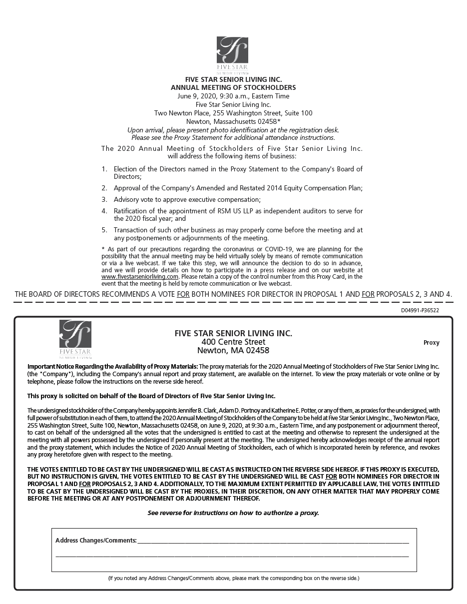 FIVE STAR SENIOR LIVING INC. ANNUAL MEETING OF STOCKHOLDERS June 9, 2020, 9:30 a.m., Eastern Time Five Star Senior Living Inc. Two Newton Place, 255 Washington Street, Suite 100 Newton, Massachusetts 02458* Upon arrival, please present photo identification at the registration desk. Please see the Proxy Statement for additional attendance instructions. The 2020 Annual Meeting of Stockholders of Five Star Senior Living Inc. will address the following items of business: 1. Election of the Directors named in the Proxy Statement to the Company's Board of Directors; Approval of the Company's Amended and Restated 2014 Equity Compensation Plan; Advisory vote to approve executive compensation; Ratification of the appointment of RSM US LLP as independent auditors to serve for the 2020 fiscal year; and Transaction of such other business as may properly come before the meeting and at any postponements or adjournments of the meeting. 2. 3. 4. 5. * As part of our precautions regarding the coronavirus or COVID-19, we are planning for the possibility that the annual meeting may be held virtually solely by means of remote communication or via a live webcast. If we take this step, we will announce the decision to do so in advance, and we will provide details on how to participate in a press release and on our website at www.fivestarseniorliving.com. Please retain a copy of the control number from this Proxy Card, in the event that the meeting is held by remote communication or live webcast. THE BOARD OF DIRECTORS RECOMMENDS A VOTE FOR BOTH NOMINEES FOR DIRECTOR IN PROPOSAL 1 AND FOR PROPOSALS 2, 3 AND 4. D04991-P36522 FIVE STAR SENIOR LIVING INC. 400 Centre Street Newton, MA 02458 Proxy Important Notice Regarding the Availability of Proxy Materials: The proxy materials for the 2020 Annual Meeting of Stockholders of Five Star Senior Living Inc. (the "Company"), including the Company's annual report and proxy statement, are available on the internet. To view the proxy materials or vote online or by telephone, please follow the instructions on the reverse side hereof. This proxy is solicited on behalf of the Board of Directors of Five Star Senior Living Inc. The undersigned stockholder of the Company hereby appoints Jennifer B. Clark, Adam D. Portnoy and Katherine E. Potter, or any of them, as proxies for the undersigned, with full power of substitution in each of them, to attend the 2020 Annual Meeting of Stockholders of the Company to be held at Five Star Senior Living Inc., Two Newton Place, 255 Washington Street, Suite 100, Newton, Massachusetts 02458, on June 9, 2020, at 9:30 a.m., Eastern Time, and any postponement or adjournment thereof, to cast on behalf of the undersigned all the votes that the undersigned is entitled to cast at the meeting and otherwise to represent the undersigned at the meeting with all powers possessed by the undersigned if personally present at the meeting. The undersigned hereby acknowledges receipt of the annual report and the proxy statement, which includes the Notice of 2020 Annual Meeting of Stockholders, each of which is incorporated herein by reference, and revokes any proxy heretofore given with respect to the meeting. THE VOTES ENTITLED TO BE CAST BY THE UNDERSIGNED WILL BE CAST AS INSTRUCTED ON THE REVERSE SIDE HEREOF. IF THIS PROXY IS EXECUTED, BUT NO INSTRUCTION IS GIVEN, THE VOTES ENTITLED TO BE CAST BY THE UNDERSIGNED WILL BE CAST FOR BOTH NOMINEES FOR DIRECTOR IN PROPOSAL 1 AND FOR PROPOSALS 2, 3 AND 4. ADDITIONALLY, TO THE MAXIMUM EXTENT PERMITTED BY APPLICABLE LAW, THE VOTES ENTITLED TO BE CAST BY THE UNDERSIGNED WILL BE CAST BY THE PROXIES, IN THEIR DISCRETION, ON ANY OTHER MATTER THAT MAY PROPERLY COME BEFORE THE MEETING OR AT ANY POSTPONEMENT OR ADJOURNMENT THEREOF. See reverse for instructions on how to authorize a proxy. (If you noted any Address Changes/Comments above, please mark the corresponding box on the reverse side.) Address Changes/Comments:
