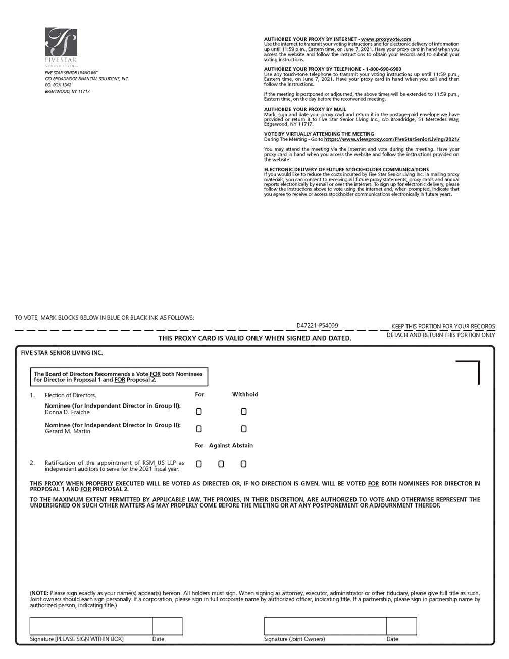 AUTHORIZE YOUR PROXY BY INTERNET - www.proxyvote.com Use the internet to transmit your voting instructions and for electronic delivery of information up until 11:59 p.m., Eastern time, on June 7, 2021. Have your proxy card in hand when you access the website and follow the instructions to obtain your records and to submit your voting instructions. AUTHORIZE YOUR PROXY BY TELEPHONE - 1-800-690-6903 FIVE STAR SENIOR LIVING INC. C/O BROADRIDGE FINANCIAL SOLUTIONS, INC. P.O. BOX 1342 BRENTWOOD, NY 11717 Use any touch-tone telephone to transmit your voting instructions up until 11:59 p.m., Eastern time, on June 7, 2021. Have your proxy card in hand when you call and then follow the instructions. If the meeting is postponed or adjourned, the above times will be extended to 11:59 p.m., Eastern time, on the day before the reconvened meeting. AUTHORIZE YOUR PROXY BY MAIL Mark, sign and date your proxy card and return it in the postage-paid envelope we have provided or return it to Five Star Senior Living Inc., c/o Broadridge, 51 Mercedes Way, Edgewood, NY 11717. VOTE BY VIRTUALLY ATTENDING THE MEETING During The Meeting - Go to https://www.viewproxy.com/FiveStarSeniorLiving/2021/ You may attend the meeting via the Internet and vote during the meeting. Have your proxy card in hand when you access the website and follow the instructions provided on the website. ELECTRONIC DELIVERY OF FUTURE STOCKHOLDER COMMUNICATIONS If you would like to reduce the costs incurred by Five Star Senior Living Inc. in mailing proxy materials, you can consent to receiving all future proxy statements, proxy cards and annual reports electronically by email or over the internet. To sign up for electronic delivery, please follow the instructions above to vote using the internet and, when prompted, indicate that you agree to receive or access stockholder communications electronically in future years. TO VOTE, MARK BLOCKS BELOW IN BLUE OR BLACK INK AS FOLLOWS: D47221-P54099 KEEP THIS PORTION FOR YOUR RECORDS DETACH AND RETURN THIS PORTION ONLY THIS PROXY CARD IS VALID ONLY WHEN SIGNED AND DATED. FIVE STAR SENIOR LIVING INC. For Withhold 1. Election of Directors. Nominee (for Independent Director in Group II): Donna D. Fraiche ! ! For ! ! Against Abstain Nominee (for Independent Director in Group II): Gerard M. Martin ! ! ! 2. Ratification of the appointment of RSM US LLP as independent auditors to serve for the 2021 fiscal year. THIS PROXY WHEN PROPERLY EXECUTED WILL BE VOTED AS DIRECTED OR, IF NO DIRECTION IS GIVEN, WILL BE VOTED FOR BOTH NOMINEES FOR DIRECTOR IN PROPOSAL 1 AND FOR PROPOSAL 2. TO THE MAXIMUM EXTENT PERMITTED BY APPLICABLE LAW, THE PROXIES, IN THEIR DISCRETION, ARE AUTHORIZED TO VOTE AND OTHERWISE REPRESENT THE UNDERSIGNED ON SUCH OTHER MATTERS AS MAY PROPERLY COME BEFORE THE MEETING OR AT ANY POSTPONEMENT OR ADJOURNMENT THEREOF. (NOTE: Please sign exactly as your name(s) appear(s) hereon. All holders must sign. When signing as attorney, executor, administrator or other fiduciary, please give full title as such. Joint owners should each sign personally. If a corporation, please sign in full corporate name by authorized officer, indicating title. If a partnership, please sign in partnership name by authorized person, indicating title.) Signature [PLEASE SIGN WITHIN BOX] Date Signature (Joint Owners) Date The Board of Directors Recommends a Vote FOR both Nominees for Director in Proposal 1 and FOR Proposal 2.