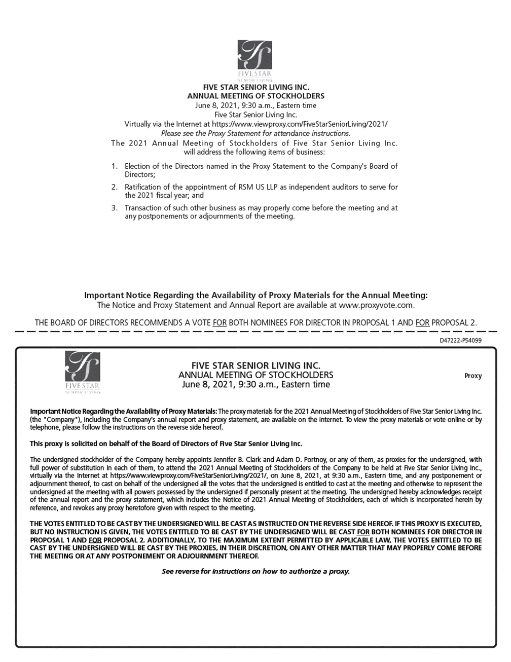 FIVE STAR SENIOR LIVING INC. ANNUAL MEETING OF STOCKHOLDERS June 8, 2021, 9:30 a.m., Eastern time Five Star Senior Living Inc. Virtually via the Internet at https://www.viewproxy.com/FiveStarSeniorLiving/2021/ Please see the Proxy Statement for attendance instructions. The 2021 Annual Meeting of Stockholders of Five Star Senior Living Inc. will address the following items of business: 1. Election of the Directors named in the Proxy Statement to the Company's Board of Directors; Ratification of the appointment of RSM US LLP as independent auditors to serve for the 2021 fiscal year; and Transaction of such other business as may properly come before the meeting and at any postponements or adjournments of the meeting. 2. 3. Important Notice Regarding the Availability of Proxy Materials for the Annual Meeting: The Notice and Proxy Statement and Annual Report are available at www.proxyvote.com. THE BOARD OF DIRECTORS RECOMMENDS A VOTE FOR BOTH NOMINEES FOR DIRECTOR IN PROPOSAL 1 AND FOR PROPOSAL 2. D47222-P54099 FIVE STAR SENIOR LIVING INC. ANNUAL MEETING OF STOCKHOLDERS June 8, 2021, 9:30 a.m., Eastern time Proxy Important Notice Regarding the Availability of Proxy Materials: The proxy materials for the 2021 Annual Meeting of Stockholders of Five Star Senior Living Inc. (the "Company"), including the Company's annual report and proxy statement, are available on the internet. To view the proxy materials or vote online or by telephone, please follow the instructions on the reverse side hereof. This proxy is solicited on behalf of the Board of Directors of Five Star Senior Living Inc. The undersigned stockholder of the Company hereby appoints Jennifer B. Clark and Adam D. Portnoy, or any of them, as proxies for the undersigned, with full power of substitution in each of them, to attend the 2021 Annual Meeting of Stockholders of the Company to be held at Five Star Senior Living Inc., virtually via the Internet at https://www.viewproxy.com/FiveStarSeniorLiving/2021/, on June 8, 2021, at 9:30 a.m., Eastern time, and any postponement or adjournment thereof, to cast on behalf of the undersigned all the votes that the undersigned is entitled to cast at the meeting and otherwise to represent the undersigned at the meeting with all powers possessed by the undersigned if personally present at the meeting. The undersigned hereby acknowledges receipt of the annual report and the proxy statement, which includes the Notice of 2021 Annual Meeting of Stockholders, each of which is incorporated herein by reference, and revokes any proxy heretofore given with respect to the meeting. THE VOTES ENTITLED TO BE CAST BY THE UNDERSIGNED WILL BE CAST AS INSTRUCTED ON THE REVERSE SIDE HEREOF. IF THIS PROXY IS EXECUTED, BUT NO INSTRUCTION IS GIVEN, THE VOTES ENTITLED TO BE CAST BY THE UNDERSIGNED WILL BE CAST FOR BOTH NOMINEES FOR DIRECTOR IN PROPOSAL 1 AND FOR PROPOSAL 2. ADDITIONALLY, TO THE MAXIMUM EXTENT PERMITTED BY APPLICABLE LAW, THE VOTES ENTITLED TO BE CAST BY THE UNDERSIGNED WILL BE CAST BY THE PROXIES, IN THEIR DISCRETION, ON ANY OTHER MATTER THAT MAY PROPERLY COME BEFORE THE MEETING OR AT ANY POSTPONEMENT OR ADJOURNMENT THEREOF. See reverse for instructions on how to authorize a proxy.