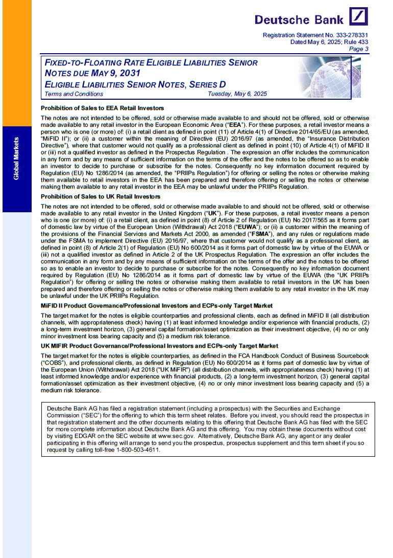 Registration Statement No. 333 - 278331 Dated May 6, 2025; Rule 433 Page 3 F IXED - TO - F LOATING R ATE E LIGIBLE L IABILITIES S ENIOR N OTES DUE M AY 9, 2031 E LIGIBLE L IABILITIES S ENIOR N OTES , S ERIES D Terms and Conditions Tuesday, May 6, 2025 Global Markets Prohibition of Sales to EEA Retail Investors The notes are not intended to be offered, sold or otherwise made available to and should not be offered, sold or otherwise made available to any retail investor in the European Economic Area (“ EEA ”) . For these purposes, a retail investor means a person who is one (or more) of : (i) a retail client as defined in point ( 11 ) of Article 4 ( 1 ) of Directive 2014 / 65 /EU (as amended, “MiFID II”) ; or (ii) a customer within the meaning of Directive (EU) 2016 / 97 (as amended, the “Insurance Distribution Directive”), where that customer would not qualify as a professional client as defined in point ( 10 ) of Article 4 ( 1 ) of MiFID II or (iii) not a qualified investor as defined in the Prospectus Regulation . The expression an offer includes the communication in any form and by any means of sufficient information on the terms of the offer and the notes to be offered so as to enable an investor to decide to purchase or subscribe for the notes . Consequently no key information document required by Regulation (EU) No 1286 / 2014 (as amended, the “PRIIPs Regulation”) for offering or selling the notes or otherwise making them available to retail investors in the EEA has been prepared and therefore offering or selling the notes or otherwise making them available to any retail investor in the EEA may be unlawful under the PRIIPs Regulation . Prohibition of Sales to UK Retail Investors The notes are not intended to be offered, sold or otherwise made available to and should not be offered, sold or otherwise made available to any retail investor in the United Kingdom (“ UK ”) . For these purposes, a retail investor means a person who is one (or more) of : (i) a retail client, as defined in point ( 8 ) of Article 2 of Regulation (EU) No 2017 / 565 as it forms part of domestic law by virtue of the European Union (Withdrawal) Act 2018 (“ EUWA ”) ; or (ii) a customer within the meaning of the provisions of the Financial Services and Markets Act 2000 , as amended (“ FSMA ”), and any rules or regulations made under the FSMA to implement Directive (EU) 2016 / 97 , where that customer would not qualify as a professional client, as defined in point ( 8 ) of Article 2 ( 1 ) of Regulation (EU) No 600 / 2014 as it forms part of domestic law by virtue of the EUWA or (iii) not a qualified investor as defined in Article 2 of the UK Prospectus Regulation . The expression an offer includes the communication in any form and by any means of sufficient information on the terms of the offer and the notes to be offered so as to enable an investor to decide to purchase or subscribe for the notes . Consequently no key information document required by Regulation (EU) No 1286 / 2014 as it forms part of domestic law by virtue of the EUWA (the “UK PRIIPs Regulation”) for offering or selling the notes or otherwise making them available to retail investors in the UK has been prepared and therefore offering or selling the notes or otherwise making them available to any retail investor in the UK may be unlawful under the UK PRIIPs Regulation . MiFID II Product Governance/Professional Investors and ECPs - only Target Market The target market for the notes is eligible counterparties and professional clients, each as defined in MiFID II (all distribution channels, with appropriateness check) having ( 1 ) at least informed knowledge and/or experience with financial products, ( 2 ) a long - term investment horizon, ( 3 ) general capital formation/asset optimization as their investment objective, ( 4 ) no or only minor investment loss bearing capacity and ( 5 ) a medium risk tolerance . UK MIFIR Product Governance/Professional Investors and ECPs - only Target Market The target market for the notes is eligible counterparties, as defined in the FCA Handbook Conduct of Business Sourcebook (“COBS”), and professional clients, as defined in Regulation (EU) No 600 / 2014 as it forms part of domestic law by virtue of the European Union (Withdrawal) Act 2018 ("UK MiFIR") (all distribution channels, with appropriateness check) having ( 1 ) at least informed knowledge and/or experience with financial products, ( 2 ) a long - term investment horizon, ( 3 ) general capital formation/asset optimization as their investment objective, ( 4 ) no or only minor investment loss bearing capacity and ( 5 ) a medium risk tolerance . Deutsche Bank AG has filed a registration statement (including a prospectus) with the Securities and Exchange Commission (“SEC”) for the offering to which this term sheet relates. Before you invest, you should read the prospectus in that registration statement and the other documents relating to this offering that Deutsche Bank AG has filed with the SEC for more complete information about Deutsche Bank AG and this offering. You may obtain these documents without cost by visiting EDGAR on the SEC website at www.sec.gov. Alternatively, Deutsche Bank AG, any agent or any dealer participating in this offering will arrange to send you the prospectus, prospectus supplement and this term sheet if you so request by calling toll - free 1 - 800 - 503 - 4611.