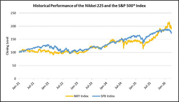 The following graph sets forth the historical performances of the Nikkei 225 Index and the S&P 500® Index from January 4, 2021 through March 27, 2026, based on the daily Closing Levels of the Underlyings. For comparison purposes, each Underlying has been normalized to have a Closing Level of 100.00 on January 4, 2021 by dividing the Closing Level of that Underlying on each day by the Closing Level of that Underlying on January 4, 2021 and multiplying by 100.00.