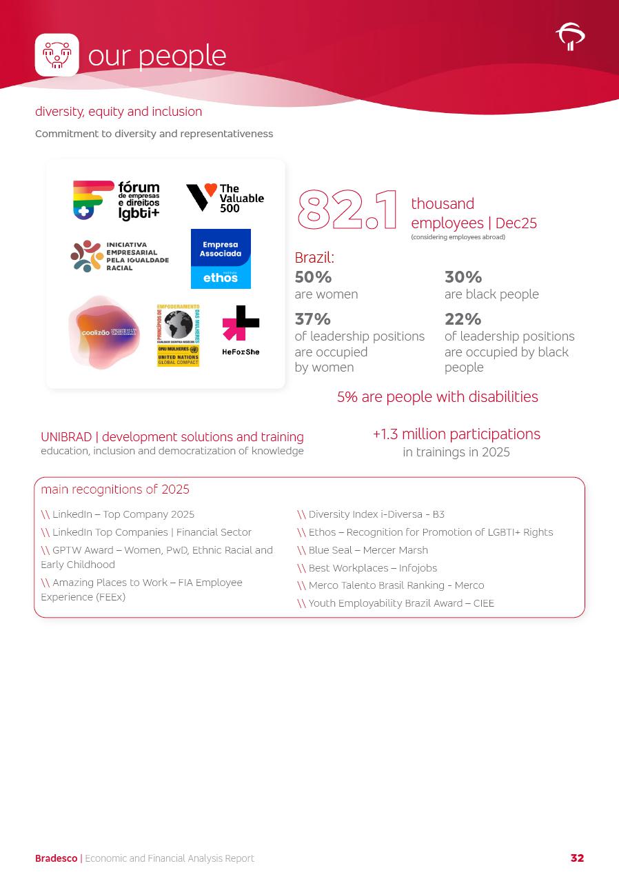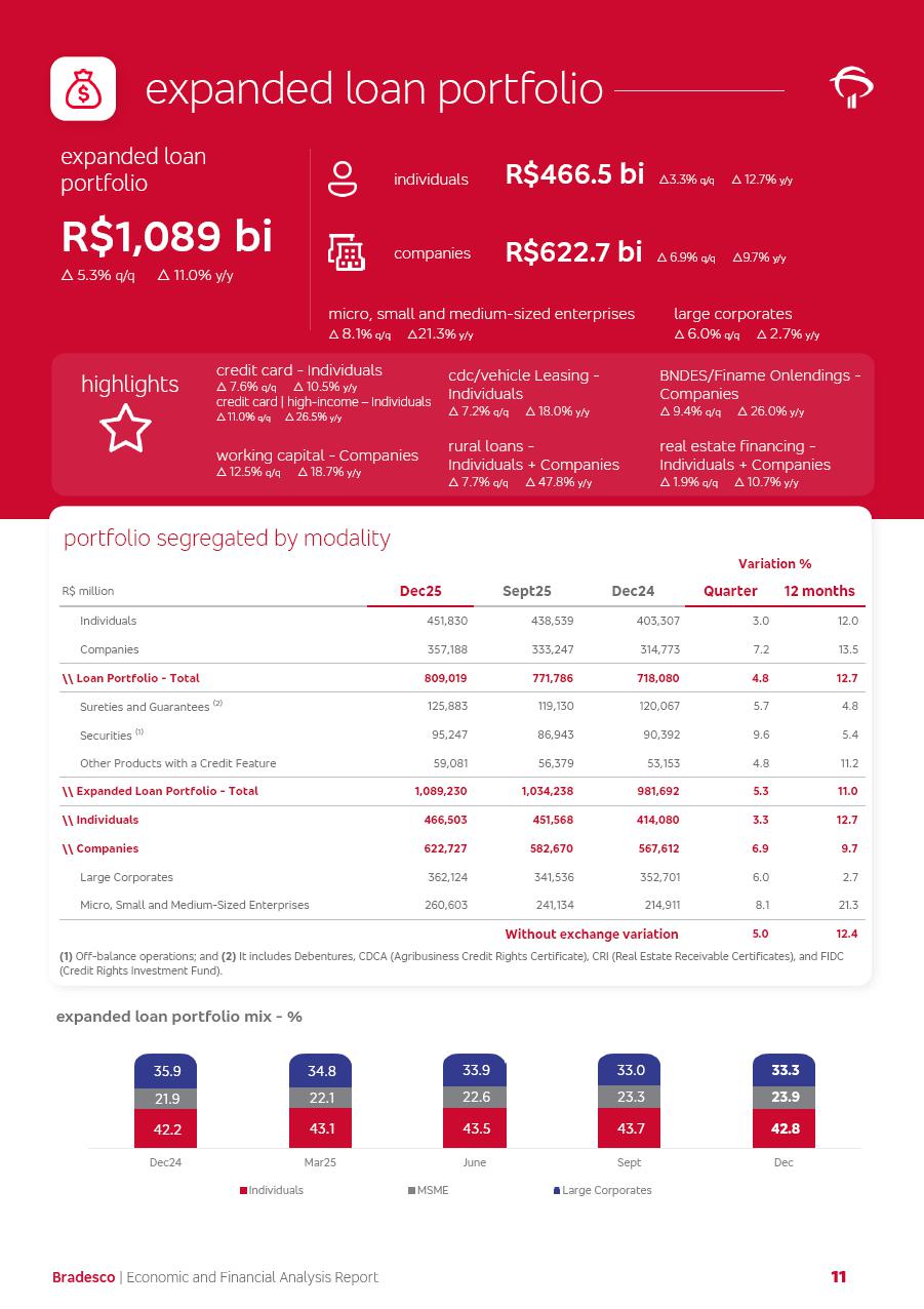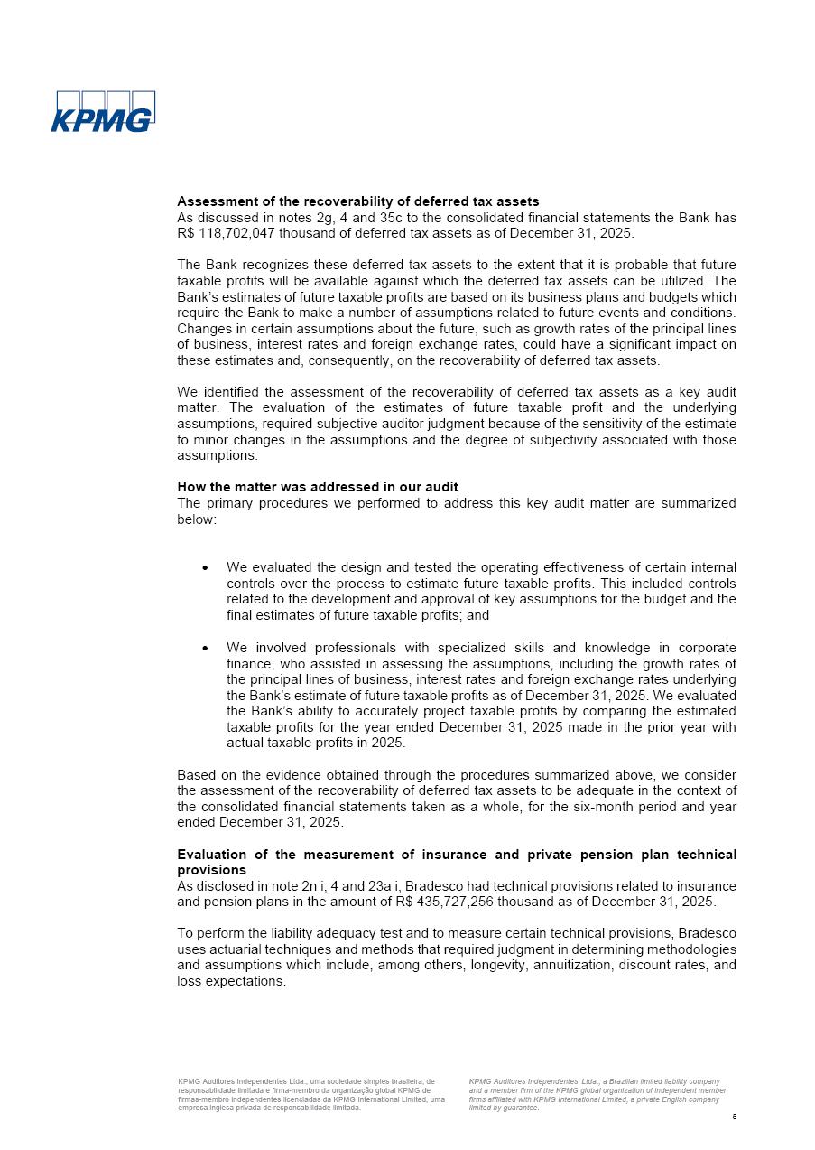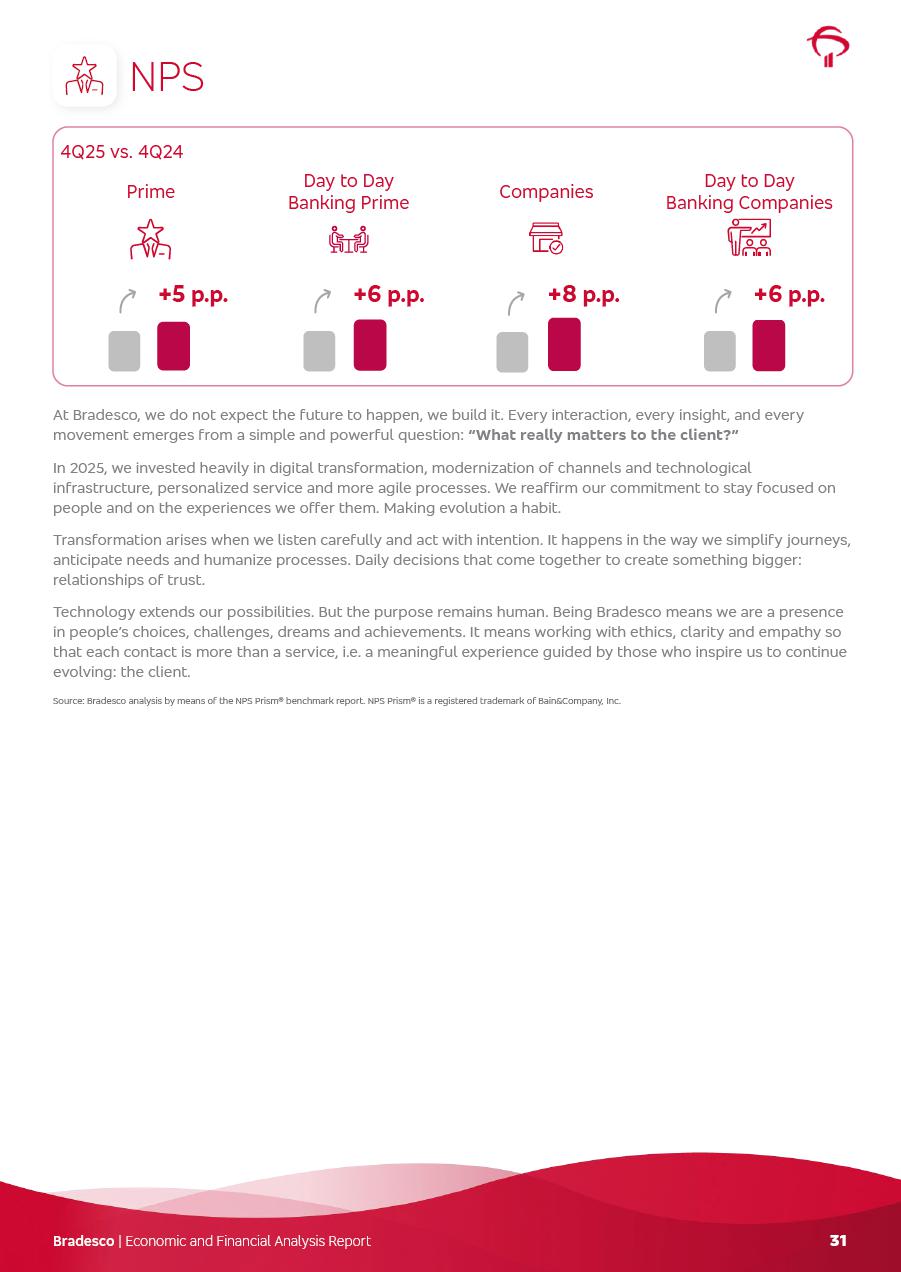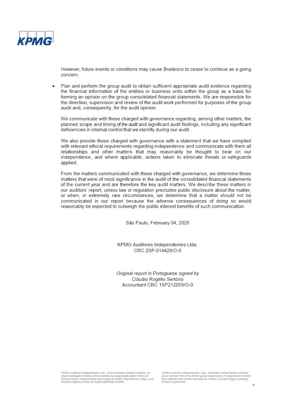 click on the items below to navigate through the document: 4Q 25 managerial analysis of results management report consolidated financial statements videoconference commenting on the results February 6th at 8:30 AM (US Eastern Time) economic and financial analysis reportBradesco | Economic and Financial Analysis Report 3 Table of Contents Managerial Analysis of Results 5 press release 6 highlights 4Q25 7 recurring net income statement 8 net interest income 9 funding sources 10 loan portfolio 11 expenses with expanded loan loss provisions 16 loan indicators 17 fee and commission income 19 operating expenses 21 Bradesco Seguros 22 basel 27 guidance, indicators & economic perspectives 28 Additional Information 29 corporate strategy | customer-centric 30 NPS 31 our people 32 sustainability 33 digital in figures | BIA 34 Bradesco Principal 35 Bradesco Expresso 36 international operations | My Account 37 Bradesco Bank 38 Ágora Investimentos 39 Digio 40 service points, clients and market share 41 return to shareholders 42 additional information 43 selected information 45 consolidated balance sheet – Bradesco 46 consolidated balance sheet – Insurance 47 statement of income – managerial vs. recurring | BRGAAP vs. IFRS comparative 48 Independent Auditor’s Report 49 Consolidated Financial Statements 53 Bradesco | Economic and Financial Analysis Report 4 Some numbers included in this Report have been subjected to rounding adjustments. As a result, some amounts indicated as total amounts in some charts may not be the arithmetic sum of the preceding numbers. Percentage variations not presented in the framework of this report, are related, in their majority, to the low value balances compared with the other periods presented. As of January 2025, we adopted in our Financial Statements the new accounting practices established by CMN Resolutions No. 4,966 and No. 4,975. For management purposes, we kept the information of the previous periods as already disclosed, which do not present relevant differences in the historical analysis of the results. For some credit indicators, when mentioned, we carry out historical data for comparability purposes on a pro-forma basis. In our financial statements the Organization opted for the exemption provided by the Standard not to resubmit comparative information from previous periods resulting from the changes. Managerial Analysis of Results Bradesco | Economic and Financial Analysis Report 6 press release Bradesco remains committed to expand profitability gradually and safely through the accelerated execution of the transformation plan. Our priority is to ensure the sustainability of the business by growing responsibly, keeping the cost of credit under control, investing in the transformation of the Organization, and reinforcing a customer centric approach in all decisions. In 2025, our commercial traction was reflected in impressive revenue growth across all of our core product lines. We maintained our risk appetite, new credit vintages with high quality and delinquency ratios under control. As a result, in 4Q25 we reported a Return on Equity (ROE) higher than our cost of capital, with eight straight quarters of profitability growth. Investments in our transformation have placed temporary pressure on expenses, but they are intended to boost our competitiveness in the short, medium and long term. The integration between "change the bank" and "run the bank" is intensifying, as the benefits of transformation continue to enhance operational performance and make it more sustainable. Net income was R$6.5 billion in 4Q25, resulting in ROAE of 15.2%, generating a profit of R$24.7 billion in 2025 and growth of 26.1% in 2025 vs. 2024. Total revenues topped R$36.1 billion for the quarter, growing 2.9% q/q and 9.8% y/y, driven by the performance of the net interest income and fee and commission income. Net interest income came to R$19.2 billion for the quarter, expanding 2.9% q/q and 13.2% y/y. Client NII reached R$19.1 billion, rising 2.7% q/q and 18.4% y/y, mainly due to the effect of the increase in the loan portfolio and efficiency on the funding margin. Market NII totaled R$126 million in 4Q25, in line with expectations, bringing the full-year figure to R$975 million. The expanded loan portfolio came to R$1.089 trillion, growing 11.0% y/y and 5.3% q/q in December 2025, reflecting our traction in the MSME and Individuals segments, and operations with Large Companies carried out at the end of the year. In December 2025, the delinquency ratio (over 90 days NPL) remained stable. Problem assets in the restructured portfolio fell by R$2.4 billion versus the prior quarter and R$10.5 billion in the annual comparison, while cured assets rose 10.7% q/q and 58.2% y/y. Consequently, stage 3 operations declined throughout 2025, with a 40 bps reduction in the last quarter. The cost of credit retreated slightly from 3.3% in 3Q25 to 3.2% in 4Q25, reflecting the quality of the concession and growth of the loan portfolio over the period. Fee and commission income performed strongly, growing 4.6% q/q and 8.0% y/y. The positive standouts over the quarter included capital market, card income and loan operations. The operational performance from insurance operations generated an income of R$5.6 billion (-1.0% q/q and +2.1% y/y) and net income of R$2.8 billion (10.7% q/q and 10.6% y/y). The ROAE of the insurance company was 24.3% in 4Q25. In 2025, the insurance earnings came to R$10.1 billion. Our efficiency ratio (expenses/revenues) improved by 2.2 p.p. over the year, attributed to a 13.2% increase in revenues and sound management of expenses. In 2025, operating expenses rose by 8.5% while administrative and personnel expenses saw a 5.0% bump, which includes the impact of the collective bargaining agreement of 5.68% and increase in profit-sharing expenditures. Temporary pressures seen throughout the year came mainly from our transformation initiatives and a strategic strengthening of the 