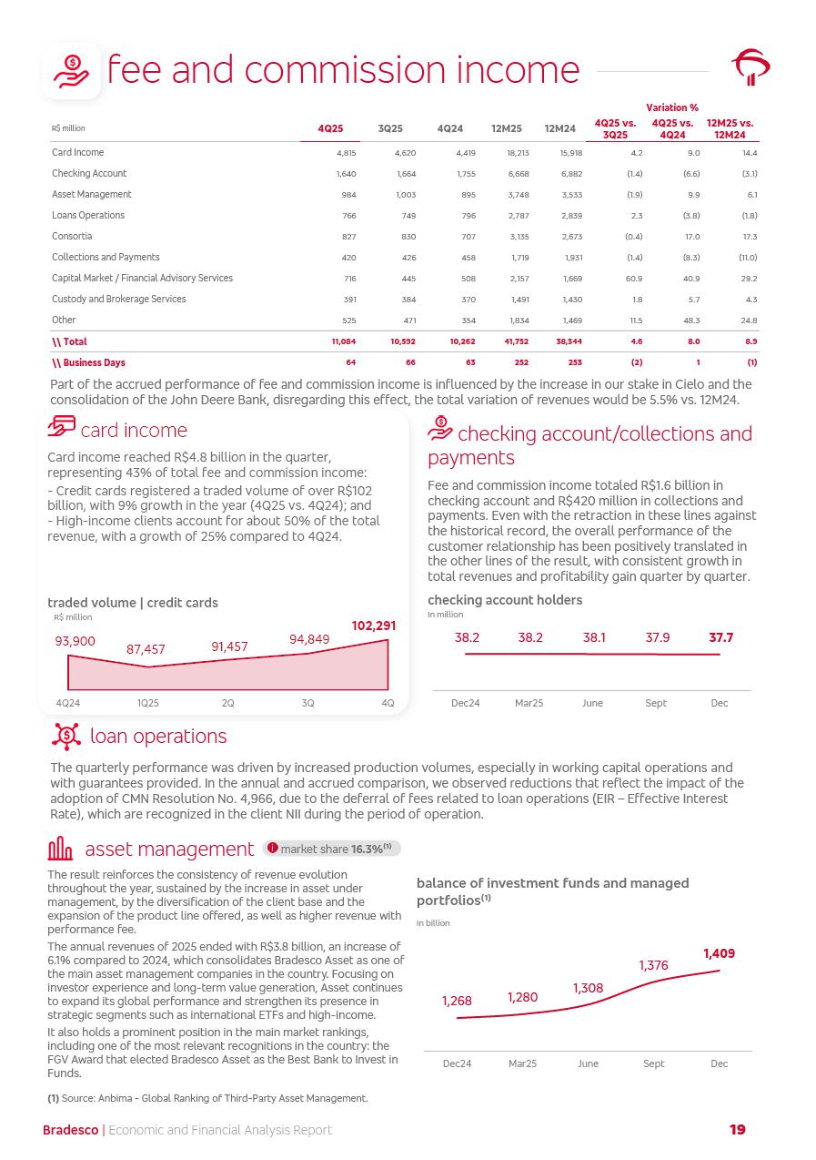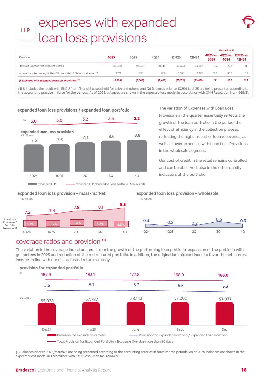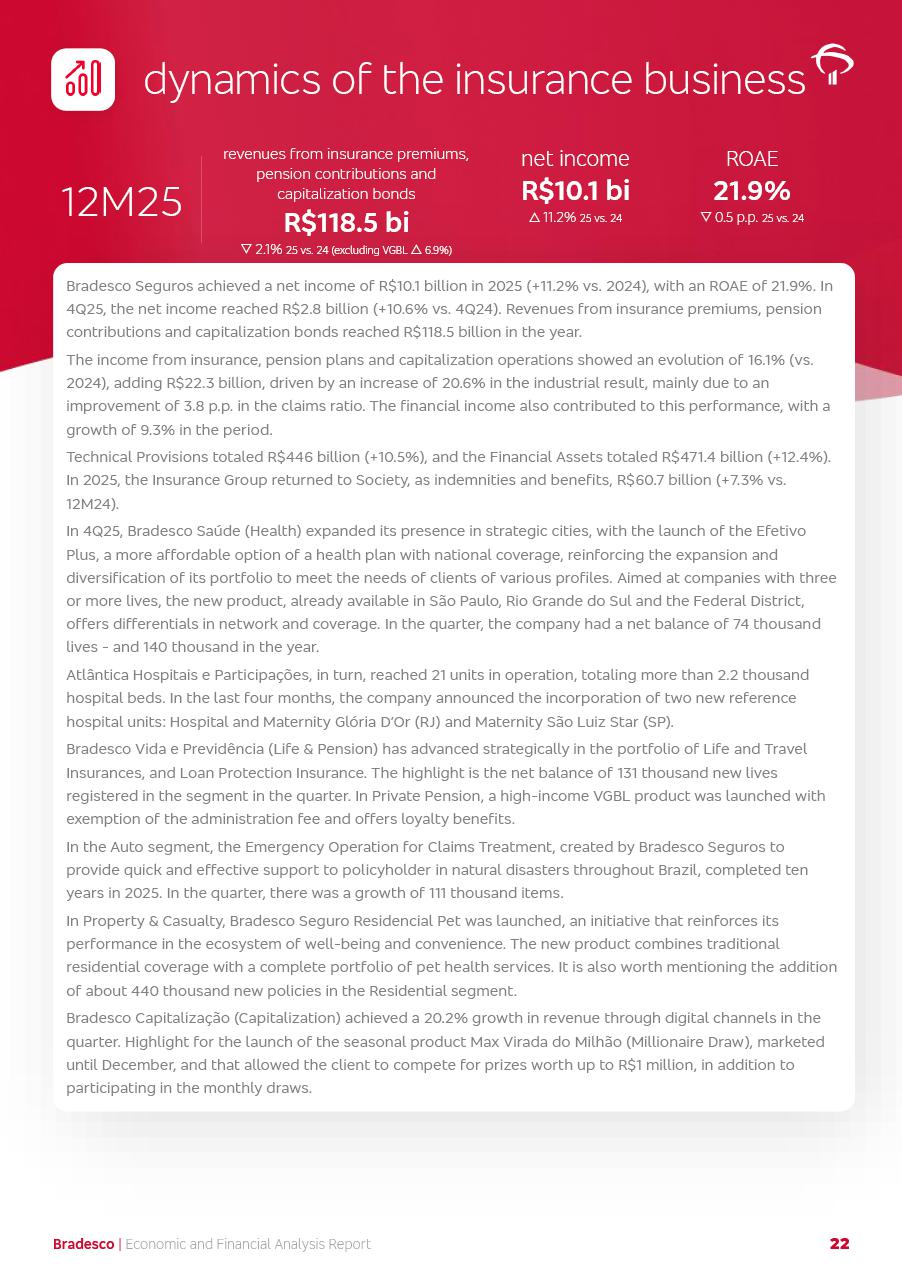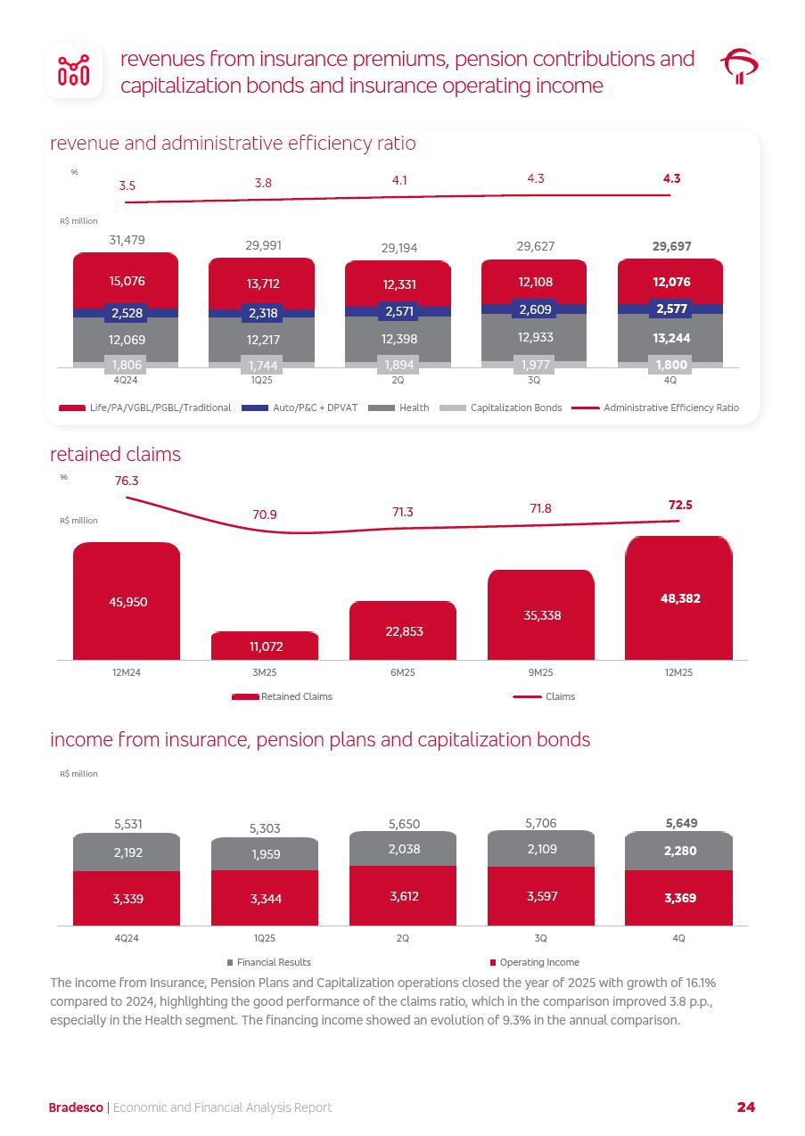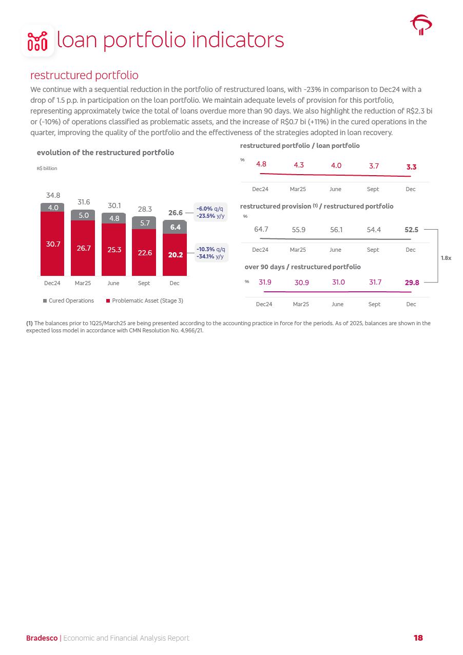 click on the items below to navigate through the document: 4Q 25 managerial analysis of results management report consolidated financial statements videoconference commenting on the results February 6th at 8:30 AM (US Eastern Time) economic and financial analysis reportBradesco | Economic and Financial Analysis Report 3 Table of Contents Managerial Analysis of Results 5 press release 6 highlights 4Q25 7 recurring net income statement 8 net interest income 9 funding sources 10 loan portfolio 11 expenses with expanded loan loss provisions 16 loan indicators 17 fee and commission income 19 operating expenses 21 Bradesco Seguros 22 basel 27 guidance, indicators & economic perspectives 28 Additional Information 29 corporate strategy | customer-centric 30 NPS 31 our people 32 sustainability 33 digital in figures | BIA 34 Bradesco Principal 35 Bradesco Expresso 36 international operations | My Account 37 Bradesco Bank 38 Ágora Investimentos 39 Digio 40 service points, clients and market share 41 return to shareholders 42 additional information 43 selected information 45 consolidated balance sheet – Bradesco 46 consolidated balance sheet – Insurance 47 statement of income – managerial vs. recurring | BRGAAP vs. IFRS comparative 48 Independent Auditor’s Report 49 Consolidated Financial Statements 53 Bradesco | Economic and Financial Analysis Report 4 Some numbers included in this Report have been subjected to rounding adjustments. As a result, some amounts indicated as total amounts in some charts may not be the arithmetic sum of the preceding numbers. Percentage variations not presented in the framework of this report, are related, in their majority, to the low value balances compared with the other periods presented. As of January 2025, we adopted in our Financial Statements the new accounting practices established by CMN Resolutions No. 4,966 and No. 4,975. For management purposes, we kept the information of the previous periods as already disclosed, which do not present relevant differences in the historical analysis of the results. For some credit indicators, when mentioned, we carry out historical data for comparability purposes on a pro-forma basis. In our financial statements the Organization opted for the exemption provided by the Standard not to resubmit comparative information from previous periods resulting from the changes. Managerial Analysis of Results Bradesco | Economic and Financial Analysis Report 6 press release Bradesco remains committed to expand profitability gradually and safely through the accelerated execution of the transformation plan. Our priority is to ensure the sustainability of the business by growing responsibly, keeping the cost of credit under control, investing in the transformation of the Organization, and reinforcing a customer centric approach in all decisions. In 2025, our commercial traction was reflected in impressive revenue growth across all of our core product lines. We maintained our risk appetite, new credit vintages with high quality and delinquency ratios under control. As a result, in 4Q25 we reported a Return on Equity (ROE) higher than our cost of capital, with eight straight quarters of profitability growth. Investments in our transformation have placed temporary pressure on expenses, but they are intended to boost our competitiveness in the short, medium and long term. The integration between "change the bank" and "run the bank" is intensifying, as the benefits of transformation continue to enhance operational performance and make it more sustainable. Net income was R$6.5 billion in 4Q25, resulting in ROAE of 15.2%, generating a profit of R$24.7 billion in 2025 and growth of 26.1% in 2025 vs. 2024. Total revenues topped R$36.1 billion for the quarter, growing 2.9% q/q and 9.8% y/y, driven by the performance of the net interest income and fee and commission income. Net interest income came to R$19.2 billion for the quarter, expanding 2.9% q/q and 13.2% y/y. Client NII reached R$19.1 billion, rising 2.7% q/q and 18.4% y/y, mainly due to the effect of the increase in the loan portfolio and efficiency on the funding margin. Market NII totaled R$126 million in 4Q25, in line with expectations, bringing the full-year figure to R$975 million. The expanded loan portfolio came to R$1.089 trillion, growing 11.0% y/y and 5.3% q/q in December 2025, reflecting our traction in the MSME and Individuals segments, and operations with Large Companies carried out at the end of the year. In December 2025, the delinquency ratio (over 90 days NPL) remained stable. Problem assets in the restructured portfolio fell by R$2.4 billion versus the prior quarter and R$10.5 billion in the annual comparison, while cured assets rose 10.7% q/q and 58.2% y/y. Consequently, stage 3 operations declined throughout 2025, with a 40 bps reduction in the last quarter. The cost of credit retreated slightly from 3.3% in 3Q25 to 3.2% in 4Q25, reflecting the quality of the concession and growth of the loan portfolio over the period. Fee and commission income performed strongly, growing 4.6% q/q and 8.0% y/y. The positive standouts over the quarter included capital market, card income and loan operations. The operational performance from insurance operations generated an income of R$5.6 billion (-1.0% q/q and +2.1% y/y) and net income of R$2.8 billion (10.7% q/q and 10.6% y/y). The ROAE of the insurance company was 24.3% in 4Q25. In 2025, the insurance earnings came to R$10.1 billion. Our efficiency ratio (expenses/revenues) improved by 2.2 p.p. over the year, attributed to a 13.2% increase in revenues and sound management of expenses. In 2025, operating expenses rose by 8.5% while administrative and personnel expenses saw a 5.0% bump, which includes the impact of the collective bargaining agreement of 5.68% and increase in profit-sharing expenditures. Temporary pressures seen throughout the year came mainly from our transformation initiatives and a strategic strengthening of the 