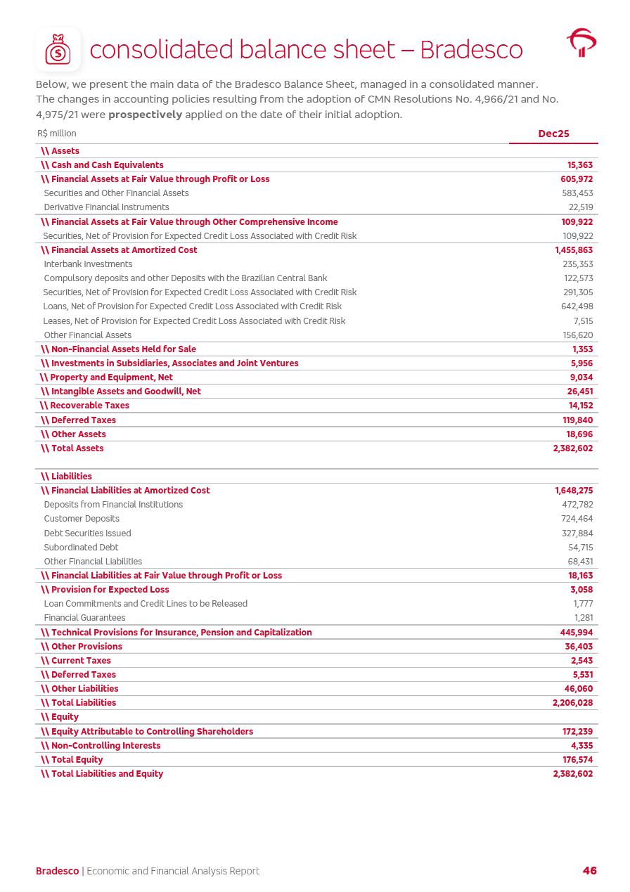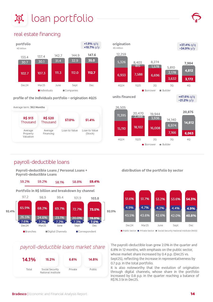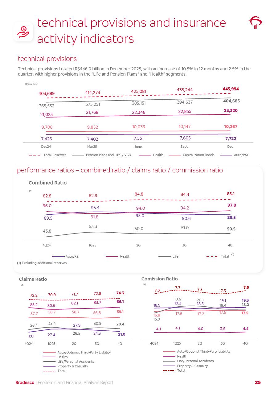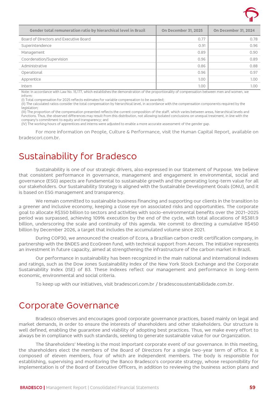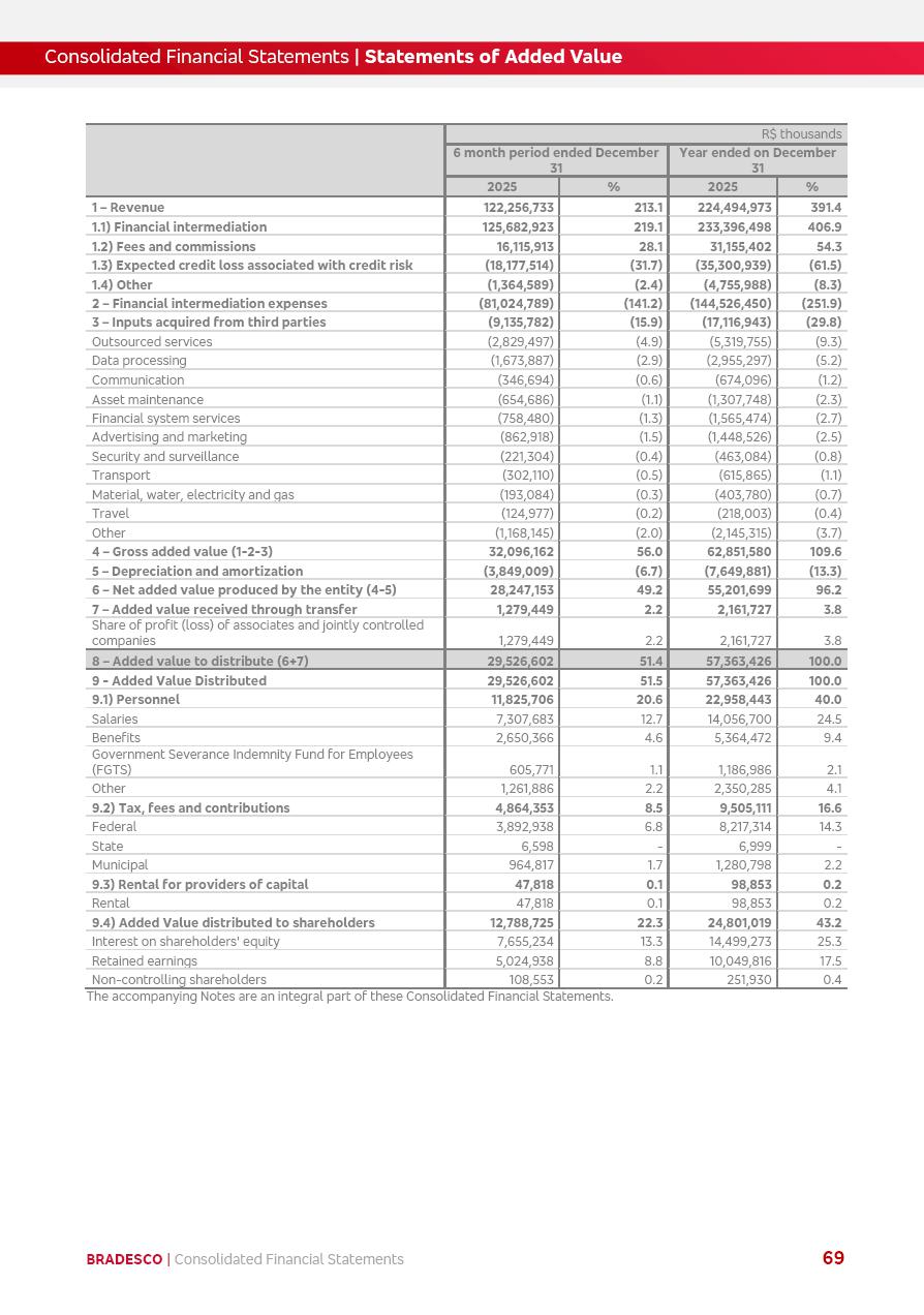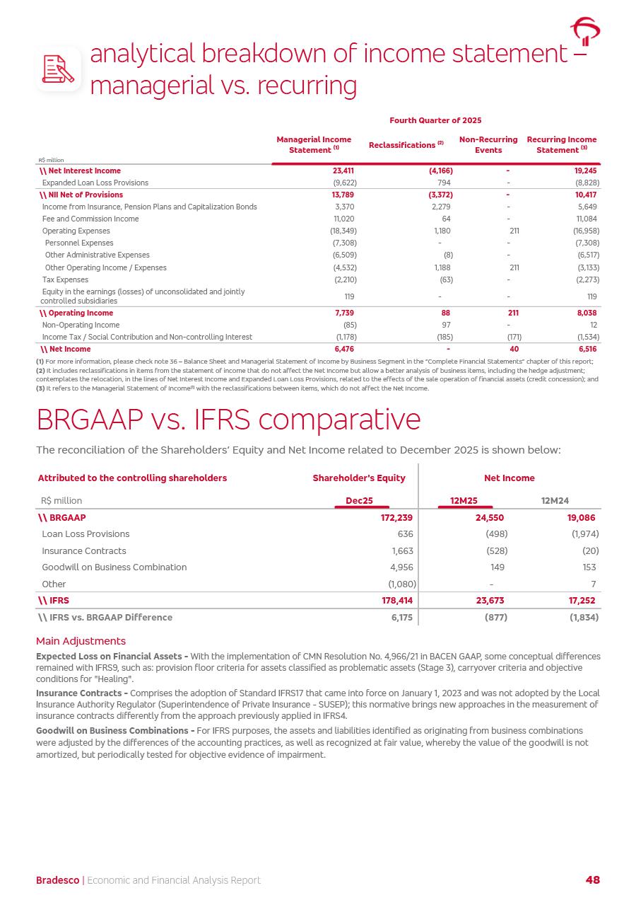 click on the items below to navigate through the document: 4Q 25 managerial analysis of results management report consolidated financial statements videoconference commenting on the results February 6th at 8:30 AM (US Eastern Time) economic and financial analysis reportBradesco | Economic and Financial Analysis Report 3 Table of Contents Managerial Analysis of Results 5 press release 6 highlights 4Q25 7 recurring net income statement 8 net interest income 9 funding sources 10 loan portfolio 11 expenses with expanded loan loss provisions 16 loan indicators 17 fee and commission income 19 operating expenses 21 Bradesco Seguros 22 basel 27 guidance, indicators & economic perspectives 28 Additional Information 29 corporate strategy | customer-centric 30 NPS 31 our people 32 sustainability 33 digital in figures | BIA 34 Bradesco Principal 35 Bradesco Expresso 36 international operations | My Account 37 Bradesco Bank 38 Ágora Investimentos 39 Digio 40 service points, clients and market share 41 return to shareholders 42 additional information 43 selected information 45 consolidated balance sheet – Bradesco 46 consolidated balance sheet – Insurance 47 statement of income – managerial vs. recurring | BRGAAP vs. IFRS comparative 48 Independent Auditor’s Report 49 Consolidated Financial Statements 53 Bradesco | Economic and Financial Analysis Report 4 Some numbers included in this Report have been subjected to rounding adjustments. As a result, some amounts indicated as total amounts in some charts may not be the arithmetic sum of the preceding numbers. Percentage variations not presented in the framework of this report, are related, in their majority, to the low value balances compared with the other periods presented. As of January 2025, we adopted in our Financial Statements the new accounting practices established by CMN Resolutions No. 4,966 and No. 4,975. For management purposes, we kept the information of the previous periods as already disclosed, which do not present relevant differences in the historical analysis of the results. For some credit indicators, when mentioned, we carry out historical data for comparability purposes on a pro-forma basis. In our financial statements the Organization opted for the exemption provided by the Standard not to resubmit comparative information from previous periods resulting from the changes. Managerial Analysis of Results Bradesco | Economic and Financial Analysis Report 6 press release Bradesco remains committed to expand profitability gradually and safely through the accelerated execution of the transformation plan. Our priority is to ensure the sustainability of the business by growing responsibly, keeping the cost of credit under control, investing in the transformation of the Organization, and reinforcing a customer centric approach in all decisions. In 2025, our commercial traction was reflected in impressive revenue growth across all of our core product lines. We maintained our risk appetite, new credit vintages with high quality and delinquency ratios under control. As a result, in 4Q25 we reported a Return on Equity (ROE) higher than our cost of capital, with eight straight quarters of profitability growth. Investments in our transformation have placed temporary pressure on expenses, but they are intended to boost our competitiveness in the short, medium and long term. The integration between "change the bank" and "run the bank" is intensifying, as the benefits of transformation continue to enhance operational performance and make it more sustainable. Net income was R$6.5 billion in 4Q25, resulting in ROAE of 15.2%, generating a profit of R$24.7 billion in 2025 and growth of 26.1% in 2025 vs. 2024. Total revenues topped R$36.1 billion for the quarter, growing 2.9% q/q and 9.8% y/y, driven by the performance of the net interest income and fee and commission income. Net interest income came to R$19.2 billion for the quarter, expanding 2.9% q/q and 13.2% y/y. Client NII reached R$19.1 billion, rising 2.7% q/q and 18.4% y/y, mainly due to the effect of the increase in the loan portfolio and efficiency on the funding margin. Market NII totaled R$126 million in 4Q25, in line with expectations, bringing the full-year figure to R$975 million. The expanded loan portfolio came to R$1.089 trillion, growing 11.0% y/y and 5.3% q/q in December 2025, reflecting our traction in the MSME and Individuals segments, and operations with Large Companies carried out at the end of the year. In December 2025, the delinquency ratio (over 90 days NPL) remained stable. Problem assets in the restructured portfolio fell by R$2.4 billion versus the prior quarter and R$10.5 billion in the annual comparison, while cured assets rose 10.7% q/q and 58.2% y/y. Consequently, stage 3 operations declined throughout 2025, with a 40 bps reduction in the last quarter. The cost of credit retreated slightly from 3.3% in 3Q25 to 3.2% in 4Q25, reflecting the quality of the concession and growth of the loan portfolio over the period. Fee and commission income performed strongly, growing 4.6% q/q and 8.0% y/y. The positive standouts over the quarter included capital market, card income and loan operations. The operational performance from insurance operations generated an income of R$5.6 billion (-1.0% q/q and +2.1% y/y) and net income of R$2.8 billion (10.7% q/q and 10.6% y/y). The ROAE of the insurance company was 24.3% in 4Q25. In 2025, the insurance earnings came to R$10.1 billion. Our efficiency ratio (expenses/revenues) improved by 2.2 p.p. over the year, attributed to a 13.2% increase in revenues and sound management of expenses. In 2025, operating expenses rose by 8.5% while administrative and personnel expenses saw a 5.0% bump, which includes the impact of the collective bargaining agreement of 5.68% and increase in profit-sharing expenditures. Temporary pressures seen throughout the year came mainly from our transformation initiatives and a strategic strengthening of the 