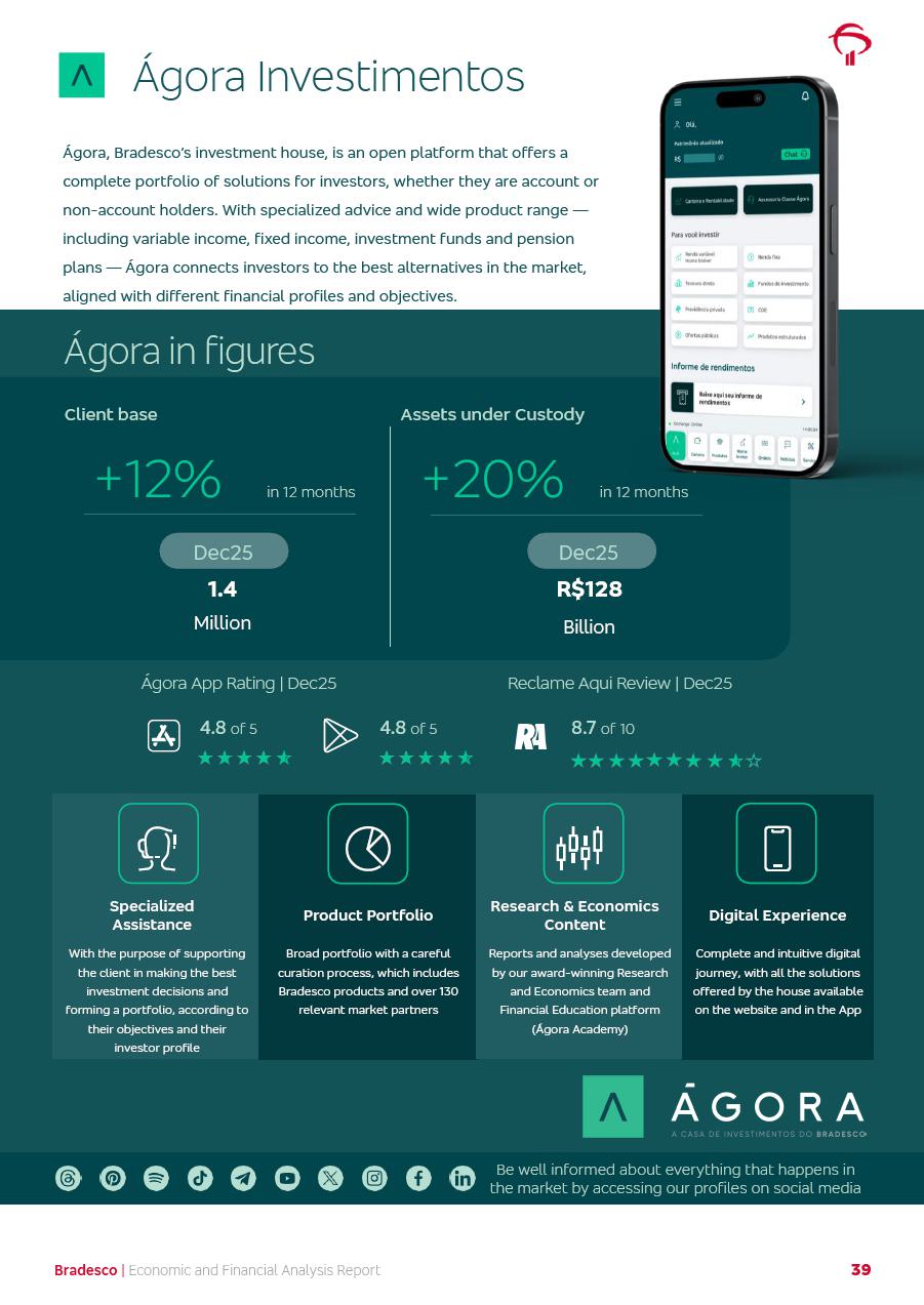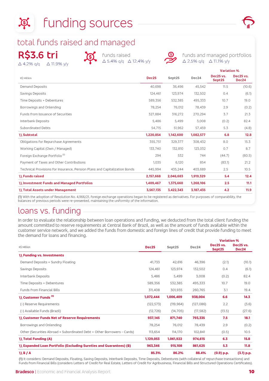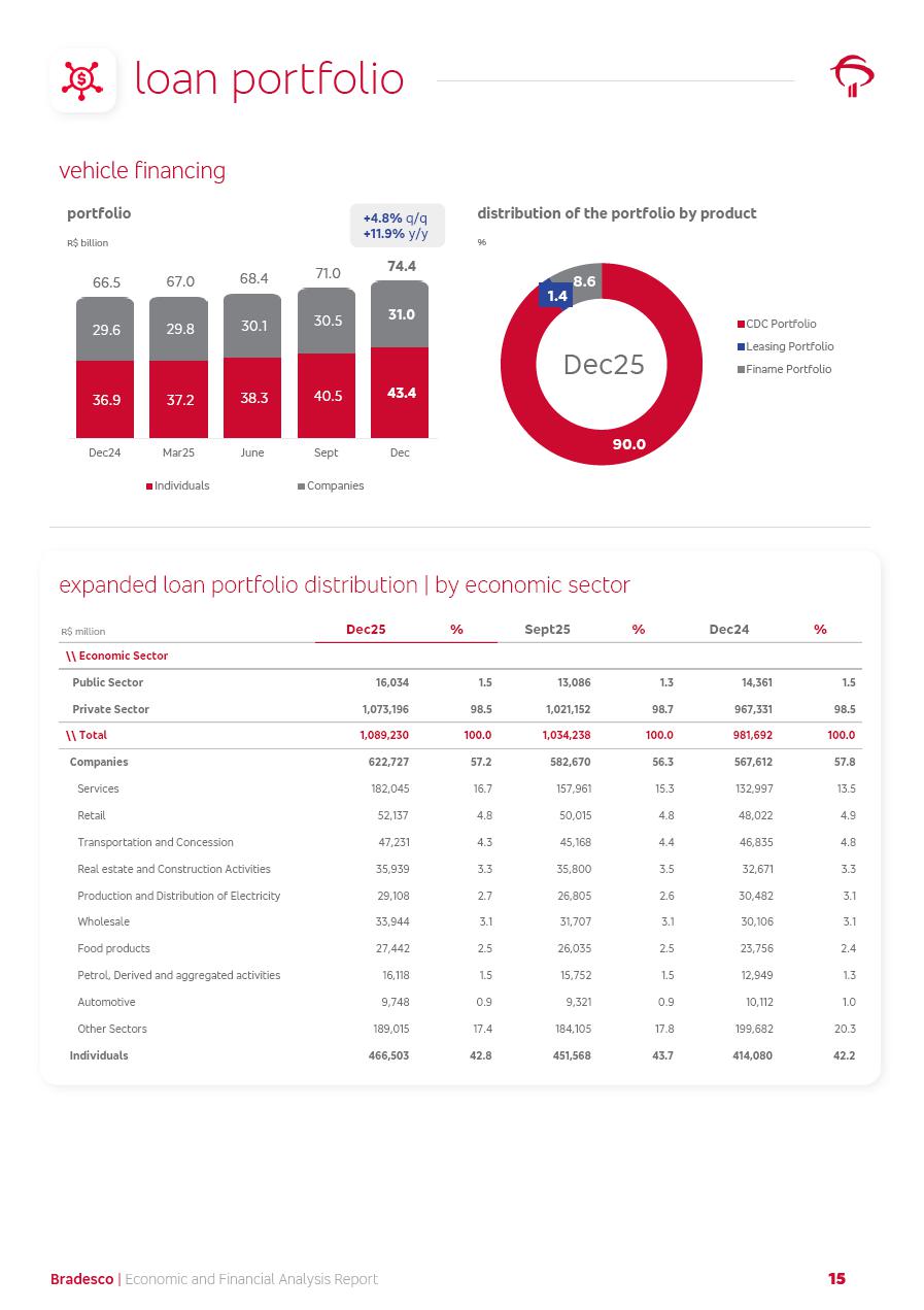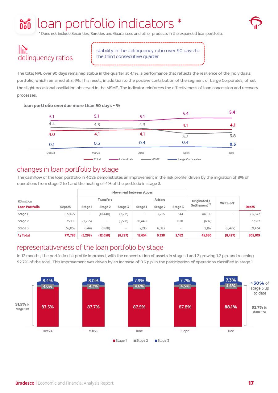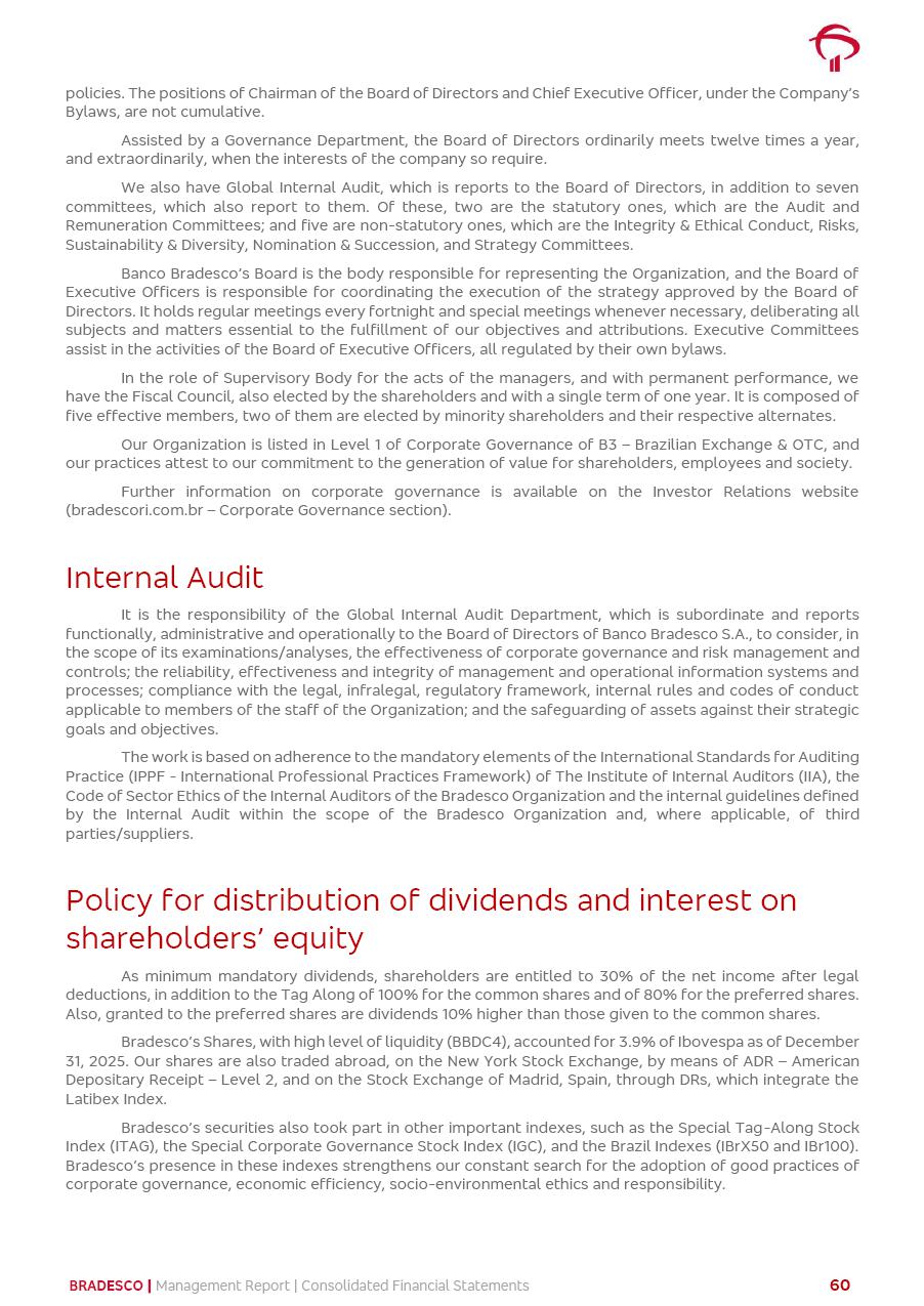 click on the items below to navigate through the document: 4Q 25 managerial analysis of results management report consolidated financial statements videoconference commenting on the results February 6th at 8:30 AM (US Eastern Time) economic and financial analysis reportBradesco | Economic and Financial Analysis Report 3 Table of Contents Managerial Analysis of Results 5 press release 6 highlights 4Q25 7 recurring net income statement 8 net interest income 9 funding sources 10 loan portfolio 11 expenses with expanded loan loss provisions 16 loan indicators 17 fee and commission income 19 operating expenses 21 Bradesco Seguros 22 basel 27 guidance, indicators & economic perspectives 28 Additional Information 29 corporate strategy | customer-centric 30 NPS 31 our people 32 sustainability 33 digital in figures | BIA 34 Bradesco Principal 35 Bradesco Expresso 36 international operations | My Account 37 Bradesco Bank 38 Ágora Investimentos 39 Digio 40 service points, clients and market share 41 return to shareholders 42 additional information 43 selected information 45 consolidated balance sheet – Bradesco 46 consolidated balance sheet – Insurance 47 statement of income – managerial vs. recurring | BRGAAP vs. IFRS comparative 48 Independent Auditor’s Report 49 Consolidated Financial Statements 53 Bradesco | Economic and Financial Analysis Report 4 Some numbers included in this Report have been subjected to rounding adjustments. As a result, some amounts indicated as total amounts in some charts may not be the arithmetic sum of the preceding numbers. Percentage variations not presented in the framework of this report, are related, in their majority, to the low value balances compared with the other periods presented. As of January 2025, we adopted in our Financial Statements the new accounting practices established by CMN Resolutions No. 4,966 and No. 4,975. For management purposes, we kept the information of the previous periods as already disclosed, which do not present relevant differences in the historical analysis of the results. For some credit indicators, when mentioned, we carry out historical data for comparability purposes on a pro-forma basis. In our financial statements the Organization opted for the exemption provided by the Standard not to resubmit comparative information from previous periods resulting from the changes. Managerial Analysis of Results Bradesco | Economic and Financial Analysis Report 6 press release Bradesco remains committed to expand profitability gradually and safely through the accelerated execution of the transformation plan. Our priority is to ensure the sustainability of the business by growing responsibly, keeping the cost of credit under control, investing in the transformation of the Organization, and reinforcing a customer centric approach in all decisions. In 2025, our commercial traction was reflected in impressive revenue growth across all of our core product lines. We maintained our risk appetite, new credit vintages with high quality and delinquency ratios under control. As a result, in 4Q25 we reported a Return on Equity (ROE) higher than our cost of capital, with eight straight quarters of profitability growth. Investments in our transformation have placed temporary pressure on expenses, but they are intended to boost our competitiveness in the short, medium and long term. The integration between "change the bank" and "run the bank" is intensifying, as the benefits of transformation continue to enhance operational performance and make it more sustainable. Net income was R$6.5 billion in 4Q25, resulting in ROAE of 15.2%, generating a profit of R$24.7 billion in 2025 and growth of 26.1% in 2025 vs. 2024. Total revenues topped R$36.1 billion for the quarter, growing 2.9% q/q and 9.8% y/y, driven by the performance of the net interest income and fee and commission income. Net interest income came to R$19.2 billion for the quarter, expanding 2.9% q/q and 13.2% y/y. Client NII reached R$19.1 billion, rising 2.7% q/q and 18.4% y/y, mainly due to the effect of the increase in the loan portfolio and efficiency on the funding margin. Market NII totaled R$126 million in 4Q25, in line with expectations, bringing the full-year figure to R$975 million. The expanded loan portfolio came to R$1.089 trillion, growing 11.0% y/y and 5.3% q/q in December 2025, reflecting our traction in the MSME and Individuals segments, and operations with Large Companies carried out at the end of the year. In December 2025, the delinquency ratio (over 90 days NPL) remained stable. Problem assets in the restructured portfolio fell by R$2.4 billion versus the prior quarter and R$10.5 billion in the annual comparison, while cured assets rose 10.7% q/q and 58.2% y/y. Consequently, stage 3 operations declined throughout 2025, with a 40 bps reduction in the last quarter. The cost of credit retreated slightly from 3.3% in 3Q25 to 3.2% in 4Q25, reflecting the quality of the concession and growth of the loan portfolio over the period. Fee and commission income performed strongly, growing 4.6% q/q and 8.0% y/y. The positive standouts over the quarter included capital market, card income and loan operations. The operational performance from insurance operations generated an income of R$5.6 billion (-1.0% q/q and +2.1% y/y) and net income of R$2.8 billion (10.7% q/q and 10.6% y/y). The ROAE of the insurance company was 24.3% in 4Q25. In 2025, the insurance earnings came to R$10.1 billion. Our efficiency ratio (expenses/revenues) improved by 2.2 p.p. over the year, attributed to a 13.2% increase in revenues and sound management of expenses. In 2025, operating expenses rose by 8.5% while administrative and personnel expenses saw a 5.0% bump, which includes the impact of the collective bargaining agreement of 5.68% and increase in profit-sharing expenditures. Temporary pressures seen throughout the year came mainly from our transformation initiatives and a strategic strengthening of the 