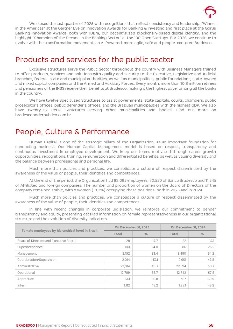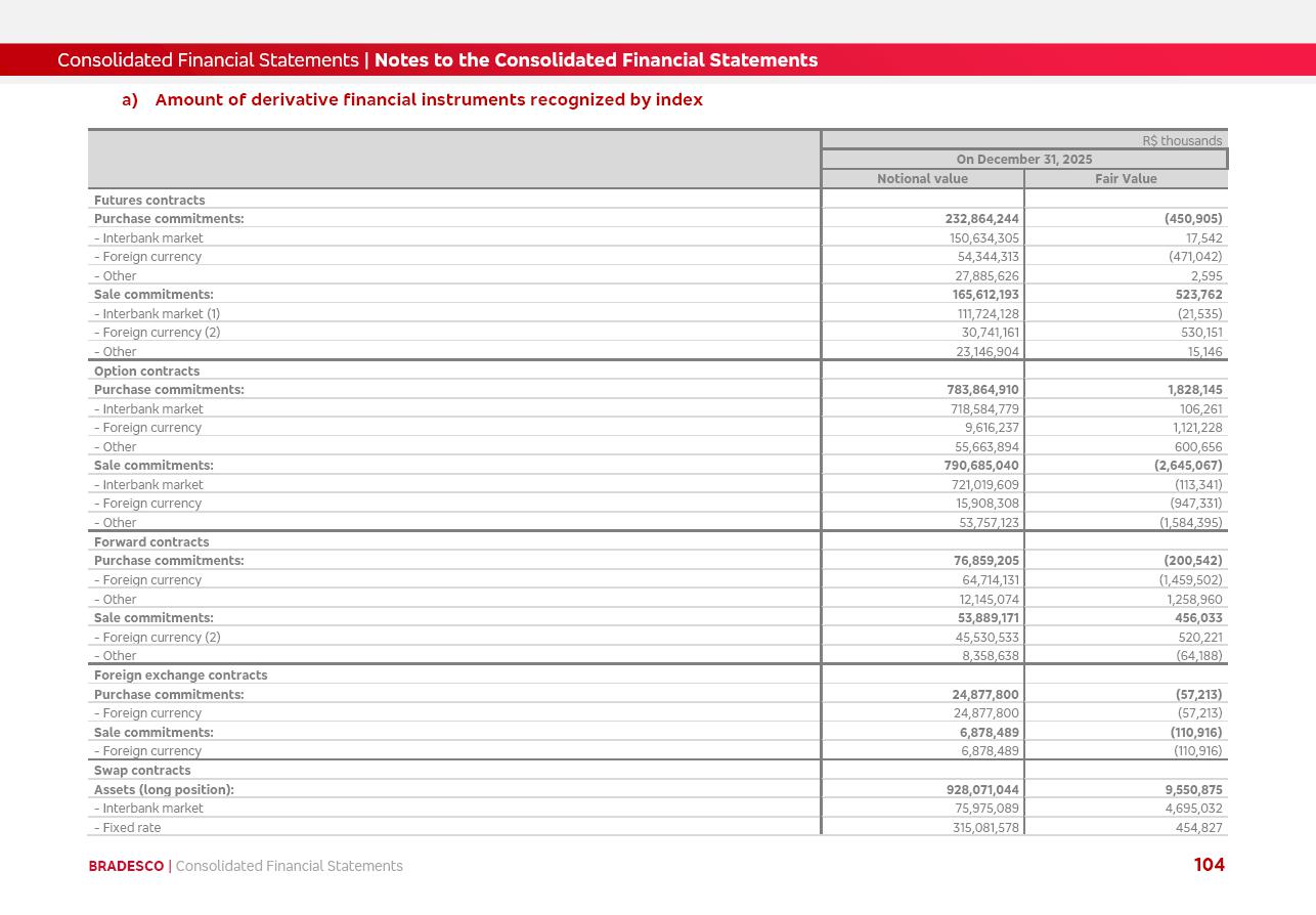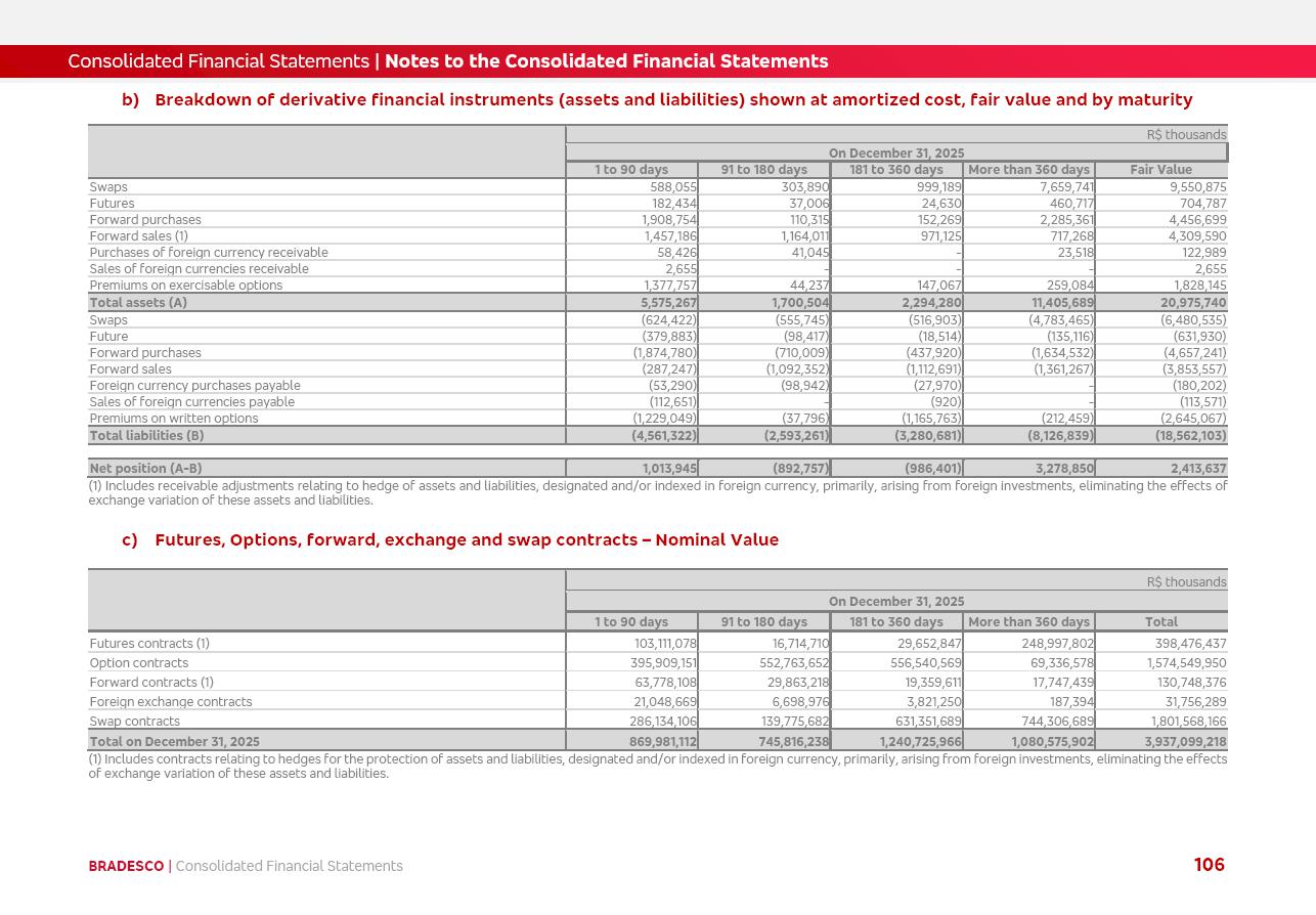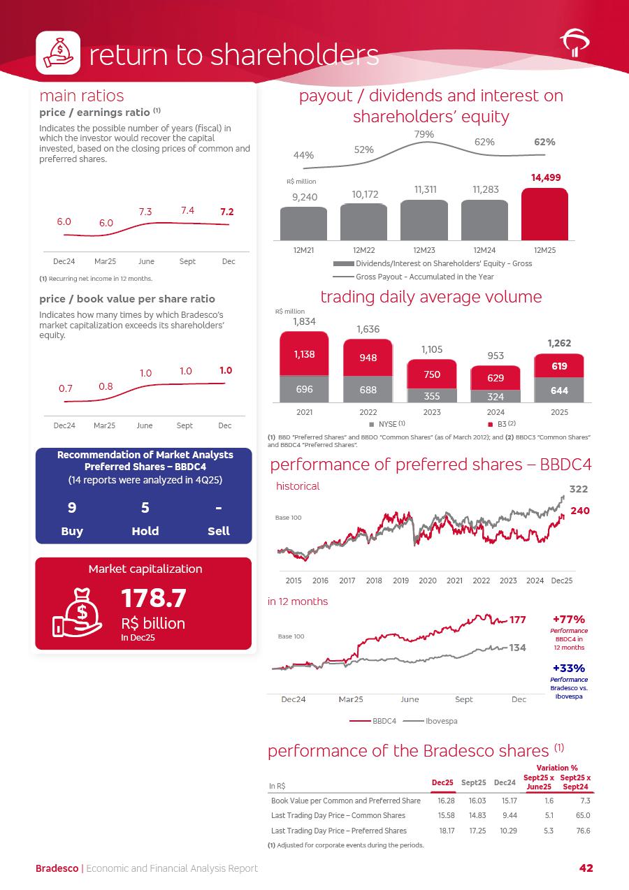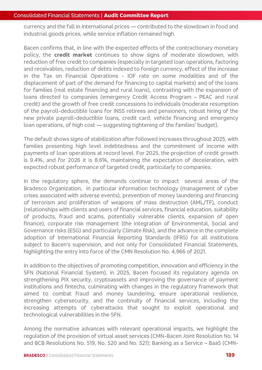 click on the items below to navigate through the document: 4Q 25 managerial analysis of results management report consolidated financial statements videoconference commenting on the results February 6th at 8:30 AM (US Eastern Time) economic and financial analysis reportBradesco | Economic and Financial Analysis Report 3 Table of Contents Managerial Analysis of Results 5 press release 6 highlights 4Q25 7 recurring net income statement 8 net interest income 9 funding sources 10 loan portfolio 11 expenses with expanded loan loss provisions 16 loan indicators 17 fee and commission income 19 operating expenses 21 Bradesco Seguros 22 basel 27 guidance, indicators & economic perspectives 28 Additional Information 29 corporate strategy | customer-centric 30 NPS 31 our people 32 sustainability 33 digital in figures | BIA 34 Bradesco Principal 35 Bradesco Expresso 36 international operations | My Account 37 Bradesco Bank 38 Ágora Investimentos 39 Digio 40 service points, clients and market share 41 return to shareholders 42 additional information 43 selected information 45 consolidated balance sheet – Bradesco 46 consolidated balance sheet – Insurance 47 statement of income – managerial vs. recurring | BRGAAP vs. IFRS comparative 48 Independent Auditor’s Report 49 Consolidated Financial Statements 53 Bradesco | Economic and Financial Analysis Report 4 Some numbers included in this Report have been subjected to rounding adjustments. As a result, some amounts indicated as total amounts in some charts may not be the arithmetic sum of the preceding numbers. Percentage variations not presented in the framework of this report, are related, in their majority, to the low value balances compared with the other periods presented. As of January 2025, we adopted in our Financial Statements the new accounting practices established by CMN Resolutions No. 4,966 and No. 4,975. For management purposes, we kept the information of the previous periods as already disclosed, which do not present relevant differences in the historical analysis of the results. For some credit indicators, when mentioned, we carry out historical data for comparability purposes on a pro-forma basis. In our financial statements the Organization opted for the exemption provided by the Standard not to resubmit comparative information from previous periods resulting from the changes. Managerial Analysis of Results Bradesco | Economic and Financial Analysis Report 6 press release Bradesco remains committed to expand profitability gradually and safely through the accelerated execution of the transformation plan. Our priority is to ensure the sustainability of the business by growing responsibly, keeping the cost of credit under control, investing in the transformation of the Organization, and reinforcing a customer centric approach in all decisions. In 2025, our commercial traction was reflected in impressive revenue growth across all of our core product lines. We maintained our risk appetite, new credit vintages with high quality and delinquency ratios under control. As a result, in 4Q25 we reported a Return on Equity (ROE) higher than our cost of capital, with eight straight quarters of profitability growth. Investments in our transformation have placed temporary pressure on expenses, but they are intended to boost our competitiveness in the short, medium and long term. The integration between "change the bank" and "run the bank" is intensifying, as the benefits of transformation continue to enhance operational performance and make it more sustainable. Net income was R$6.5 billion in 4Q25, resulting in ROAE of 15.2%, generating a profit of R$24.7 billion in 2025 and growth of 26.1% in 2025 vs. 2024. Total revenues topped R$36.1 billion for the quarter, growing 2.9% q/q and 9.8% y/y, driven by the performance of the net interest income and fee and commission income. Net interest income came to R$19.2 billion for the quarter, expanding 2.9% q/q and 13.2% y/y. Client NII reached R$19.1 billion, rising 2.7% q/q and 18.4% y/y, mainly due to the effect of the increase in the loan portfolio and efficiency on the funding margin. Market NII totaled R$126 million in 4Q25, in line with expectations, bringing the full-year figure to R$975 million. The expanded loan portfolio came to R$1.089 trillion, growing 11.0% y/y and 5.3% q/q in December 2025, reflecting our traction in the MSME and Individuals segments, and operations with Large Companies carried out at the end of the year. In December 2025, the delinquency ratio (over 90 days NPL) remained stable. Problem assets in the restructured portfolio fell by R$2.4 billion versus the prior quarter and R$10.5 billion in the annual comparison, while cured assets rose 10.7% q/q and 58.2% y/y. Consequently, stage 3 operations declined throughout 2025, with a 40 bps reduction in the last quarter. The cost of credit retreated slightly from 3.3% in 3Q25 to 3.2% in 4Q25, reflecting the quality of the concession and growth of the loan portfolio over the period. Fee and commission income performed strongly, growing 4.6% q/q and 8.0% y/y. The positive standouts over the quarter included capital market, card income and loan operations. The operational performance from insurance operations generated an income of R$5.6 billion (-1.0% q/q and +2.1% y/y) and net income of R$2.8 billion (10.7% q/q and 10.6% y/y). The ROAE of the insurance company was 24.3% in 4Q25. In 2025, the insurance earnings came to R$10.1 billion. Our efficiency ratio (expenses/revenues) improved by 2.2 p.p. over the year, attributed to a 13.2% increase in revenues and sound management of expenses. In 2025, operating expenses rose by 8.5% while administrative and personnel expenses saw a 5.0% bump, which includes the impact of the collective bargaining agreement of 5.68% and increase in profit-sharing expenditures. Temporary pressures seen throughout the year came mainly from our transformation initiatives and a strategic strengthening of the 