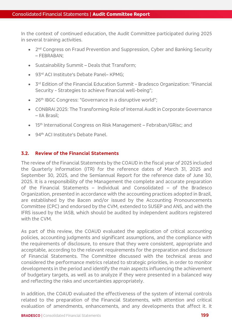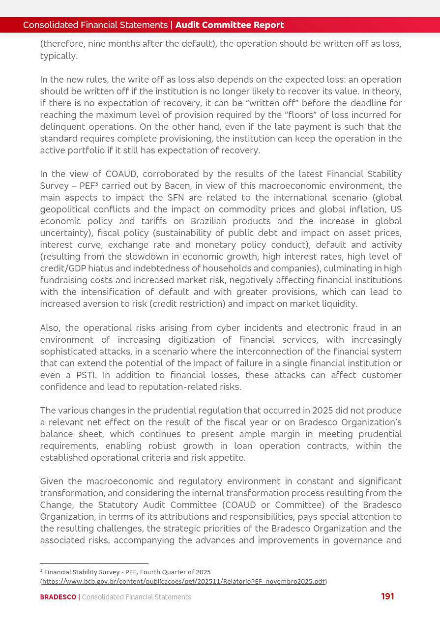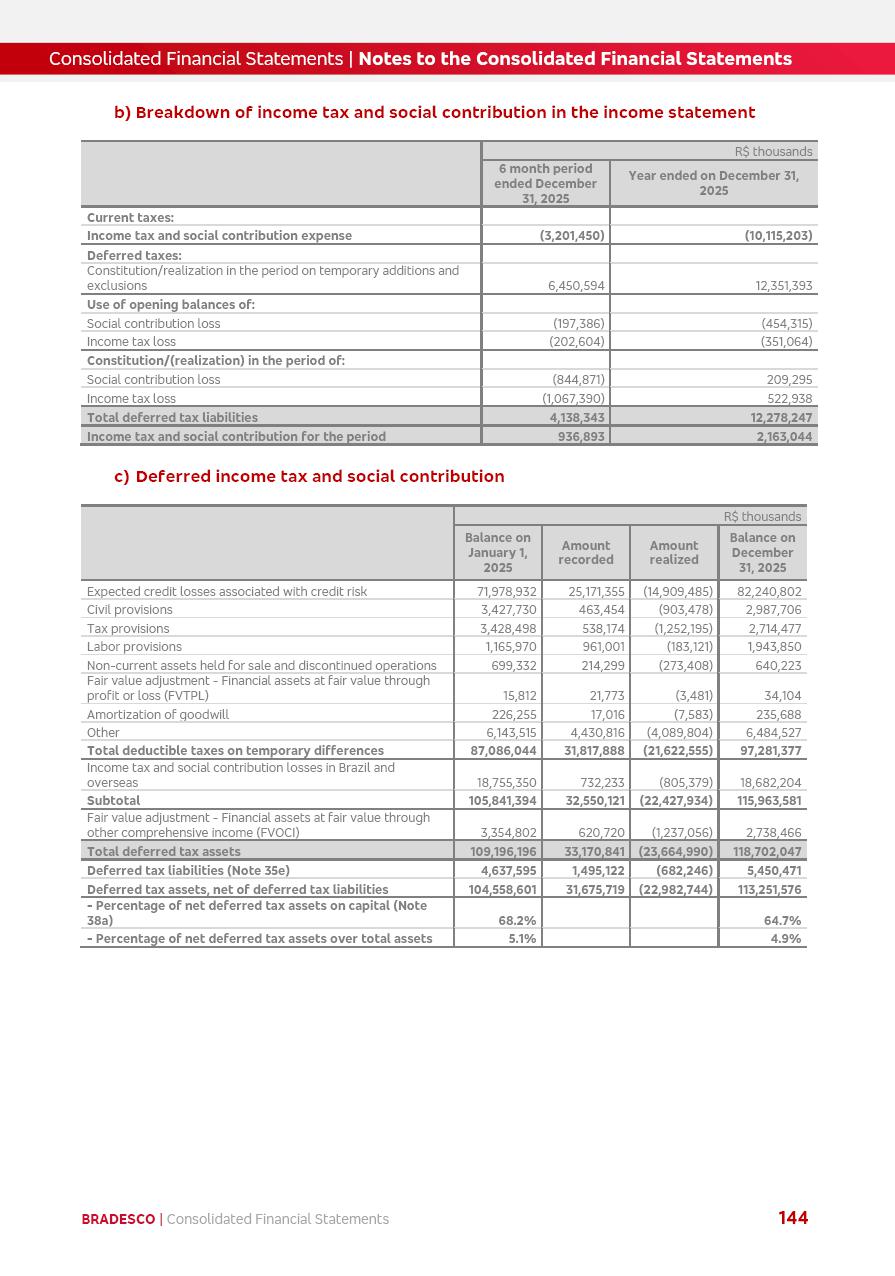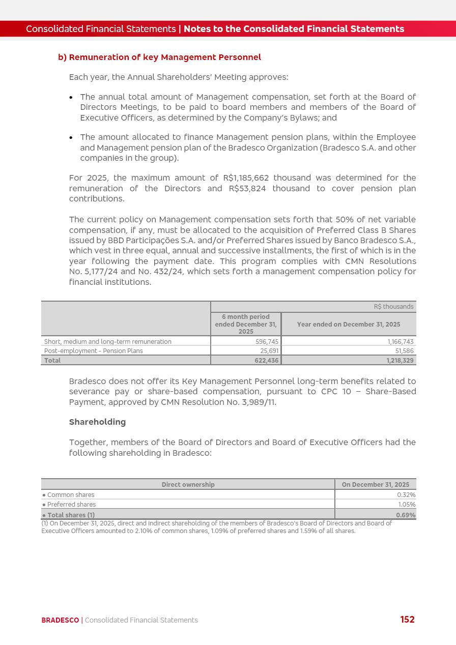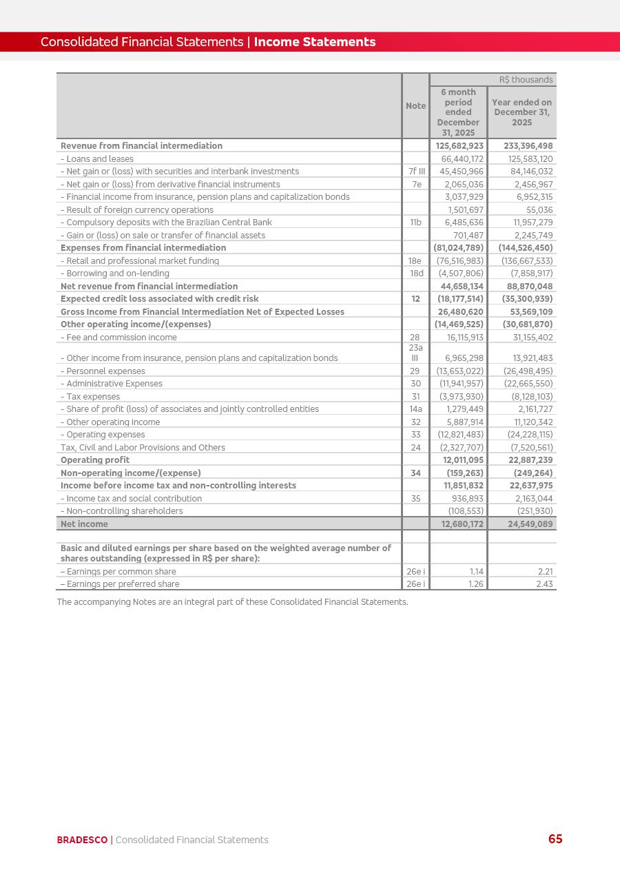 click on the items below to navigate through the document: 4Q 25 managerial analysis of results management report consolidated financial statements videoconference commenting on the results February 6th at 8:30 AM (US Eastern Time) economic and financial analysis reportBradesco | Economic and Financial Analysis Report 3 Table of Contents Managerial Analysis of Results 5 press release 6 highlights 4Q25 7 recurring net income statement 8 net interest income 9 funding sources 10 loan portfolio 11 expenses with expanded loan loss provisions 16 loan indicators 17 fee and commission income 19 operating expenses 21 Bradesco Seguros 22 basel 27 guidance, indicators & economic perspectives 28 Additional Information 29 corporate strategy | customer-centric 30 NPS 31 our people 32 sustainability 33 digital in figures | BIA 34 Bradesco Principal 35 Bradesco Expresso 36 international operations | My Account 37 Bradesco Bank 38 Ágora Investimentos 39 Digio 40 service points, clients and market share 41 return to shareholders 42 additional information 43 selected information 45 consolidated balance sheet – Bradesco 46 consolidated balance sheet – Insurance 47 statement of income – managerial vs. recurring | BRGAAP vs. IFRS comparative 48 Independent Auditor’s Report 49 Consolidated Financial Statements 53 Bradesco | Economic and Financial Analysis Report 4 Some numbers included in this Report have been subjected to rounding adjustments. As a result, some amounts indicated as total amounts in some charts may not be the arithmetic sum of the preceding numbers. Percentage variations not presented in the framework of this report, are related, in their majority, to the low value balances compared with the other periods presented. As of January 2025, we adopted in our Financial Statements the new accounting practices established by CMN Resolutions No. 4,966 and No. 4,975. For management purposes, we kept the information of the previous periods as already disclosed, which do not present relevant differences in the historical analysis of the results. For some credit indicators, when mentioned, we carry out historical data for comparability purposes on a pro-forma basis. In our financial statements the Organization opted for the exemption provided by the Standard not to resubmit comparative information from previous periods resulting from the changes. Managerial Analysis of Results Bradesco | Economic and Financial Analysis Report 6 press release Bradesco remains committed to expand profitability gradually and safely through the accelerated execution of the transformation plan. Our priority is to ensure the sustainability of the business by growing responsibly, keeping the cost of credit under control, investing in the transformation of the Organization, and reinforcing a customer centric approach in all decisions. In 2025, our commercial traction was reflected in impressive revenue growth across all of our core product lines. We maintained our risk appetite, new credit vintages with high quality and delinquency ratios under control. As a result, in 4Q25 we reported a Return on Equity (ROE) higher than our cost of capital, with eight straight quarters of profitability growth. Investments in our transformation have placed temporary pressure on expenses, but they are intended to boost our competitiveness in the short, medium and long term. The integration between "change the bank" and "run the bank" is intensifying, as the benefits of transformation continue to enhance operational performance and make it more sustainable. Net income was R$6.5 billion in 4Q25, resulting in ROAE of 15.2%, generating a profit of R$24.7 billion in 2025 and growth of 26.1% in 2025 vs. 2024. Total revenues topped R$36.1 billion for the quarter, growing 2.9% q/q and 9.8% y/y, driven by the performance of the net interest income and fee and commission income. Net interest income came to R$19.2 billion for the quarter, expanding 2.9% q/q and 13.2% y/y. Client NII reached R$19.1 billion, rising 2.7% q/q and 18.4% y/y, mainly due to the effect of the increase in the loan portfolio and efficiency on the funding margin. Market NII totaled R$126 million in 4Q25, in line with expectations, bringing the full-year figure to R$975 million. The expanded loan portfolio came to R$1.089 trillion, growing 11.0% y/y and 5.3% q/q in December 2025, reflecting our traction in the MSME and Individuals segments, and operations with Large Companies carried out at the end of the year. In December 2025, the delinquency ratio (over 90 days NPL) remained stable. Problem assets in the restructured portfolio fell by R$2.4 billion versus the prior quarter and R$10.5 billion in the annual comparison, while cured assets rose 10.7% q/q and 58.2% y/y. Consequently, stage 3 operations declined throughout 2025, with a 40 bps reduction in the last quarter. The cost of credit retreated slightly from 3.3% in 3Q25 to 3.2% in 4Q25, reflecting the quality of the concession and growth of the loan portfolio over the period. Fee and commission income performed strongly, growing 4.6% q/q and 8.0% y/y. The positive standouts over the quarter included capital market, card income and loan operations. The operational performance from insurance operations generated an income of R$5.6 billion (-1.0% q/q and +2.1% y/y) and net income of R$2.8 billion (10.7% q/q and 10.6% y/y). The ROAE of the insurance company was 24.3% in 4Q25. In 2025, the insurance earnings came to R$10.1 billion. Our efficiency ratio (expenses/revenues) improved by 2.2 p.p. over the year, attributed to a 13.2% increase in revenues and sound management of expenses. In 2025, operating expenses rose by 8.5% while administrative and personnel expenses saw a 5.0% bump, which includes the impact of the collective bargaining agreement of 5.68% and increase in profit-sharing expenditures. Temporary pressures seen throughout the year came mainly from our transformation initiatives and a strategic strengthening of the 