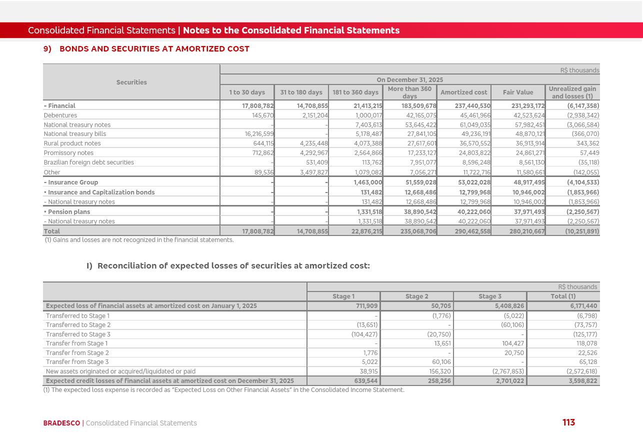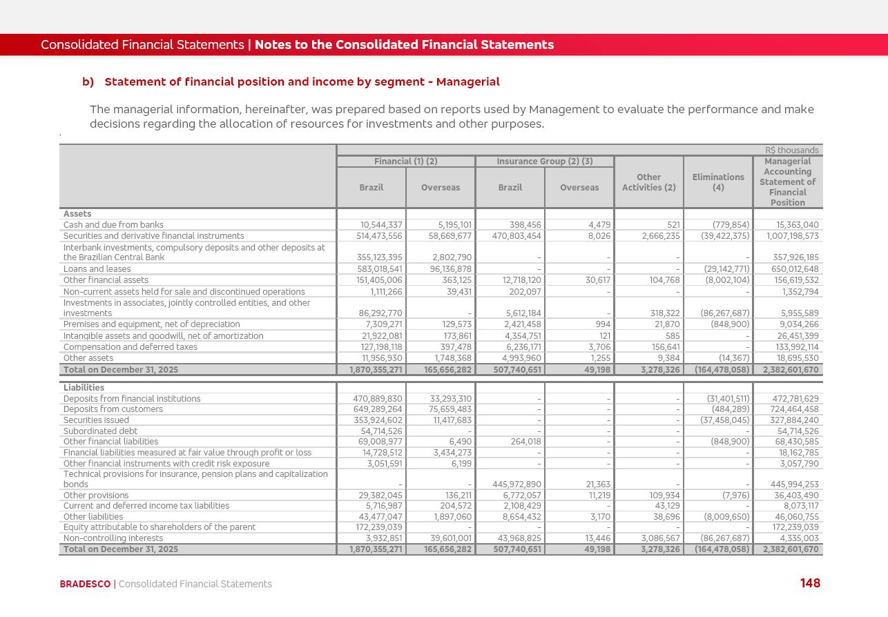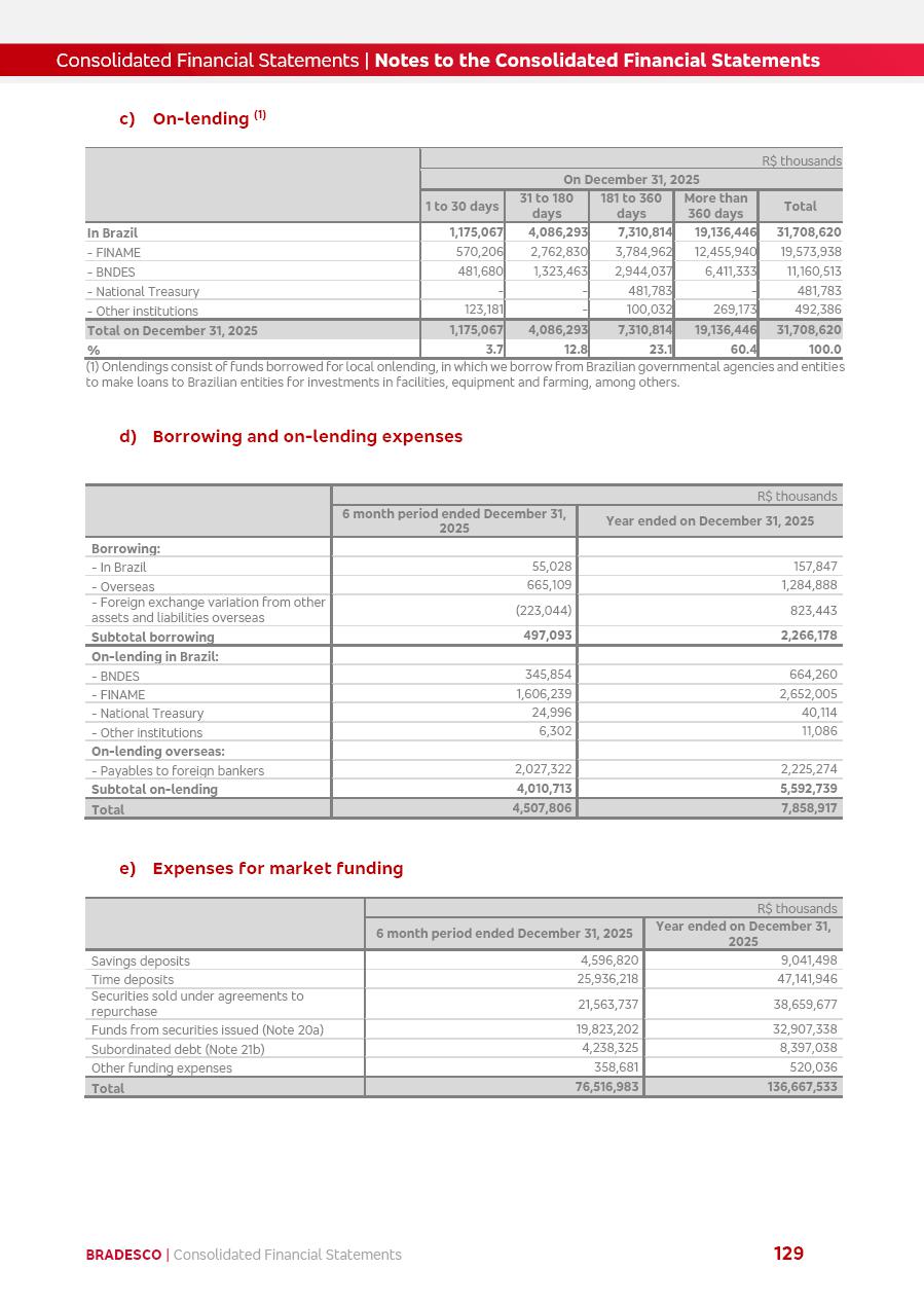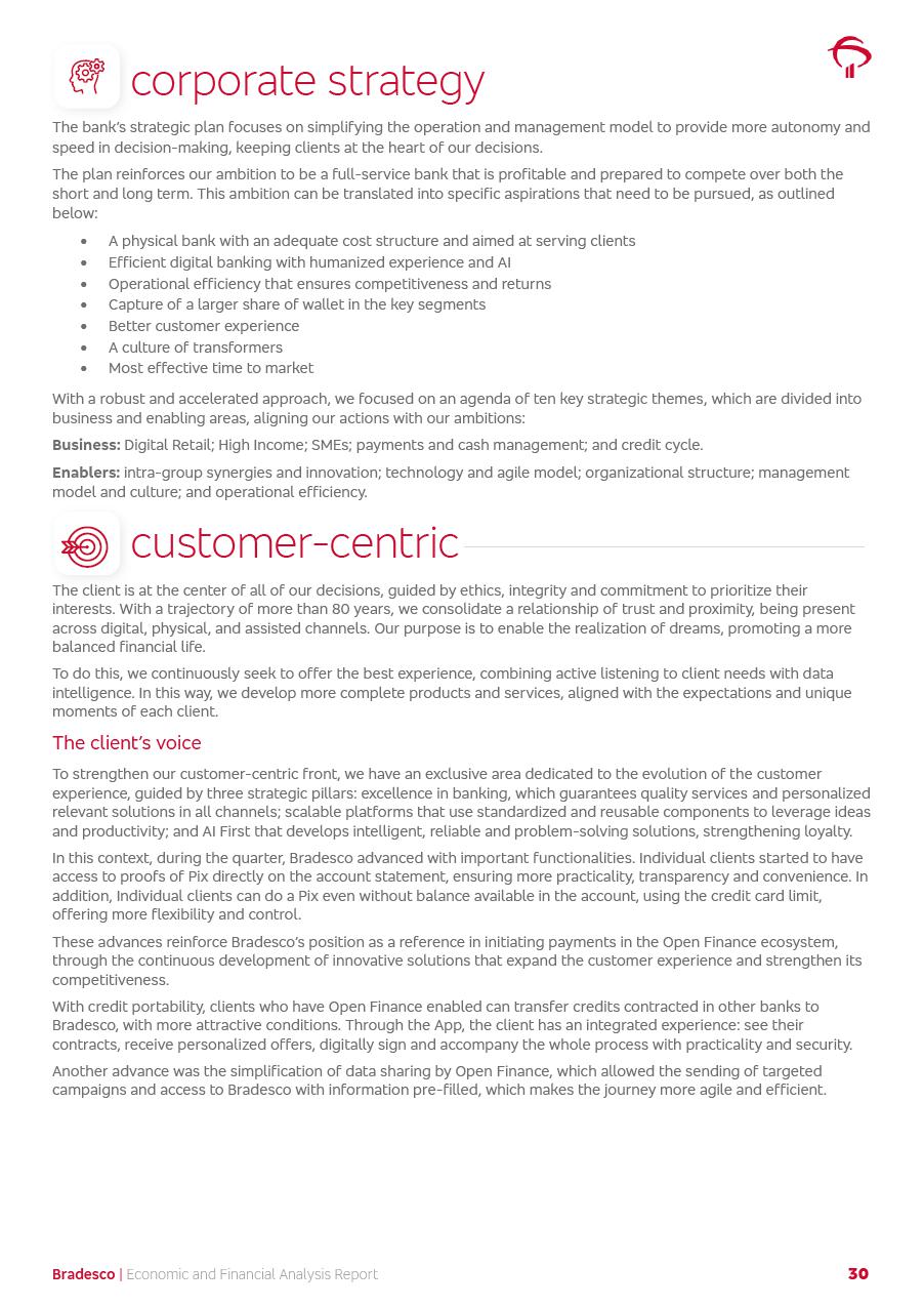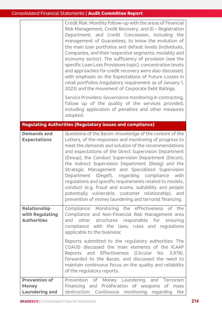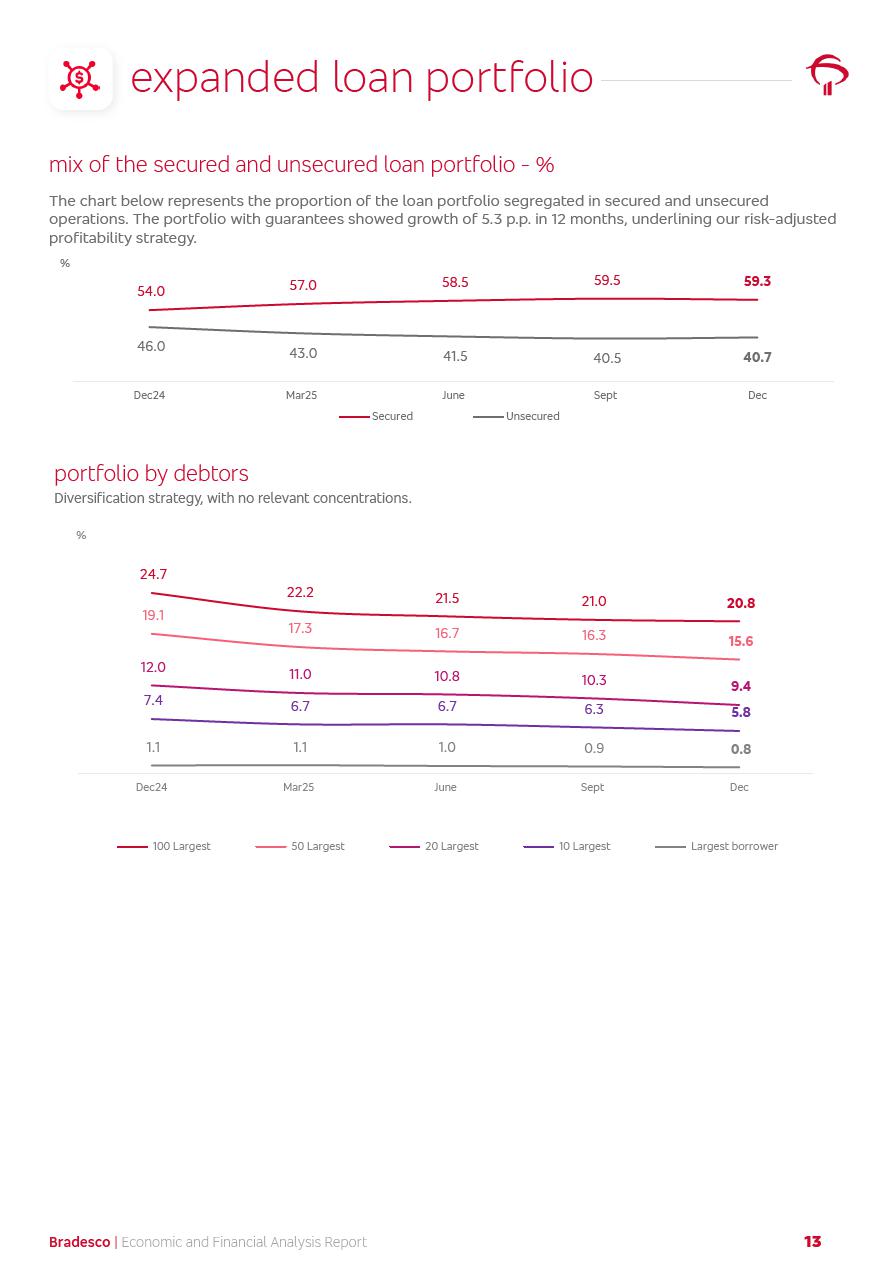click on the items below to navigate through the document: 4Q 25 managerial analysis of results management report consolidated financial statements videoconference commenting on the results February 6th at 8:30 AM (US Eastern Time) economic and financial analysis reportBradesco | Economic and Financial Analysis Report 3 Table of Contents Managerial Analysis of Results 5 press release 6 highlights 4Q25 7 recurring net income statement 8 net interest income 9 funding sources 10 loan portfolio 11 expenses with expanded loan loss provisions 16 loan indicators 17 fee and commission income 19 operating expenses 21 Bradesco Seguros 22 basel 27 guidance, indicators & economic perspectives 28 Additional Information 29 corporate strategy | customer-centric 30 NPS 31 our people 32 sustainability 33 digital in figures | BIA 34 Bradesco Principal 35 Bradesco Expresso 36 international operations | My Account 37 Bradesco Bank 38 Ágora Investimentos 39 Digio 40 service points, clients and market share 41 return to shareholders 42 additional information 43 selected information 45 consolidated balance sheet – Bradesco 46 consolidated balance sheet – Insurance 47 statement of income – managerial vs. recurring | BRGAAP vs. IFRS comparative 48 Independent Auditor’s Report 49 Consolidated Financial Statements 53 Bradesco | Economic and Financial Analysis Report 4 Some numbers included in this Report have been subjected to rounding adjustments. As a result, some amounts indicated as total amounts in some charts may not be the arithmetic sum of the preceding numbers. Percentage variations not presented in the framework of this report, are related, in their majority, to the low value balances compared with the other periods presented. As of January 2025, we adopted in our Financial Statements the new accounting practices established by CMN Resolutions No. 4,966 and No. 4,975. For management purposes, we kept the information of the previous periods as already disclosed, which do not present relevant differences in the historical analysis of the results. For some credit indicators, when mentioned, we carry out historical data for comparability purposes on a pro-forma basis. In our financial statements the Organization opted for the exemption provided by the Standard not to resubmit comparative information from previous periods resulting from the changes. Managerial Analysis of Results Bradesco | Economic and Financial Analysis Report 6 press release Bradesco remains committed to expand profitability gradually and safely through the accelerated execution of the transformation plan. Our priority is to ensure the sustainability of the business by growing responsibly, keeping the cost of credit under control, investing in the transformation of the Organization, and reinforcing a customer centric approach in all decisions. In 2025, our commercial traction was reflected in impressive revenue growth across all of our core product lines. We maintained our risk appetite, new credit vintages with high quality and delinquency ratios under control. As a result, in 4Q25 we reported a Return on Equity (ROE) higher than our cost of capital, with eight straight quarters of profitability growth. Investments in our transformation have placed temporary pressure on expenses, but they are intended to boost our competitiveness in the short, medium and long term. The integration between "change the bank" and "run the bank" is intensifying, as the benefits of transformation continue to enhance operational performance and make it more sustainable. Net income was R$6.5 billion in 4Q25, resulting in ROAE of 15.2%, generating a profit of R$24.7 billion in 2025 and growth of 26.1% in 2025 vs. 2024. Total revenues topped R$36.1 billion for the quarter, growing 2.9% q/q and 9.8% y/y, driven by the performance of the net interest income and fee and commission income. Net interest income came to R$19.2 billion for the quarter, expanding 2.9% q/q and 13.2% y/y. Client NII reached R$19.1 billion, rising 2.7% q/q and 18.4% y/y, mainly due to the effect of the increase in the loan portfolio and efficiency on the funding margin. Market NII totaled R$126 million in 4Q25, in line with expectations, bringing the full-year figure to R$975 million. The expanded loan portfolio came to R$1.089 trillion, growing 11.0% y/y and 5.3% q/q in December 2025, reflecting our traction in the MSME and Individuals segments, and operations with Large Companies carried out at the end of the year. In December 2025, the delinquency ratio (over 90 days NPL) remained stable. Problem assets in the restructured portfolio fell by R$2.4 billion versus the prior quarter and R$10.5 billion in the annual comparison, while cured assets rose 10.7% q/q and 58.2% y/y. Consequently, stage 3 operations declined throughout 2025, with a 40 bps reduction in the last quarter. The cost of credit retreated slightly from 3.3% in 3Q25 to 3.2% in 4Q25, reflecting the quality of the concession and growth of the loan portfolio over the period. Fee and commission income performed strongly, growing 4.6% q/q and 8.0% y/y. The positive standouts over the quarter included capital market, card income and loan operations. The operational performance from insurance operations generated an income of R$5.6 billion (-1.0% q/q and +2.1% y/y) and net income of R$2.8 billion (10.7% q/q and 10.6% y/y). The ROAE of the insurance company was 24.3% in 4Q25. In 2025, the insurance earnings came to R$10.1 billion. Our efficiency ratio (expenses/revenues) improved by 2.2 p.p. over the year, attributed to a 13.2% increase in revenues and sound management of expenses. In 2025, operating expenses rose by 8.5% while administrative and personnel expenses saw a 5.0% bump, which includes the impact of the collective bargaining agreement of 5.68% and increase in profit-sharing expenditures. Temporary pressures seen throughout the year came mainly from our transformation initiatives and a strategic strengthening of the 