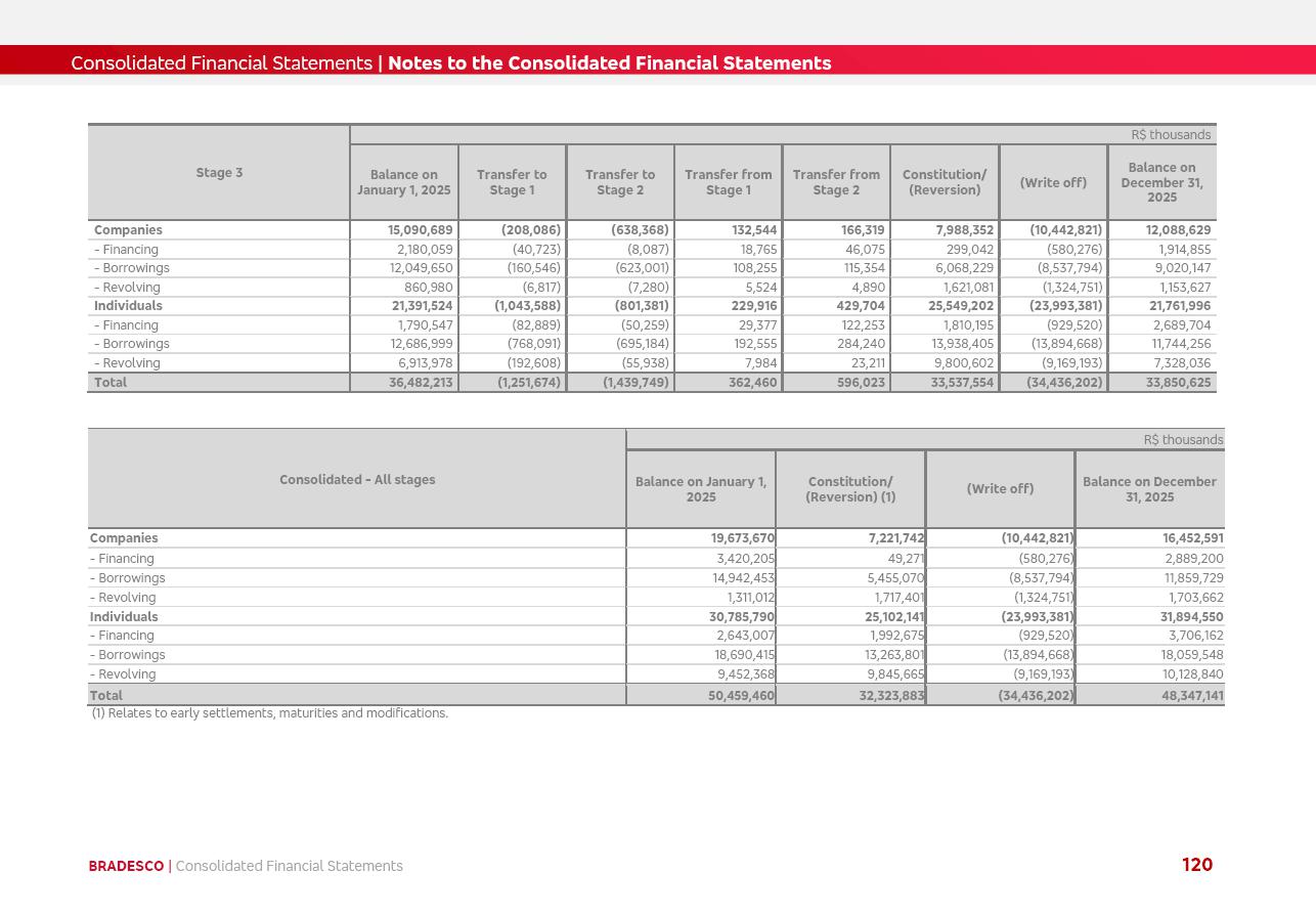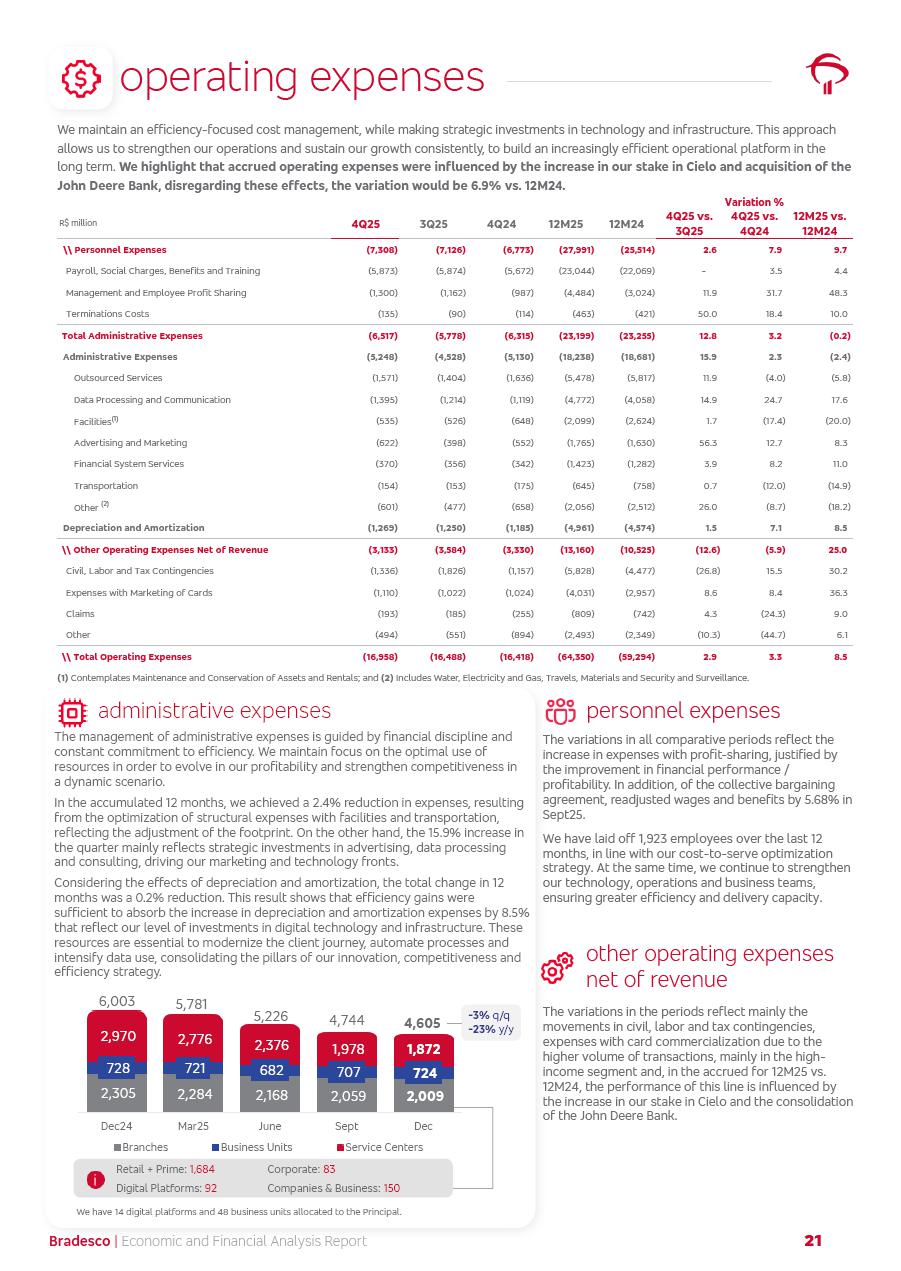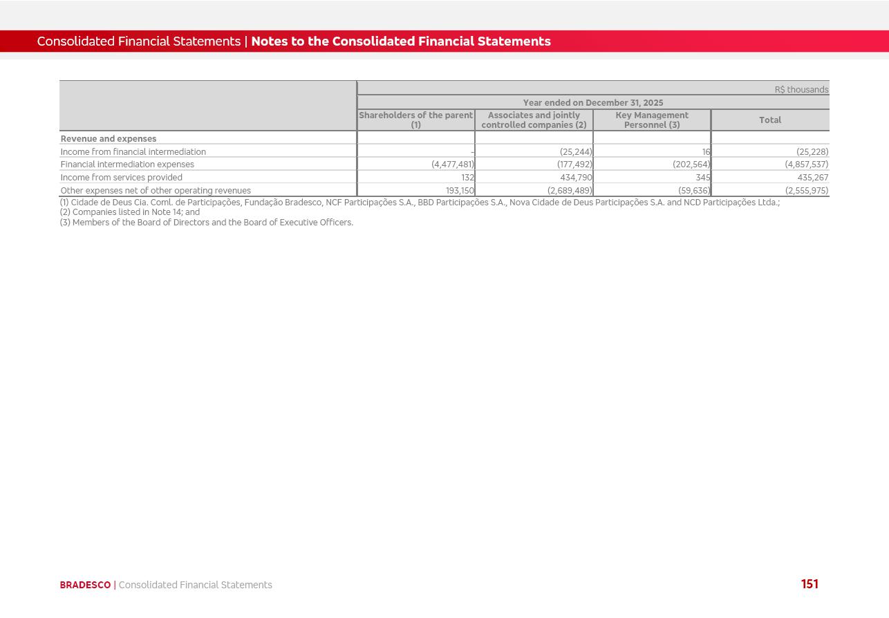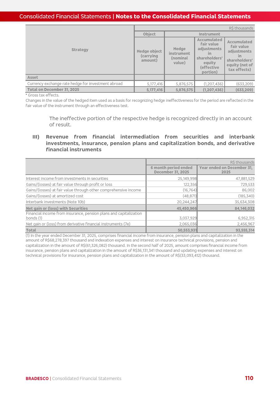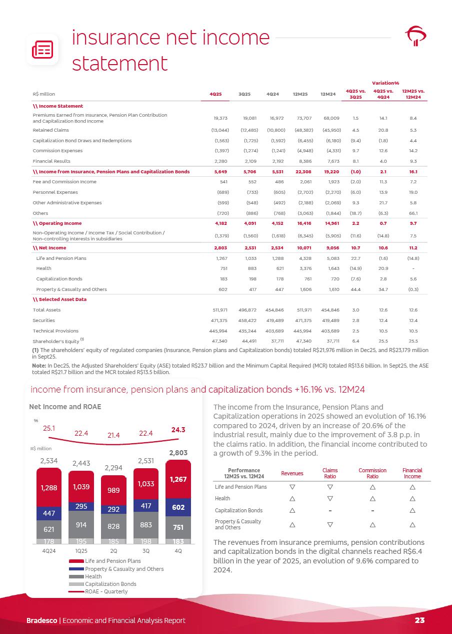 click on the items below to navigate through the document: 4Q 25 managerial analysis of results management report consolidated financial statements videoconference commenting on the results February 6th at 8:30 AM (US Eastern Time) economic and financial analysis reportBradesco | Economic and Financial Analysis Report 3 Table of Contents Managerial Analysis of Results 5 press release 6 highlights 4Q25 7 recurring net income statement 8 net interest income 9 funding sources 10 loan portfolio 11 expenses with expanded loan loss provisions 16 loan indicators 17 fee and commission income 19 operating expenses 21 Bradesco Seguros 22 basel 27 guidance, indicators & economic perspectives 28 Additional Information 29 corporate strategy | customer-centric 30 NPS 31 our people 32 sustainability 33 digital in figures | BIA 34 Bradesco Principal 35 Bradesco Expresso 36 international operations | My Account 37 Bradesco Bank 38 Ágora Investimentos 39 Digio 40 service points, clients and market share 41 return to shareholders 42 additional information 43 selected information 45 consolidated balance sheet – Bradesco 46 consolidated balance sheet – Insurance 47 statement of income – managerial vs. recurring | BRGAAP vs. IFRS comparative 48 Independent Auditor’s Report 49 Consolidated Financial Statements 53 Bradesco | Economic and Financial Analysis Report 4 Some numbers included in this Report have been subjected to rounding adjustments. As a result, some amounts indicated as total amounts in some charts may not be the arithmetic sum of the preceding numbers. Percentage variations not presented in the framework of this report, are related, in their majority, to the low value balances compared with the other periods presented. As of January 2025, we adopted in our Financial Statements the new accounting practices established by CMN Resolutions No. 4,966 and No. 4,975. For management purposes, we kept the information of the previous periods as already disclosed, which do not present relevant differences in the historical analysis of the results. For some credit indicators, when mentioned, we carry out historical data for comparability purposes on a pro-forma basis. In our financial statements the Organization opted for the exemption provided by the Standard not to resubmit comparative information from previous periods resulting from the changes. Managerial Analysis of Results Bradesco | Economic and Financial Analysis Report 6 press release Bradesco remains committed to expand profitability gradually and safely through the accelerated execution of the transformation plan. Our priority is to ensure the sustainability of the business by growing responsibly, keeping the cost of credit under control, investing in the transformation of the Organization, and reinforcing a customer centric approach in all decisions. In 2025, our commercial traction was reflected in impressive revenue growth across all of our core product lines. We maintained our risk appetite, new credit vintages with high quality and delinquency ratios under control. As a result, in 4Q25 we reported a Return on Equity (ROE) higher than our cost of capital, with eight straight quarters of profitability growth. Investments in our transformation have placed temporary pressure on expenses, but they are intended to boost our competitiveness in the short, medium and long term. The integration between "change the bank" and "run the bank" is intensifying, as the benefits of transformation continue to enhance operational performance and make it more sustainable. Net income was R$6.5 billion in 4Q25, resulting in ROAE of 15.2%, generating a profit of R$24.7 billion in 2025 and growth of 26.1% in 2025 vs. 2024. Total revenues topped R$36.1 billion for the quarter, growing 2.9% q/q and 9.8% y/y, driven by the performance of the net interest income and fee and commission income. Net interest income came to R$19.2 billion for the quarter, expanding 2.9% q/q and 13.2% y/y. Client NII reached R$19.1 billion, rising 2.7% q/q and 18.4% y/y, mainly due to the effect of the increase in the loan portfolio and efficiency on the funding margin. Market NII totaled R$126 million in 4Q25, in line with expectations, bringing the full-year figure to R$975 million. The expanded loan portfolio came to R$1.089 trillion, growing 11.0% y/y and 5.3% q/q in December 2025, reflecting our traction in the MSME and Individuals segments, and operations with Large Companies carried out at the end of the year. In December 2025, the delinquency ratio (over 90 days NPL) remained stable. Problem assets in the restructured portfolio fell by R$2.4 billion versus the prior quarter and R$10.5 billion in the annual comparison, while cured assets rose 10.7% q/q and 58.2% y/y. Consequently, stage 3 operations declined throughout 2025, with a 40 bps reduction in the last quarter. The cost of credit retreated slightly from 3.3% in 3Q25 to 3.2% in 4Q25, reflecting the quality of the concession and growth of the loan portfolio over the period. Fee and commission income performed strongly, growing 4.6% q/q and 8.0% y/y. The positive standouts over the quarter included capital market, card income and loan operations. The operational performance from insurance operations generated an income of R$5.6 billion (-1.0% q/q and +2.1% y/y) and net income of R$2.8 billion (10.7% q/q and 10.6% y/y). The ROAE of the insurance company was 24.3% in 4Q25. In 2025, the insurance earnings came to R$10.1 billion. Our efficiency ratio (expenses/revenues) improved by 2.2 p.p. over the year, attributed to a 13.2% increase in revenues and sound management of expenses. In 2025, operating expenses rose by 8.5% while administrative and personnel expenses saw a 5.0% bump, which includes the impact of the collective bargaining agreement of 5.68% and increase in profit-sharing expenditures. Temporary pressures seen throughout the year came mainly from our transformation initiatives and a strategic strengthening of the 