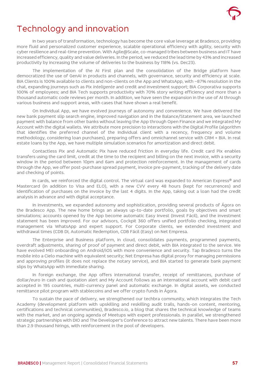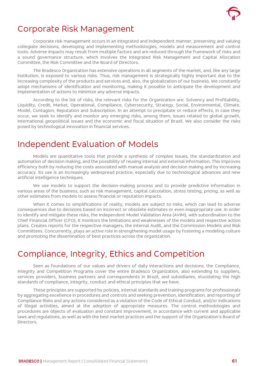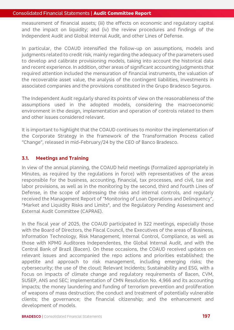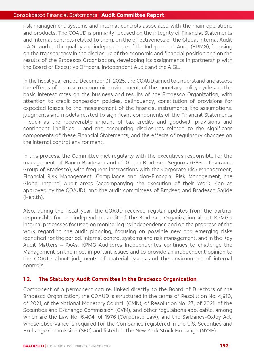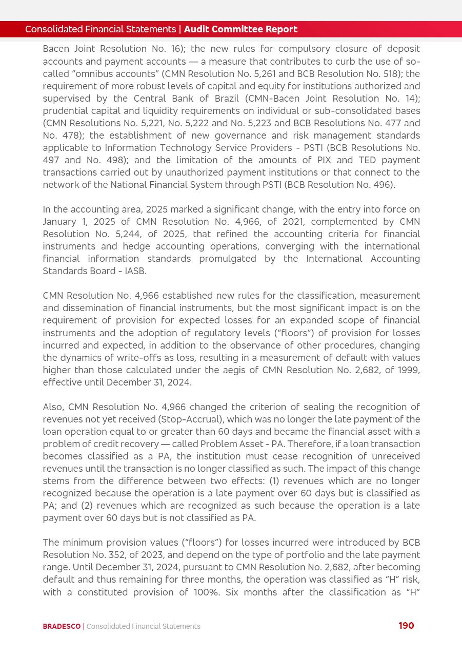 click on the items below to navigate through the document: 4Q 25 managerial analysis of results management report consolidated financial statements videoconference commenting on the results February 6th at 8:30 AM (US Eastern Time) economic and financial analysis reportBradesco | Economic and Financial Analysis Report 3 Table of Contents Managerial Analysis of Results 5 press release 6 highlights 4Q25 7 recurring net income statement 8 net interest income 9 funding sources 10 loan portfolio 11 expenses with expanded loan loss provisions 16 loan indicators 17 fee and commission income 19 operating expenses 21 Bradesco Seguros 22 basel 27 guidance, indicators & economic perspectives 28 Additional Information 29 corporate strategy | customer-centric 30 NPS 31 our people 32 sustainability 33 digital in figures | BIA 34 Bradesco Principal 35 Bradesco Expresso 36 international operations | My Account 37 Bradesco Bank 38 Ágora Investimentos 39 Digio 40 service points, clients and market share 41 return to shareholders 42 additional information 43 selected information 45 consolidated balance sheet – Bradesco 46 consolidated balance sheet – Insurance 47 statement of income – managerial vs. recurring | BRGAAP vs. IFRS comparative 48 Independent Auditor’s Report 49 Consolidated Financial Statements 53 Bradesco | Economic and Financial Analysis Report 4 Some numbers included in this Report have been subjected to rounding adjustments. As a result, some amounts indicated as total amounts in some charts may not be the arithmetic sum of the preceding numbers. Percentage variations not presented in the framework of this report, are related, in their majority, to the low value balances compared with the other periods presented. As of January 2025, we adopted in our Financial Statements the new accounting practices established by CMN Resolutions No. 4,966 and No. 4,975. For management purposes, we kept the information of the previous periods as already disclosed, which do not present relevant differences in the historical analysis of the results. For some credit indicators, when mentioned, we carry out historical data for comparability purposes on a pro-forma basis. In our financial statements the Organization opted for the exemption provided by the Standard not to resubmit comparative information from previous periods resulting from the changes. Managerial Analysis of Results Bradesco | Economic and Financial Analysis Report 6 press release Bradesco remains committed to expand profitability gradually and safely through the accelerated execution of the transformation plan. Our priority is to ensure the sustainability of the business by growing responsibly, keeping the cost of credit under control, investing in the transformation of the Organization, and reinforcing a customer centric approach in all decisions. In 2025, our commercial traction was reflected in impressive revenue growth across all of our core product lines. We maintained our risk appetite, new credit vintages with high quality and delinquency ratios under control. As a result, in 4Q25 we reported a Return on Equity (ROE) higher than our cost of capital, with eight straight quarters of profitability growth. Investments in our transformation have placed temporary pressure on expenses, but they are intended to boost our competitiveness in the short, medium and long term. The integration between "change the bank" and "run the bank" is intensifying, as the benefits of transformation continue to enhance operational performance and make it more sustainable. Net income was R$6.5 billion in 4Q25, resulting in ROAE of 15.2%, generating a profit of R$24.7 billion in 2025 and growth of 26.1% in 2025 vs. 2024. Total revenues topped R$36.1 billion for the quarter, growing 2.9% q/q and 9.8% y/y, driven by the performance of the net interest income and fee and commission income. Net interest income came to R$19.2 billion for the quarter, expanding 2.9% q/q and 13.2% y/y. Client NII reached R$19.1 billion, rising 2.7% q/q and 18.4% y/y, mainly due to the effect of the increase in the loan portfolio and efficiency on the funding margin. Market NII totaled R$126 million in 4Q25, in line with expectations, bringing the full-year figure to R$975 million. The expanded loan portfolio came to R$1.089 trillion, growing 11.0% y/y and 5.3% q/q in December 2025, reflecting our traction in the MSME and Individuals segments, and operations with Large Companies carried out at the end of the year. In December 2025, the delinquency ratio (over 90 days NPL) remained stable. Problem assets in the restructured portfolio fell by R$2.4 billion versus the prior quarter and R$10.5 billion in the annual comparison, while cured assets rose 10.7% q/q and 58.2% y/y. Consequently, stage 3 operations declined throughout 2025, with a 40 bps reduction in the last quarter. The cost of credit retreated slightly from 3.3% in 3Q25 to 3.2% in 4Q25, reflecting the quality of the concession and growth of the loan portfolio over the period. Fee and commission income performed strongly, growing 4.6% q/q and 8.0% y/y. The positive standouts over the quarter included capital market, card income and loan operations. The operational performance from insurance operations generated an income of R$5.6 billion (-1.0% q/q and +2.1% y/y) and net income of R$2.8 billion (10.7% q/q and 10.6% y/y). The ROAE of the insurance company was 24.3% in 4Q25. In 2025, the insurance earnings came to R$10.1 billion. Our efficiency ratio (expenses/revenues) improved by 2.2 p.p. over the year, attributed to a 13.2% increase in revenues and sound management of expenses. In 2025, operating expenses rose by 8.5% while administrative and personnel expenses saw a 5.0% bump, which includes the impact of the collective bargaining agreement of 5.68% and increase in profit-sharing expenditures. Temporary pressures seen throughout the year came mainly from our transformation initiatives and a strategic strengthening of the 