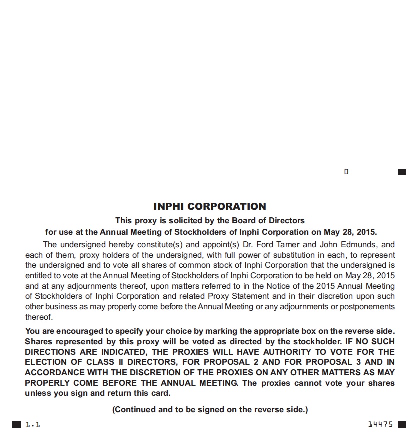 Inphi Corporation will hold its 2015 Annual Meeting of Stockholders (the Annual Meeting) at 9:30 a.m., Pacific Time, on Thursday, May 28, 2015, at the offices of Pillsbury Winthrop Shaw Pittman LLP, located at 2550 Hanover Street, Palo Alto, California 94304. We are holding the Annual Meeting: