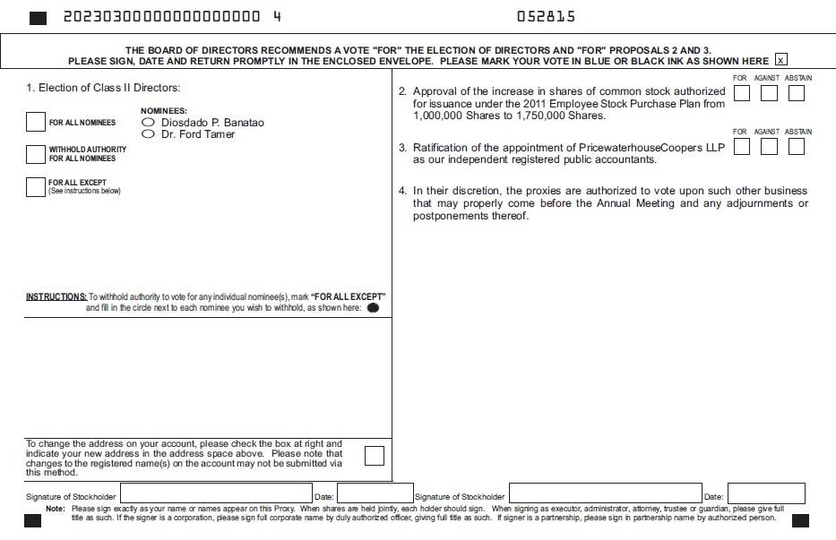If you submit your proxy, but do not mark your voting preference, the proxy holders will vote your shares FOR the election of the nominees for Class II directors, FOR the approval of the increase in shares of common stock authorized for issuance under the ESPP from 1,000,000 shares to 1,750,000 shares, and FOR the ratification of the appointment of our independent registered public accountants.