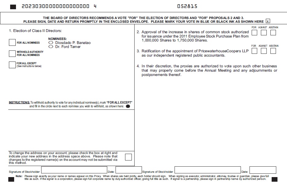 You are cordially invited to attend our 2015 Annual Meeting of Stockholders (the Annual Meeting). The Annual Meeting will be held at 9:30 a.m., Pacific Time, on Thursday, May 28, 2015, at the offices of Pillsbury Winthrop Shaw Pittman LLP, located at 2550 Hanover Street, Palo Alto, California 94304.