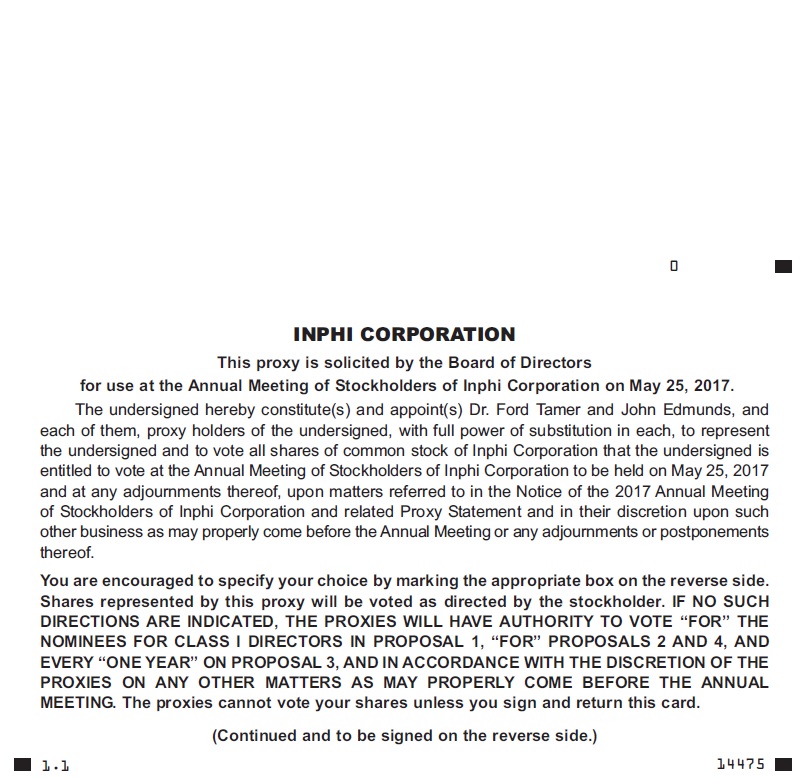 Inphi Corporation will hold its 2017 Annual Meeting of Stockholders (the Annual Meeting) at 9:30 a.m., Pacific Time, on Thursday, May 25, 2017, at the offices of Pillsbury Winthrop Shaw Pittman LLP, located at 2550 Hanover Street, Palo Alto, California 94304. We are holding the Annual Meeting: