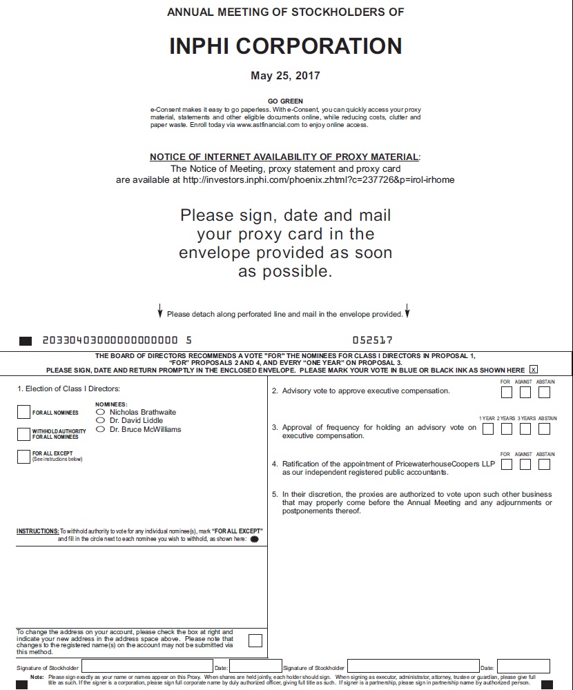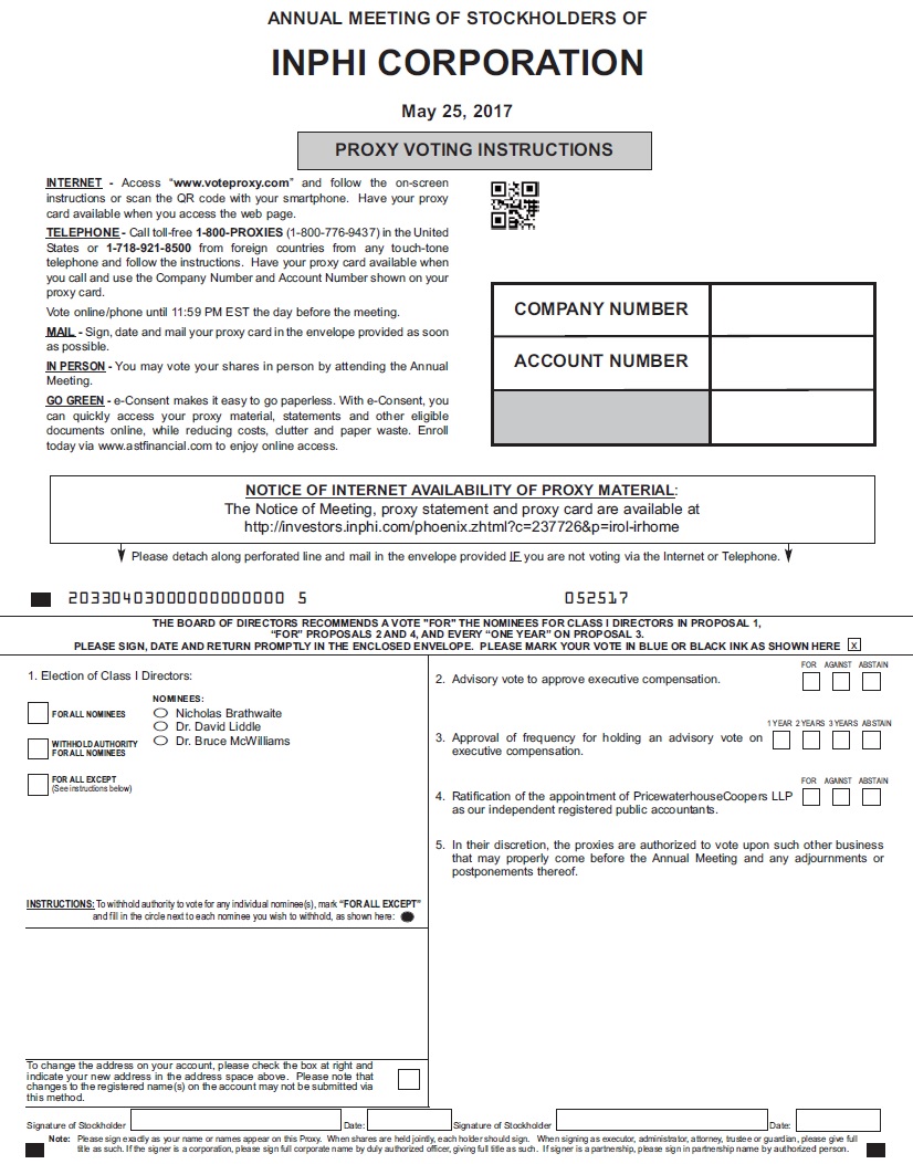 Our Proxy Statement for our 2017 Annual Meeting of Stockholders, along with the proxy card, our Annual Report to Stockholders for the year ended December 31, 2016, and our Annual Report on Form 10-K are available on our website at www.inphi.com.