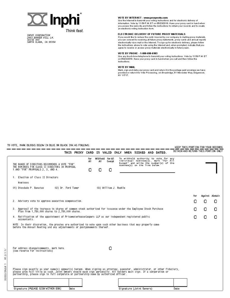 Inphi Corporation will hold its 2018 Annual Meeting of Stockholders (the Annual Meeting) at 9:30 a.m., Pacific Time, on Thursday, May 24, 2018 at the offices of Pillsbury Winthrop Shaw Pittman LLP, located at 2550 Hanover Street, Palo Alto, California 94304. We are holding the Annual Meeting: