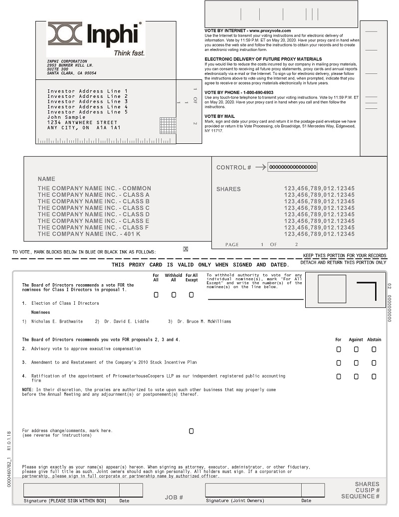 We intend to hold our Annual Meeting in person. However, we are actively monitoring the coronavirus (COVID-19) situation and are sensitive to the public health and travel concerns our stockholders may have and the protocols that federal, state, and local governments may impose. In the event it is not possible or advisable to hold our Annual Meeting in person, we will announce alternative arrangements for the meeting as promptly as practicable, which may include holding the meeting solely by means of remote communication. If we take this step, we will announce the decision to do so in advance by filing Definitive Additional Materials with the SEC along with notice of the change(s) to the Annual Meeting, and details on how to participate will be available at www.inphi.com.