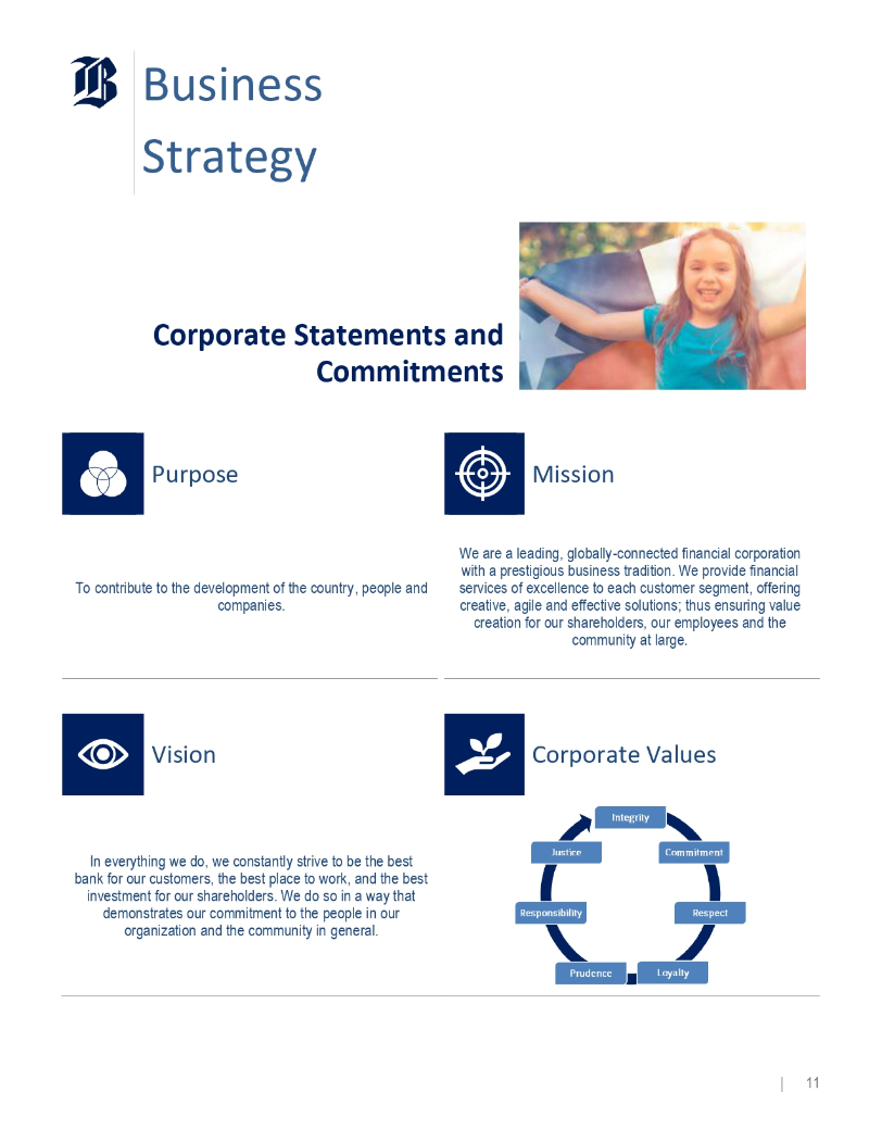 Business Strategy Corporate Statements and Commitments Purpose Mission To contribute to the development of the country, people and companies. We are a leading, globally - connected financial corporation with a prestigious business tradition. We provide financial services of excellence to each customer segment, offering creative, agile and effective solutions; thus ensuring value creation for our shareholders, our employees and the community at large. Vision Corporate Values In everything we do, we constantly strive to be the best bank for our customers, the best place to work, and the best investment for our shareholders. We do so in a way that demonstrates our commitment to the people in our organization and the community in general. | 11