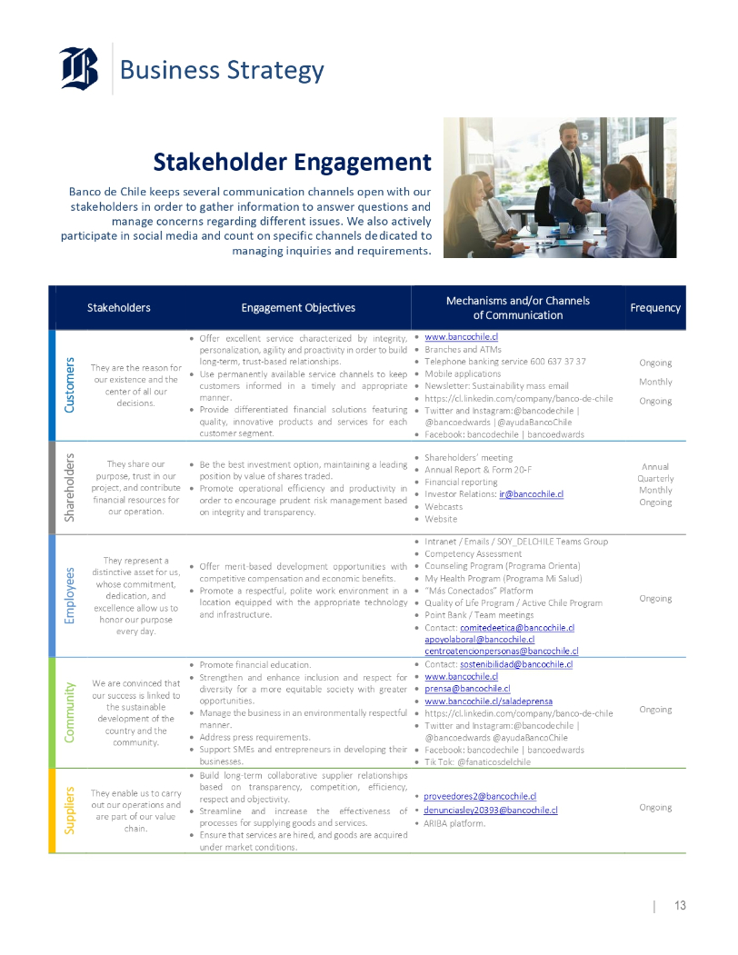 Business Strategy Stakeholder Engagement Banco de Chile keeps several communication channels open with our stakeholders in order to gather information to answer questions and manage concerns regarding different issues. We also actively participate in social media and count on specific channels dedicated to managing inquiries and requirements. Stakeholders Engagement Objectives Mechanisms and/or Channels of Communication Frequency Customers They are the reason for our existence and the center of all our decisions. Offer excellent service characterized by integrity, personalization, agility and proactivity in order to build long - term, trust - based relationships . Use permanently available service channels to keep customers informed in a timely and appropriate manner . Provide differentiated financial solutions featuring quality, innovative products and services for each customer segment . www.bancochile.c l Branches and ATMs Telephone banking service 600 637 37 37 Mobile applications Newsletter: Sustainability mass email https://cl.linkedin.com/company/banco - de - chile Twitter and Instagram:@bancodechile | @bancoedwards |@ayudaBancoChile Facebook: bancodechile | bancoedwards Ongoing Monthly Ongoing Shareholders They share our purpose, trust in our project, and contribute financial resources for our operation. Be the best investment option, maintaining a leading position by value of shares traded . Promote operational efficiency and productivity in order to encourage prudent risk management based on integrity and transparency . Shareholders’ meeting Annual Report & Form 20 - F Financial reporting Investor Relations: ir@bancochile.c l Webcasts Website Annual Quarterly Monthly Ongoing Employees They represent a distinctive asset for us, whose commitment, dedication, and excellence allow us to honor our purpose every day. Offer merit - based development opportunities with competitive compensation and economic benefits . Promote a respectful, polite work environment in a location equipped with the appropriate technology and infrastructure . Intranet / Emails / SOY_DELCHILE Teams Group Competency Assessment Counseling Program (Programa Orienta) My Health Program (Programa Mi Salud) “Más Conectados” Platform Quality of Life Program / Active Chile Program Point Bank / Team meetings Contact: comitedeetica@bancochile.c l apoyolaboral@bancochile.c l centroatencionpersonas@bancochile.c l Ongoing Community We are convinced that our success is linked to the sustainable development of the country and the community. Promote financial education . Strengthen and enhance inclusion and respect for diversity for a more equitable society with greater opportunities . Manage the business in an environmentally respectful manner . Address press requirements . Support SMEs and entrepreneurs in developing their businesses . Contact: sostenibilidad@bancochile.c l www.bancochile.c l prensa@bancochile.cl www.bancochile.cl/saladeprensa https://cl.linkedin.com/company/banco - de - chile Twitter and Instagram:@bancodechile | @bancoedwards @ayudaBancoChile Facebook: bancodechile | bancoedwards Tik Tok: @fanaticosdelchile Ongoing Suppliers They enable us to carry out our operations and are part of our value chain. Build long - term collaborative supplier relationships based on transparency, competition, efficiency, respect and objectivity . Streamline and increase the effectiveness of processes for supplying goods and services. Ensure that services are hired, and goods are acquired under market conditions. • proveedores2@bancochile.c l • denunciasley20393@bancochile.c l • ARIBA platform. Ongoing | 13