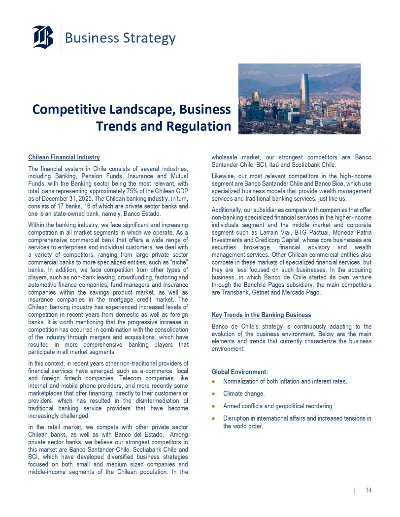 Business Strategy Competitive Landscape, Business Trends and Regulation Chilean Financial Industry The financial system in Chile consists of several industries, including Banking, Pension Funds, Insurance and Mutual Funds, with the Banking sector being the most relevant, with total loans representing approximately 75 % of the Chilean GDP as of December 31 , 2025 . The Chilean banking industry, in turn, consists of 17 banks, 16 of which are private sector banks and one is an state - owned bank, namely, Banco Estado . Within the banking industry, we face significant and increasing competition in all market segments in which we operate . As a comprehensive commercial bank that offers a wide range of services to enterprises and individual customers, we deal with a variety of competitors, ranging from large private sector commercial banks to more specialized entities, such as “niche” banks . In addition, we face competition from other types of players, such as non - bank leasing, crowdfunding, factoring and automotive finance companies, fund managers and insurance companies within the savings product market, as well as insurance companies in the mortgage credit market . The Chilean banking industry has experienced increased levels of competition in recent years from domestic as well as foreign banks . It is worth mentioning that the progressive increase in competition has occurred in combination with the consolidation of the industry through mergers and acquisitions, which have resulted in more comprehensive banking players that participate in all market segments . In this context, in recent years other non - traditional providers of financial services have emerged, such as e - commerce, local and foreign fintech companies, Telecom companies, like internet and mobile phone providers, and more recently some marketplaces that offer financing, directly to their customers or providers, which has resulted in the disintermediation of traditional banking service providers that have become increasingly challenged . In the retail market, we compete with other private sector Chilean banks, as well as with Banco del Estado . Among private sector banks, we believe our strongest competitors in this market are Banco Santander - Chile, Scotiabank Chile and BCI, which have developed diversified business strategies focused on both small and medium sized companies and middle - income segments of the Chilean population . In the wholesale market, our strongest competitors are Banco Santander - Chile, BCI, Itaú and Scotiabank Chile . Likewise, our most relevant competitors in the high - income segment are Banco Santander Chile and Banco Bice, which use specialized business models that provide wealth management services and traditional banking services, just like us . Additionally, our subsidiaries compete with companies that offer non - banking specialized financial services in the higher - income individuals segment and the middle market and corporate segment such as Larrain Vial, BTG Pactual, Moneda Patria Investments and Credicorp Capital, whose core businesses are securities brokerage, financial advisory and wealth management services . Other Chilean commercial entities also compete in these markets of specialized financial services, but they are less focused on such businesses . In the acquiring business, in which Banco de Chile started its own venture through the Banchile Pagos subsidiary, the main competitors are Transbank, Getnet and Mercado Pago . Key Trends in the Banking Business Banco de Chile’s strategy is continuously adapting to the evolution of the business environment . Below are the main elements and trends that currently characterize the business environment : Global Environment: Normalization of both inflation and interest rates. Climate change. Armed conflicts and geopolitical reordering. Disruption in international affairs and increased tensions in the world order. | 14