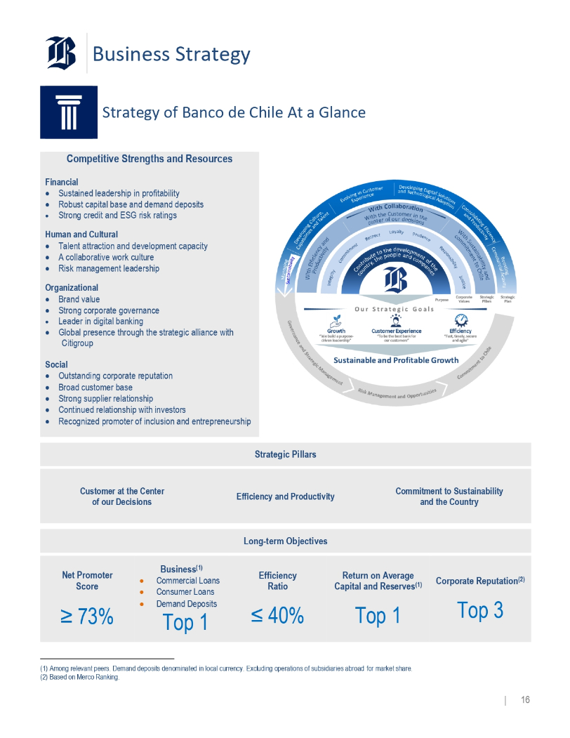 Business Strategy Sustained progress in the technological transformation process of Banchile Administradora General de Fondos and Banchile Corredora de Bolsa by maintaining the market - leading position of these subsidiaries in their respective industries through a renewed digital offering for customers. Integration of the loan collection function through the merge of Socofin into the Bank , which pursues to improve both operational efficiency and customer experience. For the third year in a row, we ranked 1st in Service Quality in the Large Financial Institutions Sector , according to the study conducted by PXI - Praxis Ranking. For the third year in a row we were recognized at the 2025 PROCALIDAD National Customer Satisfaction Awards by attaining the first place in the Large Financial Institutions sector and the only bank to receive the highest distinction, “Best of the Best,” in the contractual category . Consolidation of a cybersecurity culture by homologating processes, platforms and governance across Banco de Chile and subsidiaries, which enable us to have a solid and sustainable basis to deal with emerging risks. Successful launch of “Project 4270 ”, an initiative that makes available on the public portal images captured by a drone that travelled the 4,270 kilometers of Chile from North to South. This initiative strengthened brand positioning and corporate image while complementing the Corporation’s diverse activities of commitment to the country. Several strategic alignment and training activities that pursue to reinforce cultural attributes and commitment to business - related challenges. Diverse activities within the sustainability and commitment to Chile framework, such as : “Teleton 2025”, "Education for Chile" conference, Fifth edition of "Women Who Inspire", Corporate Volunteering, the "Reading Boost" Program, “Challengers 2025”, the “XXVI Chilean Open” and the “National Entrepreneurial Challenge Contest”. Placement of an ESG bond amounting to CHF 100 million under our MTN program, which is intended to finance social projects . Golden category certification by Mutual de Seguridad program for all of our Joint Health and Safety Committees, which reflects our commitment to excellence in risk prevention, continuous improvement and team participation in building safer and healthier work environments. First place in the loccal financial industry in Talent Attraction and Retention , according to Merco Talento 2025. | 22