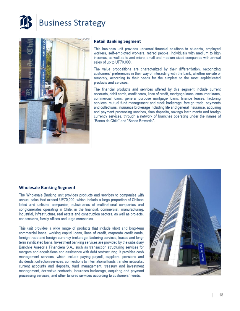 Business Strategy Retail Banking Segment This business unit provides universal financial solutions to students, employed workers, self – employed workers, retired people, individuals with medium to high incomes, as well as to and micro, small and medium - sized companies with annual sales of up to UF 70 , 000 . The value propositions are characterized by their differentiation, recognizing customers preferences in their way of interacting with the bank, whether on - site or remotely, according to their needs for the simplest to the most sophisticated products and services . The financial products and services offered by this segment include current accounts, debit cards, credit cards, lines of credit, mortgage loans, consumer loans, commercial loans, general purpose mortgage loans, finance leases, factoring services, mutual fund management and stock brokerage, foreign trade, payments and collections, insurance brokerage including life and general insurance, acquiring and payment processing services, time deposits, savings instruments and foreign currency services, through a network of branches operating under the names of “Banco de Chile” and “Banco Edwards ” . Wholesale Banking Segment The Wholesale Banking unit provides products and services to companies with annual sales that exceed UF 70 , 000 , which include a large proportion of Chilean listed and unlisted companies, subsidiaries of multinational companies and conglomerates operating in Chile, in the financial, commercial, manufacturing, industrial, infrastructure, real estate and construction sectors, as well as projects, concessions, family offices and large companies . This unit provides a wide range of products that include short and long - term commercial loans, working capital loans, lines of credit, corporate credit cards, foreign trade and foreign currency brokerage, factoring services, leases and long - term syndicated loans . Investment banking services are provided by the subsidiary Banchile Asesoría Financiera S . A . , such as transaction structuring services for mergers and acquisitions and assistance with debt restructuring . It provides cash management services, which include paying payroll, suppliers, pensions and dividends, collection services, connections to international funds transfer networks, current accounts and deposits, fund management, treasury and investment management, derivative contracts, insurance brokerage, acquiring and payment processing services, and other tailored services according to customers’ needs . | 18