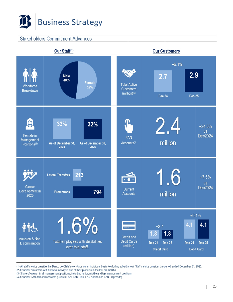 Business Strategy (1) All staff metrics consider the Banco de Chile’s workforce on an individual basis (excluding subsidiaries). Staff metrics consider the period ended December 31, 2025. (2) Consider customers with financial activity in one of their products in the last six months. (3) Share of women in all management positions, including junior, middle and top management positions. (4) Consider FAN demand accounts (Cuenta FAN, FAN Clan, FAN Ahorro and FAN Emprende). Stakeholders Commitment Advances Our Staff (1) Our Customers Workforce Breakdown Total Active Customers (million) ( 2 ) Female in Management Positions (3) FAN Accounts (4) 2.4 million +24.5% vs Dec2024 Career Development in 2025 Current Accounts 1.6 million +7.5% vs Dec2024 Inclusion & Non - Discrimination 1.6% Total employees with disabilities over total staff. Credit and Debit Cards (million) Female 52% Male 48% 2.7 2.9 Dec - 24 Dec - 25 +6.1% 33% 32% As of December 31, As of December 31, 2024 2025 794 213 Promotions Lateral Transfers 1.8 1.8 4.1 4.1 Dec - 24 Dec - 25 Dec - 24 Dec - 25 Credit Card Debit Card +0.1% +2.7 | 23