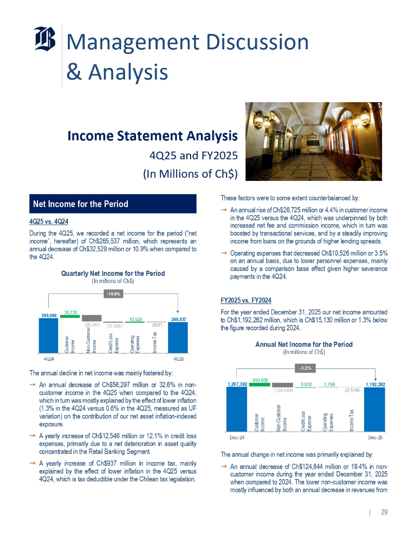 Management Discussion & Analysis Income Statement Analysis 4Q25 and FY2025 (In Millions of Ch$) Net Income for the Period 4 Q 25 vs . 4 Q 24 During the 4 Q 25 , we recorded a net income for the period (“net income”, hereafter) of Ch $ 265 , 537 million, which represents an annual decrease of Ch $ 32 , 529 million or 10 . 9 % when compared to the 4 Q 24 . Quarterly Net Income for the Period (In millions of Ch$) 298,066 26,725 (56,297) (12,546) (937) 10,526 265,537 4Q24 4Q25 Income Tax Non - Customer Income Customer Income Credit Loss Expense Operating Expenses - 10.9% The annual decline in net income was mainly fostered by: ⭬ An annual decrease of Ch $ 56 , 297 million or 32 . 6 % in non - customer income in the 4 Q 25 when compared to the 4 Q 24 , which in turn was mostly explained by the effect of lower inflation ( 1 . 3 % in the 4 Q 24 versus 0 . 6 % in the 4 Q 25 , measured as UF variation) on the contribution of our net asset inflation - indexed exposure . ⭬ A yearly increase of Ch $ 12 , 546 million or 12 . 1 % in credit loss expenses, primarily due to a net deterioration in asset quality concentrated in the Retail Banking Segment . ⭬ A yearly increase of Ch $ 937 million in income tax, mainly explained by the effect of lower inflation in the 4 Q 25 versus 4 Q 24 , which is tax deductible under the Chilean tax legislation . These factors were to some extent counterbalanced by : ⭬ An annual rise of Ch $ 26 , 725 million or 4 . 4 % in customer income in the 4 Q 25 versus the 4 Q 24 , which was underpinned by both increased net fee and commission income, which in turn was boosted by transactional services, and by a steadily improving income from loans on the grounds of higher lending spreads . ⭬ Operating expenses that decreased Ch $ 10 , 526 million or 3 . 5 % on an annual basis, due to lower personnel expenses, mainly caused by a comparison base effect given higher severance payments in the 4 Q 24 . FY 2025 vs . FY 2024 For the year ended December 31 , 2025 our net income amounted to Ch $ 1 , 192 , 262 million, which is Ch $ 15 , 130 million or 1 . 3 % below the figure recorded during 2024 . Annual Net Income for the Period (In millions of Ch$) 1,207,392 100,602 (124,844) 9,832 1,796 (2,516) 1,192,262 Dec - 24 Dec - 25 The annual change in net income was primarily explained by : ⭬ An annual decrease of Ch $ 124 , 844 million or 19 . 4 % in non - customer income during the year ended December 31 , 2025 when compared to 2024 . The lower non - customer income was mostly influenced by both an annual decrease in revenues from Non - Customer Income Income Tax Customer Income Credit Loss Expense Operating Expenses - 1.3% | 29