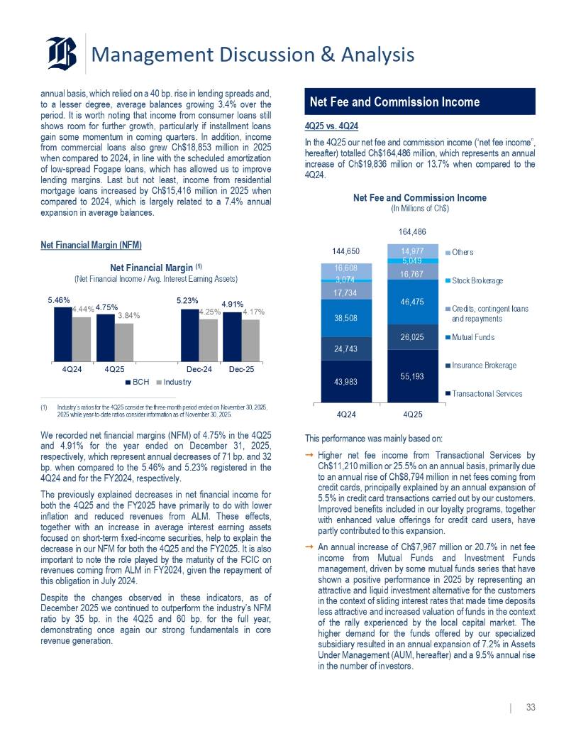 Management Discussion & Analysis annual basis, which relied on a 40 bp . rise in lending spreads and, to a lesser degree, average balances growing 3 . 4 % over the period . It is worth noting that income from consumer loans still shows room for further growth, particularly if installment loans gain some momentum in coming quarters . In addition, income from commercial loans also grew Ch $ 18 , 853 million in 2025 when compared to 2024 , in line with the scheduled amortization of low - spread Fogape loans, which has allowed us to improve lending margins . Last but not least, income from residential mortgage loans increased by Ch $ 15 , 416 million in 2025 when compared to 2024 , which is largely related to a 7 . 4 % annual expansion in average balances . Net Financial Margin (NFM) Net Financial Margin (1) (Net Financial Income / Avg. Interest Earning Assets) 5.23% 4.91% 5.46% 4.44% 4.75% 3.84% 4.25% 4.17% 4Q24 4Q25 Dec - 25 Dec - 24 BCH Industry (1) Industry s ratios for the 4Q25 consider the three - month period ended on November 30, 2025, 2025 while year - to - date ratios consider information as of November 30, 2025. We recorded net financial margins (NFM) of 4 . 75 % in the 4 Q 25 and 4 . 91 % for the year ended on December 31 , 2025 , respectively, which represent annual decreases of 71 bp . and 32 bp . when compared to the 5 . 46 % and 5 . 23 % registered in the 4 Q 24 and for the FY 2024 , respectively . The previously explained decreases in net financial income for both the 4 Q 25 and the FY 2025 have primarily to do with lower inflation and reduced revenues from ALM . These effects, together with an increase in average interest earning assets focused on short - term fixed - income securities, help to explain the decrease in our NFM for both the 4 Q 25 and the FY 2025 . It is also important to note the role played by the maturity of the FCIC on revenues coming from ALM in FY 2024 , given the repayment of this obligation in July 2024 . Despite the changes observed in these indicators, as of December 2025 we continued to outperform the industry’s NFM ratio by 35 bp . in the 4 Q 25 and 60 bp . for the full year, demonstrating once again our strong fundamentals in core revenue generation . Net Fee and Commission Income 4 Q 25 vs . 4 Q 24 In the 4 Q 25 our net fee and commission income (“net fee income”, hereafter) totalled Ch $ 164 , 486 million, which represents an annual increase of Ch $ 19 , 836 million or 13 . 7 % when compared to the 4 Q 24 . Net Fee and Commission Income (In Millions of Ch$) 164,486 43,983 55,193 24,743 26,025 38,508 46,475 17,734 16,767 16,608 3,074 14,977 5,049 144,650 4Q24 4Q25 This performance was mainly based on : ⭬ Higher net fee income from Transactional Services by Ch $ 11 , 210 million or 25 . 5 % on an annual basis, primarily due to an annual rise of Ch $ 8 , 794 million in net fees coming from credit cards, principally explained by an annual expansion of 5 . 5 % in credit card transactions carried out by our customers . Improved benefits included in our loyalty programs, together with enhanced value offerings for credit card users, have partly contributed to this expansion . ⭬ An annual increase of Ch $ 7 , 967 million or 20 . 7 % in net fee income from Mutual Funds and Investment Funds management, driven by some mutual funds series that have shown a positive performance in 2025 by representing an attractive and liquid investment alternative for the customers in the context of sliding interest rates that made time deposits less attractive and increased valuation of funds in the context of the rally experienced by the local capital market . The higher demand for the funds offered by our specialized subsidiary resulted in an annual expansion of 7 . 2 % in Assets Under Management (AUM, hereafter) and a 9 . 5 % annual rise in the number of investors . Others Stock Brokerage Credits, contingent loans and repayments Mutual Funds Insurance Brokerage Transactional Services | 33
