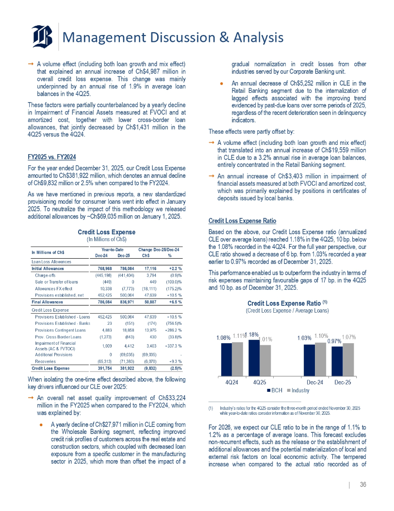 Management Discussion & Analysis ⭬ A volume effect (including both loan growth and mix effect) that explained an annual increase of Ch $ 4 , 987 million in overall credit loss expense . This change was mainly underpinned by an annual rise of 1 . 9 % in average loan balances in the 4 Q 25 . These factors were partially counterbalanced by a yearly decline in Impairment of Financial Assets measured at FVOCI and at amortized cost, together with lower cross - border loan allowances, that jointly decreased by Ch $ 1 , 431 million in the 4 Q 25 versus the 4 Q 24 . FY 2025 vs . FY 2024 For the year ended December 31 , 2025 , our Credit Loss Expense amounted to Ch $ 381 , 922 million, which denotes an annual decline of Ch $ 9 , 832 million or 2 . 5 % when compared to the FY 2024 . As we have mentioned in previous reports, a new standardized provisioning model for consumer loans went into effect in January 2025 . To neutralize the impact of this methodology we released additional allowances by ~Ch $ 69 , 035 million on January 1 , 2025 . Credit Loss Expense (In Millions of Ch$) Loan Loss Allowances Initial Allowances Charge - offs Sale or Transfer of loans Allowances FX effect Provisions established, net (445,198) (449) 10,338 452,425 (441,404) 0 (7,773) 500,064 3,794 449 (18,111) 47,639 (0.9)% (100.0)% (175.2)% +10.5 % Change Dec - 25/Dec - 24 Ch$ % 17,116 +2.2 % Year - to - Date Dec - 24 Dec - 25 768,968 786,084 +6.5 % 50,887 836,971 786,084 Final Allowances Credit Loss Expense +10.5 % 47,639 500,064 452,425 Provisions Established - Loans (756.5)% (174) (151) 23 Provisions Established - Banks +286.2 % 13,975 18,858 4,883 Provisions Contingent Loans (33.8)% 430 (843) (1,273) Prov. Cross Border Loans +337.3 % 3,403 4,412 1,009 Impairment of Financial Assets (AC & FVTOCI) - (69,035) (69,035) 0 Additional Provisions +9.3 % (6,070) (71,383) (65,313) Recoveries (2.5)% (9,832) 381,922 391,754 Credit Loss Expense In Millions of Ch$ When isolating the one - time effect described above, the following key drivers influenced our CLE over 2025: ⭬ An overall net asset quality improvement of Ch $ 33 , 224 million in the FY 2025 when compared to the FY 2024 , which was explained by : A yearly decline of Ch $ 27 , 971 million in CLE coming from the Wholesale Banking segment, reflecting improved credit risk profiles of customers across the real estate and construction sectors, which coupled with decreased loan exposure from a specific customer in the manufacturing sector in 2025 , which more than offset the impact of a gradual normalization in credit losses from other industries served by our Corporate Banking unit. An annual decrease of Ch $ 5 , 252 million in CLE in the Retail Banking segment due to the internalization of lagged effects associated with the improving trend evidenced by past - due loans over some periods of 2025 , regardless of the recent deterioration seen in delinquency indicators . These effects were partly offset by : ⭬ A volume effect (including both loan growth and mix effect) that translated into an annual increase of Ch $ 19 , 559 million in CLE due to a 3 . 2 % annual rise in average loan balances, entirely concentrated in the Retail Banking segment . ⭬ An annual increase of Ch $ 3 , 403 million in impairment of financial assets measured at both FVOCI and amortized cost, which was primarily explained by positions in certificates of deposits issued by local banks . Credit Loss Expense Ratio Based on the above, our Credit Loss Expense ratio (annualized CLE over average loans) reached 1 . 18 % in the 4 Q 25 , 10 bp . below the 1 . 08 % recorded in the 4 Q 24 . For the full year perspective, our CLE ratio showed a decrease of 6 bp . from 1 . 03 % recorded a year earlier to 0 . 97 % recorded as of December 31 , 2025 . This performance enabled us to outperform the industry in terms of risk expenses maintaining favourable gaps of 17 bp . in the 4 Q 25 and 10 bp . as of December 31 , 2025 . Credit Loss Expense Ratio (1) (Credit Loss Expense / Average Loans) 0.97% 1.08% 1.11% 1.18% 1.01% 1.03% 1.10% 1.07% 4Q24 4Q25 Dec - 25 Dec - 24 BCH Industry | 36 (1) Industry s ratios for the 4Q25 consider the three - month period ended November 30, 2025 while year - to - date ratios consider information as of November 30, 2025. For 2026 , we expect our CLE ratio to be in the range of 1 . 1 % to 1 . 2 % as a percentage of average loans . This forecast excludes non - recurrent effects, such as the release or the establishment of additional allowances and the potential materialization of local and external risk factors on local economic activity . The tempered increase when compared to the actual ratio recorded as of