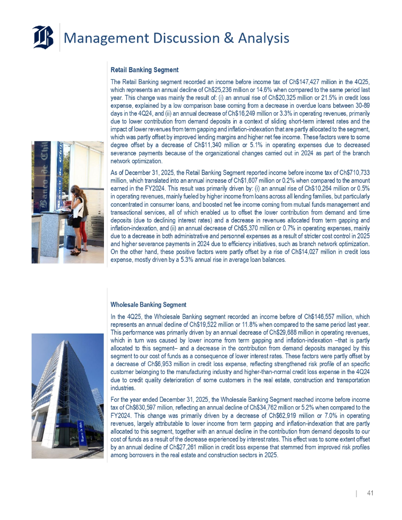 Management Discussion & Analysis Business Segments Performance 4Q25 and FY2025 (In Millions of Ch$) Our income before income tax amounted to Ch $ 340 , 118 million in the 4 Q 25 . This level denotes an annual decrease of Ch $ 31 , 592 million or 8 . 5 % when compared to the 4 Q 24 . During this quarter the main source of income before income tax was the Retail Banking segment that represented 43 . 3 % of the total bottom line before taxes, followed by the Wholesale Banking segment that explained 43 . 1 % of the total amount . To a lesser degree, our Subsidiaries and Treasury business contributed with 9 . 0 % and 4 . 5 % , respectively . As of December 31 , 2025 , our income before income tax reached Ch $ 1 , 513 , 183 million, which was Ch $ 12 , 614 million below the figure recorded during the year ended December 31 , 2024 . In terms of composition, our bottom line before taxes was primarily supported by the performance of our Retail Banking segment that represented 47 . 0 % of the total amount, followed by the Wholesale Banking segment with a contribution of 41 . 7 % to our total income before income tax . As usual, these business segments were followed by our Subsidiaries and Treasury that represented 7 . 7 % and 3 . 7 % of our total income before income tax, respectively . Quarterly Pre - Tax Income by Business Segment (In Millions of Ch$) 371,710 340,118 26,703 30,778 166,079 146,557 147,427 15,356 172,663 6,265 4Q24 Treasury Wholesale Banking 4Q25 Retail Banking Subsidiaries Year - to - Date Pre - Tax Income by Business Segment (In Millions of Ch$) 1,513,183 1,525,797 115,865 98,007 630,597 665,359 710,733 55,988 709,126 53,305 Dec - 24 Treasury Wholesale Banking Dec - 25 Retail Banking Subsidiaries | 40