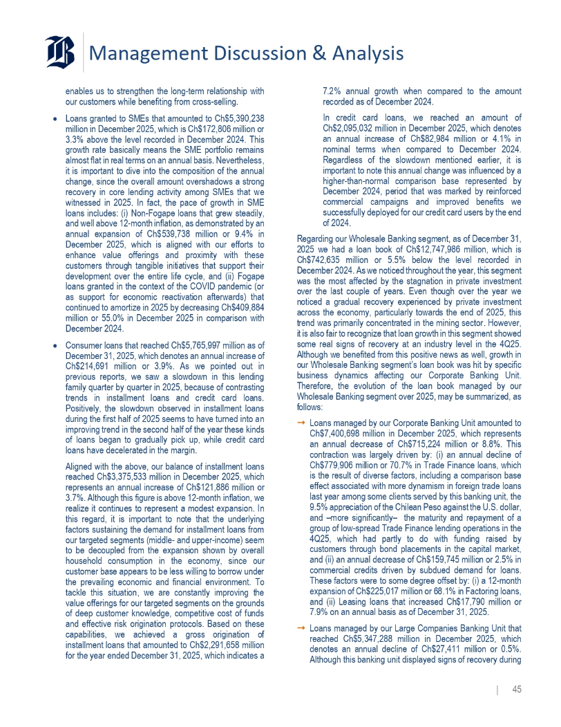 Management Discussion & Analysis enables us to strengthen the long - term relationship with our customers while benefiting from cross - selling . Loans granted to SMEs that amounted to Ch $ 5 , 390 , 238 million in December 2025 , which is Ch $ 172 , 806 million or 3 . 3 % above the level recorded in December 2024 . This growth rate basically means the SME portfolio remains almost flat in real terms on an annual basis . Nevertheless, it is important to dive into the composition of the annual change, since the overall amount overshadows a strong recovery in core lending activity among SMEs that we witnessed in 2025 . In fact, the pace of growth in SME loans includes : (i) Non - Fogape loans that grew steadily, and well above 12 - month inflation, as demonstrated by an annual expansion of Ch $ 539 , 738 million or 9 . 4 % in December 2025 , which is aligned with our efforts to enhance value offerings and proximity with these customers through tangible initiatives that support their development over the entire life cycle, and (ii) Fogape loans granted in the context of the COVID pandemic (or as support for economic reactivation afterwards) that continued to amortize in 2025 by decreasing Ch $ 409 , 884 million or 55 . 0 % in December 2025 in comparison with December 2024 . Consumer loans that reached Ch $ 5 , 765 , 997 million as of December 31 , 2025 , which denotes an annual increase of Ch $ 214 , 691 million or 3 . 9 % . As we pointed out in previous reports, we saw a slowdown in this lending family quarter by quarter in 2025 , because of contrasting trends in installment loans and credit card loans . Positively, the slowdown observed in installment loans during the first half of 2025 seems to have turned into an improving trend in the second half of the year these kinds of loans began to gradually pick up, while credit card loans have decelerated in the margin . Aligned with the above, our balance of installment loans reached Ch $ 3 , 375 , 533 million in December 2025 , which represents an annual increase of Ch $ 121 , 886 million or 3 . 7 % . Although this figure is above 12 - month inflation, we realize it continues to represent a modest expansion . In this regard, it is important to note that the underlying factors sustaining the demand for installment loans from our targeted segments (middle - and upper - income) seem to be decoupled from the expansion shown by overall household consumption in the economy, since our customer base appears to be less willing to borrow under the prevailing economic and financial environment . To tackle this situation, we are constantly improving the value offerings for our targeted segments on the grounds of deep customer knowledge, competitive cost of funds and effective risk origination protocols . Based on these capabilities, we achieved a gross origination of installment loans that amounted to Ch $ 2 , 291 , 658 million for the year ended December 31 , 2025 , which indicates a | 45 7 . 2 % annual growth when compared to the amount recorded as of December 2024 . In credit card loans, we reached an amount of Ch $ 2 , 095 , 032 million in December 2025 , which denotes an annual increase of Ch $ 82 , 984 million or 4 . 1 % in nominal terms when compared to December 2024 . Regardless of the slowdown mentioned earlier, it is important to note this annual change was influenced by a higher - than - normal comparison base represented by December 2024 , period that was marked by reinforced commercial campaigns and improved benefits we successfully deployed for our credit card users by the end of 2024 . Regarding our Wholesale Banking segment, as of December 31 , 2025 we had a loan book of Ch $ 12 , 747 , 986 million, which is Ch $ 742 , 635 million or 5 . 5 % below the level recorded in December 2024 . As we noticed throughout the year, this segment was the most affected by the stagnation in private investment over the last couple of years . Even though over the year we noticed a gradual recovery experienced by private investment across the economy, particularly towards the end of 2025 , this trend was primarily concentrated in the mining sector . However, it is also fair to recognize that loan growth in this segment showed some real signs of recovery at an industry level in the 4 Q 25 . Although we benefited from this positive news as well, growth in our Wholesale Banking segment’s loan book was hit by specific business dynamics affecting our Corporate Banking Unit . Therefore, the evolution of the loan book managed by our Wholesale Banking segment over 2025 , may be summarized, as follows : ⭬ Loans managed by our Corporate Banking Unit amounted to Ch $ 7 , 400 , 698 million in December 2025 , which represents an annual decrease of Ch $ 715 , 224 million or 8 . 8 % . This contraction was largely driven by : (i) an annual decline of Ch $ 779 , 906 million or 70 . 7 % in Trade Finance loans, which is the result of diverse factors, including a comparison base effect associated with more dynamism in foreign trade loans last year among some clients served by this banking unit, the 9 . 5 % appreciation of the Chilean Peso against the U . S . dollar, and – more significantly – the maturity and repayment of a group of low - spread Trade Finance lending operations in the 4 Q 25 , which had partly to do with funding raised by customers through bond placements in the capital market, and (ii) an annual decrease of Ch $ 159 , 745 million or 2 . 5 % in commercial credits driven by subdued demand for loans . These factors were to some degree offset by : (i) a 12 - month expansion of Ch $ 225 , 017 million or 68 . 1 % in Factoring loans, and (ii) Leasing loans that increased Ch $ 17 , 790 million or 7 . 9 % on an annual basis as of December 31 , 2025 . ⭬ Loans managed by our Large Companies Banking Unit that reached Ch $ 5 , 347 , 288 million in December 2025 , which denotes an annual decline of Ch $ 27 , 411 million or 0 . 5 % . Although this banking unit displ