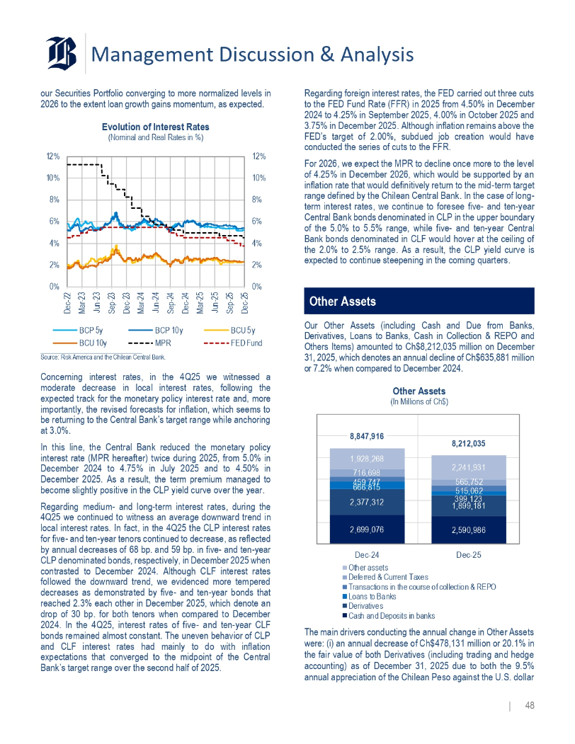 Management Discussion & Analysis our Securities Portfolio converging to more normalized levels in 2026 to the extent loan growth gains momentum, as expected. Evolution of Interest Rates (Nominal and Real Rates in %) 0% 2% 4% 6% 8% 10% 12% 0% 2% 4% 6% 8% 10% 12% Dec - 22 Mar - 23 Jun - 23 Sep - 23 Dec - 23 Mar - 24 Jun - 24 Sep - 24 Dec - 24 Mar - 25 Jun - 25 Sep - 25 Dec - 25 BCP 5y BCU 10y BCP 10y MPR BCU 5y FED Fund Source: Risk America and the Chilean Central Bank. Concerning interest rates, in the 4 Q 25 we witnessed a moderate decrease in local interest rates, following the expected track for the monetary policy interest rate and, more importantly, the revised forecasts for inflation, which seems to be returning to the Central Bank’s target range while anchoring at 3 . 0 % . In this line, the Central Bank reduced the monetary policy interest rate (MPR hereafter) twice during 2025 , from 5 . 0 % in December 2024 to 4 . 75 % in July 2025 and to 4 . 50 % in December 2025 . As a result, the term premium managed to become slightly positive in the CLP yield curve over the year . Regarding medium - and long - term interest rates, during the 4 Q 25 we continued to witness an average downward trend in local interest rates . In fact, in the 4 Q 25 the CLP interest rates for five - and ten - year tenors continued to decrease, as reflected by annual decreases of 68 bp . and 59 bp . in five - and ten - year CLP denominated bonds, respectively, in December 2025 when contrasted to December 2024 . Although CLF interest rates followed the downward trend, we evidenced more tempered decreases as demonstrated by five - and ten - year bonds that reached 2 . 3 % each other in December 2025 , which denote an drop of 30 bp . for both tenors when compared to December 2024 . In the 4 Q 25 , interest rates of five - and ten - year CLF bonds remained almost constant . The uneven behavior of CLP and CLF interest rates had mainly to do with inflation expectations that converged to the midpoint of the Central Bank’s target range over the second half of 2025 . Regarding foreign interest rates, the FED carried out three cuts to the FED Fund Rate (FFR) in 2025 from 4 . 50 % in December 2024 to 4 . 25 % in September 2025 , 4 . 00 % in October 2025 and 3 . 75 % in December 2025 . Although inflation remains above the FED’s target of 2 . 00 % , subdued job creation would have conducted the series of cuts to the FFR . For 2026 , we expect the MPR to decline once more to the level of 4 . 25 % in December 2026 , which would be supported by an inflation rate that would definitively return to the mid - term target range defined by the Chilean Central Bank . In the case of long - term interest rates, we continue to foresee five - and ten - year Central Bank bonds denominated in CLP in the upper boundary of the 5 . 0 % to 5 . 5 % range, while five - and ten - year Central Bank bonds denominated in CLF would hover at the ceiling of the 2 . 0 % to 2 . 5 % range . As a result, the CLP yield curve is expected to continue steepening in the coming quarters . Other Assets Our Other Assets (including Cash and Due from Banks, Derivatives, Loans to Banks, Cash in Collection & REPO and Others Items) amounted to Ch $ 8 , 212 , 035 million on December 31 , 2025 , which denotes an annual decline of Ch $ 635 , 881 million or 7 . 2 % when compared to December 2024 . Other Assets (In Millions of Ch$) 8,847,916 8,212,035 1,928,268 2,241,931 716,698 565,752 459,747 666,815 515,062 2,377,312 399,123 1,899,181 2,590,986 2,699,076 Dec - 24 Other assets Deferred & Current Taxes Dec - 25 Transactions in the course of collection & REPO Loans to Banks Derivatives Cash and Deposits in banks The main drivers conducting the annual change in Other Assets were : (i) an annual decrease of Ch $ 478 , 131 million or 20 . 1 % in the fair value of both Derivatives (including trading and hedge accounting) as of December 31 , 2025 due to both the 9 . 5 % annual appreciation of the Chilean Peso against the U . S . dollar | 48
