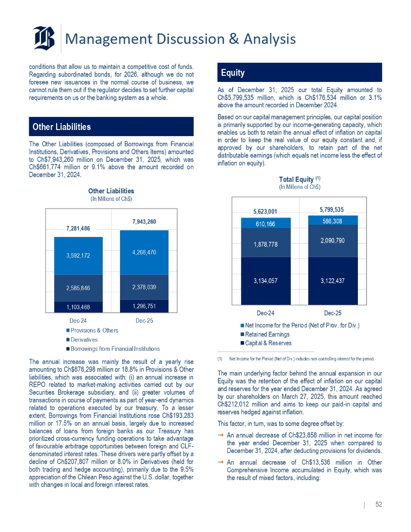 Management Discussion & Analysis conditions that allow us to maintain a competitive cost of funds . Regarding subordinated bonds, for 2026 , although we do not foresee new issuances in the normal course of business, we cannot rule them out if the regulator decides to set further capital requirements on us or the banking system as a whole . Other Liabilities The Other Liabilities (composed of Borrowings from Financial Institutions, Derivatives, Provisions and Others Items) amounted to Ch $ 7 , 943 , 260 million on December 31 , 2025 , which was Ch $ 661 , 774 million or 9 . 1 % above the amount recorded on December 31 , 2024 . Other Liabilities (In Millions of Ch$) 7,943,260 7,281,486 4,268,470 3,592,172 2,378,039 2,585,846 1,296,751 1,103,468 Dec - 25 Dec - 24 Provisions & Others Derivatives Borrowings from Financial Institutions The annual increase was mainly the result of a yearly rise amounting to Ch $ 676 , 298 million or 18 . 8 % in Provisions & Other liabilities, which was associated with : (i) an annual increase in REPO related to market - making activities carried out by our Securities Brokerage subsidiary, and (ii) greater volumes of transactions in course of payments as part of year - end dynamics related to operations executed by our treasury . To a lesser extent, Borrowings from Financial Institutions rose Ch $ 193 , 283 million or 17 . 5 % on an annual basis, largely due to increased balances of loans from foreign banks as our Treasury has prioritized cross - currency funding operations to take advantage of favourable arbitrage opportunities between foreign and CLF - denominated interest rates . These drivers were partly offset by a decline of Ch $ 207 , 807 million or 8 . 0 % in Derivatives (held for both trading and hedge accounting), primarily due to the 9 . 5 % appreciation of the Chilean Peso against the U . S . dollar, together with changes in local and foreign interest rates . Equity As of December 31 , 2025 our total Equity amounted to Ch $ 5 , 799 , 535 million, which is Ch $ 176 , 534 million or 3 . 1 % above the amount recorded in December 2024 . Based on our capital management principles, our capital position is primarily supported by our income - generating capacity, which enables us both to retain the annual effect of inflation on capital in order to keep the real value of our equity constant and, if approved by our shareholders, to retain part of the net distributable earnings (which equals net income less the effect of inflation on equity) . Total Equity (1) (In Millions of Ch$) 5,799,535 5,623,001 586,308 610,166 2,090,790 1,878,778 3,122,437 3,134,057 Dec - 24 Dec - 25 Net Income for the Period (Net of Prov. for Div.) Retained Earnings Capital & Reserves (1) Net Income for the Period (Net of Div.) includes non - controlling interest for the period. | 52 The main underlying factor behind the annual expansion in our Equity was the retention of the effect of inflation on our capital and reserves for the year ended December 31 , 2024 . As agreed by our shareholders on March 27 , 2025 , this amount reached Ch $ 212 , 012 million and aims to keep our paid - in capital and reserves hedged against inflation . This factor, in turn, was to some degree offset by : ⭬ An annual decrease of Ch $ 23 , 858 million in net income for the year ended December 31 , 2025 when compared to December 31 , 2024 , after deducting provisions for dividends . ⭬ An annual decrease of Ch $ 13 , 536 million in Other Comprehensive Income accumulated in Equity, which was the result of mixed factors, including :