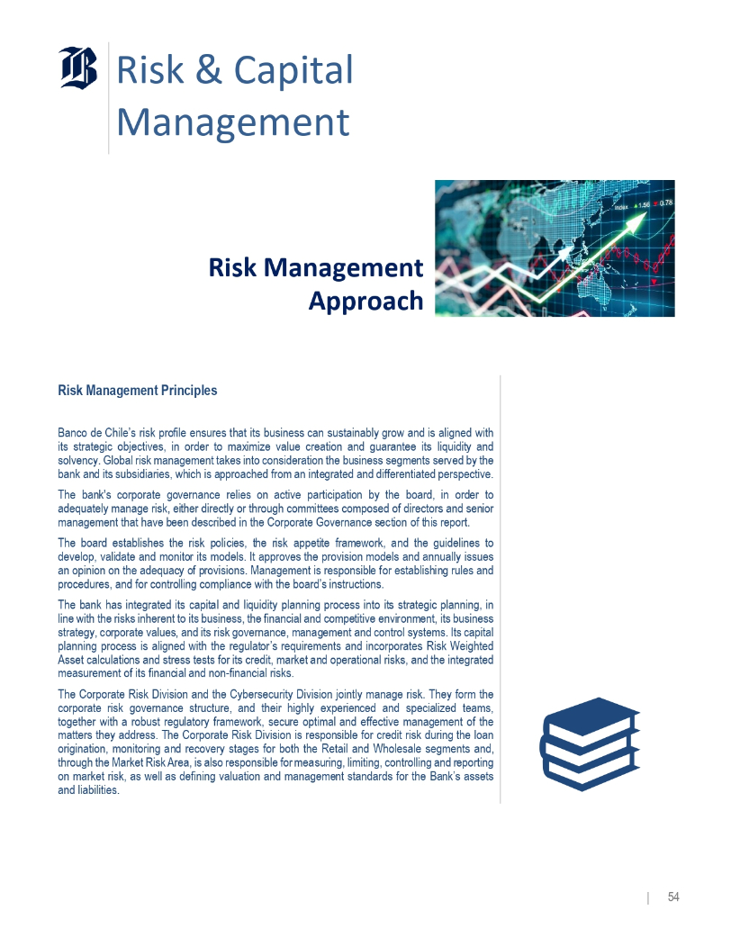Risk & Capital Management Risk Management Approach Risk Management Principles Banco de Chile’s risk profile ensures that its business can sustainably grow and is aligned with its strategic objectives, in order to maximize value creation and guarantee its liquidity and solvency . Global risk management takes into consideration the business segments served by the bank and its subsidiaries, which is approached from an integrated and differentiated perspective . The bank's corporate governance relies on active participation by the board, in order to adequately manage risk, either directly or through committees composed of directors and senior management that have been described in the Corporate Governance section of this report . The board establishes the risk policies, the risk appetite framework, and the guidelines to develop, validate and monitor its models . It approves the provision models and annually issues an opinion on the adequacy of provisions . Management is responsible for establishing rules and procedures, and for controlling compliance with the board’s instructions . The bank has integrated its capital and liquidity planning process into its strategic planning, in line with the risks inherent to its business, the financial and competitive environment, its business strategy, corporate values, and its risk governance, management and control systems . Its capital planning process is aligned with the regulator’s requirements and incorporates Risk Weighted Asset calculations and stress tests for its credit, market and operational risks, and the integrated measurement of its financial and non - financial risks . The Corporate Risk Division and the Cybersecurity Division jointly manage risk . They form the corporate risk governance structure, and their highly experienced and specialized teams, together with a robust regulatory framework, secure optimal and effective management of the matters they address . The Corporate Risk Division is responsible for credit risk during the loan origination, monitoring and recovery stages for both the Retail and Wholesale segments and, through the Market Risk Area, is also responsible for measuring, limiting, controlling and reporting on market risk, as well as defining valuation and management standards for the Bank’s assets and liabilities . | 54