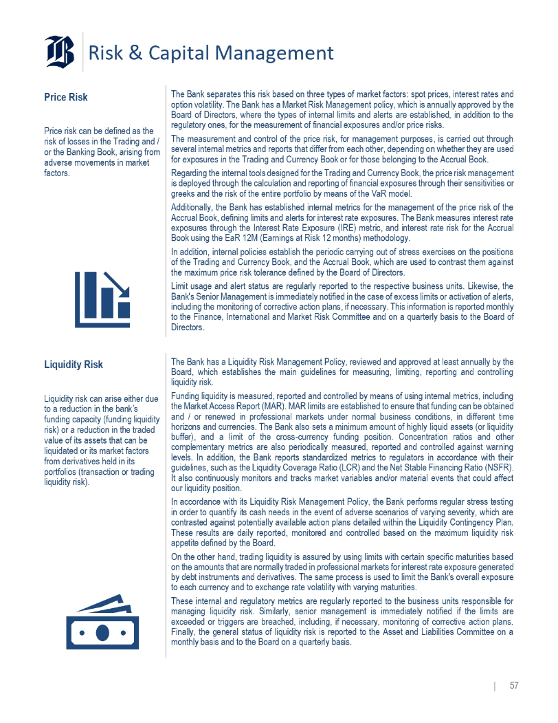 Risk & Capital Management The Bank separates this risk based on three types of market factors : spot prices, interest rates and option volatility . The Bank has a Market Risk Management policy, which is annually approved by the Board of Directors, where the types of internal limits and alerts are established, in addition to the regulatory ones, for the measurement of financial exposures and/or price risks . The measurement and control of the price risk, for management purposes, is carried out through several internal metrics and reports that differ from each other, depending on whether they are used for exposures in the Trading and Currency Book or for those belonging to the Accrual Book . Regarding the internal tools designed for the Trading and Currency Book, the price risk management is deployed through the calculation and reporting of financial exposures through their sensitivities or greeks and the risk of the entire portfolio by means of the VaR model . Additionally, the Bank has established internal metrics for the management of the price risk of the Accrual Book, defining limits and alerts for interest rate exposures . The Bank measures interest rate exposures through the Interest Rate Exposure (IRE) metric, and interest rate risk for the Accrual Book using the EaR 12 M (Earnings at Risk 12 months) methodology . In addition, internal policies establish the periodic carrying out of stress exercises on the positions of the Trading and Currency Book, and the Accrual Book, which are used to contrast them against the maximum price risk tolerance defined by the Board of Directors . Limit usage and alert status are regularly reported to the respective business units . Likewise, the Bank's Senior Management is immediately notified in the case of excess limits or activation of alerts, including the monitoring of corrective action plans, if necessary . This information is reported monthly to the Finance, International and Market Risk Committee and on a quarterly basis to the Board of Directors . Price Risk Price risk can be defined as the risk of losses in the Trading and / or the Banking Book, arising from adverse movements in market factors. The Bank has a Liquidity Risk Management Policy, reviewed and approved at least annually by the Board, which establishes the main guidelines for measuring, limiting, reporting and controlling liquidity risk . Funding liquidity is measured, reported and controlled by means of using internal metrics, including the Market Access Report (MAR) . MAR limits are established to ensure that funding can be obtained and / or renewed in professional markets under normal business conditions, in different time horizons and currencies . The Bank also sets a minimum amount of highly liquid assets (or liquidity buffer), and a limit of the cross - currency funding position . Concentration ratios and other complementary metrics are also periodically measured, reported and controlled against warning levels . In addition, the Bank reports standardized metrics to regulators in accordance with their guidelines, such as the Liquidity Coverage Ratio (LCR) and the Net Stable Financing Ratio (NSFR) . It also continuously monitors and tracks market variables and/or material events that could affect our liquidity position . In accordance with its Liquidity Risk Management Policy, the Bank performs regular stress testing in order to quantify its cash needs in the event of adverse scenarios of varying severity, which are contrasted against potentially available action plans detailed within the Liquidity Contingency Plan . These results are daily reported, monitored and controlled based on the maximum liquidity risk appetite defined by the Board . On the other hand, trading liquidity is assured by using limits with certain specific maturities based on the amounts that are normally traded in professional markets for interest rate exposure generated by debt instruments and derivatives . The same process is used to limit the Bank's overall exposure to each currency and to exchange rate volatility with varying maturities . These internal and regulatory metrics are regularly reported to the business units responsible for managing liquidity risk . Similarly, senior management is immediately notified if the limits are exceeded or triggers are breached, including, if necessary, monitoring of corrective action plans . Finally, the general status of liquidity risk is reported to the Asset and Liabilities Committee on a monthly basis and to the Board on a quarterly basis . Liquidity Risk Liquidity risk can arise either due to a reduction in the bank’s funding capacity (funding liquidity risk) or a reduction in the traded value of its assets that can be liquidated or its market factors from derivatives held in its portfolios (transaction or trading liquidity risk). | 57