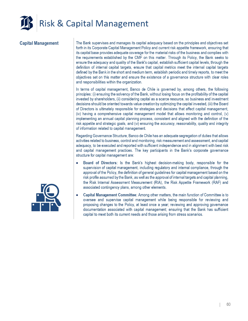 Risk & Capital Management The Bank supervises and manages its capital adequacy based on the principles and objectives set forth in its Corporate Capital Management Policy and current risk appetite framework, ensuring that its capital base provides adequate coverage for the material risks of the business and complies with the requirements established by the CMF on this matter . Through its Policy, the Bank seeks to ensure the adequacy and quality of the Bank's capital, establish sufficient capital levels, through the definition of internal capital targets, ensure that capital metrics meet the internal capital targets defined by the Bank in the short and medium term, establish periodic and timely reports, to meet the objectives set on this matter and ensure the existence of a governance structure with clear roles and responsibilities within the organization . In terms of capital management, Banco de Chile is governed by, among others, the following principles : (i) ensuring the solvency of the Bank, without losing focus on the profitability of the capital invested by shareholders, (ii) considering capital as a scarce resource, so business and investment decisions should be oriented towards value creation by optimizing the capital invested, (iii) the Board of Directors is ultimately responsible for strategies and decisions that affect capital management, (iv) having a comprehensive capital management model that allows monitoring and control, (v) implementing an annual capital planning process, consistent and aligned with the definition of the risk appetite and strategic goals, and (vi) ensuring the accuracy, reasonability, quality and integrity of information related to capital management . Regarding Governance Structure, Banco de Chile has an adequate segregation of duties that allows activities related to business, control and monitoring, risk measurement and assessment, and capital adequacy, to be executed and reported with sufficient independence and in alignment with best risk and capital management practices . The key participants in the Bank's corporate governance structure for capital management are : Board of Directors : Is the Bank's highest decision - making body, responsible for the supervision of capital management, including regulatory and internal compliance, through the approval of the Policy, the definition of general guidelines for capital management based on the risk profile assumed by the Bank, as well as the approval of internal targets and capital planning, the Risk Internal Assessment Measurement (RIA), the Risk Appetite Framework (RAF) and associated contingency plans, among other elements . Capital Management Committee : Among other matters, the main function of Committee is to oversee and supervise capital management while being responsible for reviewing and proposing changes to the Policy, at least once a year ; reviewing and approving governance documentation associated with capital management ; ensuring that the Bank has sufficient capital to meet both its current needs and those arising from stress scenarios . Capital Management | 60