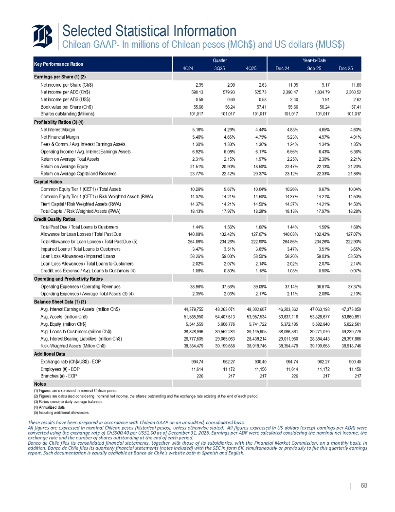 Selected Statistical Information Chilean GAAP - In millions of Chilean pesos (MCh$) and US dollars (MUS$) Dec - 25 Year - to - Date Sep - 25 Dec - 24 4Q25 Quarter 3Q25 4Q24 Key Performance Ratios Earnings per Share (1) (2) 11.80 9.17 11.95 2.63 2.90 2.95 Net income per Share (Ch$) 2,360.52 1,834.79 2,390.47 525.73 579.93 590.13 Net income per ADS (Ch$) 2.62 1.91 2.40 0.58 0.60 0.59 Net income per ADS (US$) 57.41 56.24 55.66 57.41 56.24 55.66 Book value per Share (Ch$) 101,017 101,017 101,017 101,017 101,017 101,017 Shares outstanding (Millions) Profitability Ratios (3) (4) 4.60% 4.65% 4.88% 4.44% 4.29% 5.16% Net Interest Margin 4.91% 4.97% 5.23% 4.75% 4.65% 5.46% Net Financial Margin 1.35% 1.34% 1.24% 1.36% 1.33% 1.30% Fees & Comm. / Avg. Interest Earnings Assets 6.36% 6.43% 6.56% 6.17% 6.08% 6.92% Operating Income / Avg. Interest Earnings Assets 2.21% 2.30% 2.25% 1.97% 2.15% 2.31% Return on Average Total Assets 21.20% 22.13% 22.47% 18.50% 20.90% 21.51% Return on Average Equity 21.86% 22.33% 23.12% 20.37% 22.42% 23.77% Return on Average Capital and Reserves Capital Ratios 10.04% 9.67% 10.26% 10.04% 9.67% 10.26% Common Equity Tier 1 (CET1) / Total Assets 14.50% 14.21% 14.37% 14.50% 14.21% 14.37% Common Equity Tier 1 (CET1) / Risk Weighted Assets (RWA) 14.50% 14.21% 14.37% 14.50% 14.21% 14.37% Tier1 Capital / Risk Weighted Assets (RWA) 18.28% 17.97% 18.13% 18.28% 17.97% 18.13% Total Capital / Risk Weighted Assets (RWA) Credit Quality Ratios 1.68% 1.56% 1.44% 1.68% 1.56% 1.44% Total Past Due / Total Loans to Customers 127.07% 132.42% 140.08% 127.07% 132.42% 140.08% Allowance for Loan Losses / Total Past Due 222.90% 234.26% 264.86% 222.90% 234.26% 264.86% Total Allowance for Loan Losses / Total Past Due (5) 3.65% 3.51% 3.47% 3.65% 3.51% 3.47% Impaired Loans / Total Loans to Customers 58.50% 59.03% 58.26% 58.50% 59.03% 58.26% Loan Loss Allowances / Impaired Loans 2.14% 2.07% 2.02% 2.14% 2.07% 2.02% Loan Loss Allowances / Total Loans to Customers 0.97% 0.90% 1.03% 1.18% 0.80% 1.08% Credit Loss Expense / Avg. Loans to Customers (4) Operating and Productivity Ratios 37.37% 36.81% 37.14% 39.09% 37.56% 38.96% Operating Expenses / Operating Revenues 2.10% 2.08% 2.11% 2.17% 2.03% 2.35% Operating Expenses / Average Total Assets (3) (4) Balance Sheet Data (1) (3) 47,373,050 47,063,198 46,203,362 48,302,607 48,263,071 44,379,755 Avg. Interest Earnings Assets (million Ch$) 53,860,891 53,828,677 53,637,116 53,957,534 54,407,613 51,585,950 Avg. Assets (million Ch$) 5,622,561 5,582,840 5,372,195 5,741,722 5,606,776 5,541,559 Avg. Equity (million Ch$) 39,239,779 39,271,070 38,086,361 39,145,905 39,552,284 38,328,996 Avg. Loans to Customers (million Ch$) 28,397,886 28,384,443 29,011,950 28,438,214 29,065,063 26,777,605 Avg. Interest Bearing Liabilities (million Ch$) 38,918,746 39,199,658 38,354,479 38,918,746 39,199,658 38,354,479 Risk - Weighted Assets (Million Ch$) Additional Data 900.40 962.27 994.74 900.40 962.27 994.74 Exchange rate (Ch$/US$) - EOP 11,156 11,172 11,614 11,156 11,172 11,614 Employees (#) - EOP 217 217 226 217 217 226 Branches (#) - EOP Notes (1) Figures are expressed in nominal Chilean pesos. (2) Figures are calculated considering nominal net income, the shares outstanding and the exchange rate existing at the end of each period. (3) Ratios consider daily average balances. (4) Annualized data. (5) Including additional allowances. | 68 These results have been prepared in accordance with Chilean GAAP on an unaudited, consolidated basis . All figures are expressed in nominal Chilean pesos (historical pesos), unless otherwise stated . All figures expressed in US dollars (except earnings per ADR) were converted using the exchange rate of Ch $ 900 . 40 per US $ 1 . 00 as of December 31 , 2025 . Earnings per ADR were calculated considering the nominal net income, the exchange rate and the number of shares outstanding at the end of each period . Banco de Chile files its consolidated financial statements, together with those of its subsidiaries, with the Financial Market Commission, on a monthly basis . In addition, Banco de Chile files its quarterly financial statements (notes included) with the SEC in form 6 K, simultaneously or previously to file this quarterly earnings report . Such documentation is equally available at Banco de Chile’s website both in Spanish and English .
