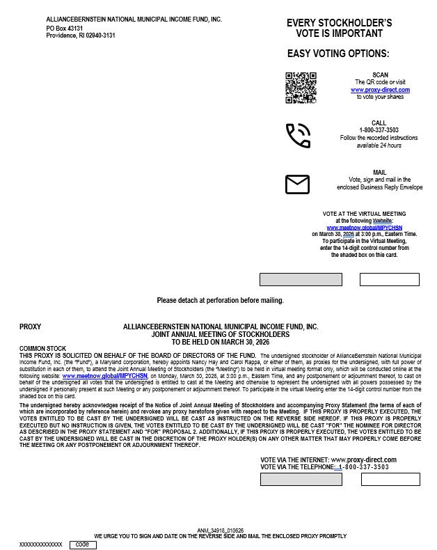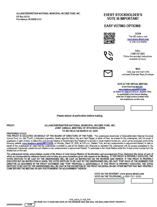 This Proxy Statement is furnished in connection with the solicitation of proxies on behalf of the respective Boards of Directors (collectively, the “Board”) of AllianceBernstein Global High Income Fund, Inc. (“AGHIF”) and AllianceBernstein National Municipal Income Fund, Inc. (“ANMIF”), each of which is a Maryland corporation (each, a “Fund” and collectively, the “Funds”), to be exercised at a Joint Annual Meeting of Stockholders of the Funds (the “Meeting”), to be held on Monday, March 30, 2026 at 3:00 p.m., Eastern Time. The solicitation will be by mail and the cost for each Fund will be borne by that Fund. The Notice of Meeting, Proxy Statement and Proxy Card are being mailed to stockholders on or about February 27, 2026.
