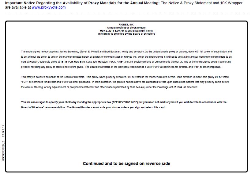 0000373859_2 R1.0.1.17 Important Notice Regarding the Availability of Proxy Materials for the Annual Meeting: The Notice & Proxy Statement and 10K Wrapper are available at www.proxyvote.com RIGNET, INC Annual Meeting of Stockholders May 2, 2018 8:00 AM (Central Daylight Time) This proxy is solicited by the Board of Directors The undersigned hereby appoints James Browning, Steven E. Pickett and Brad Eastman, jointly and severally, as the undersigned's proxy or proxies, each with full power of substitution and to act without the other, to vote in the manner directed herein all shares of common stock of RigNet, Inc. which the undersigned is entitled to vote at the annual meeting of stockholders to be held at RigNet's corporate office at 15115 Park Row Blvd. Suite 300, Houston, Texas 77084 and any postponements or adjournments thereof, as fully as the undersigned could if personally present, revoking any proxy or proxies heretofore given. The Board of Directors of the Company recommends a vote "FOR" all nominees for director, and "For" all other proposals. This proxy is solicited on behalf of the Board of Directors. This proxy, when properly executed, will be voted in the manner directed herein. If no direction is made, this proxy will be voted "FOR" all nominees for director and "FOR" all other proposals. In their discretion, the proxies named above are authorized to vote upon such other matters that may properly come before the Annual Meeting, or any adjournment or postponement thereof and other matters permitted by Rule 14a-4(c) under the Exchange Act of 1934, as amended. You are encouraged to specify your choice by marking the appropriate box (SEE REVERSE SIDE) but you need not mark any box if you wish to vote in accordance with the Board of Directors' recommendation. The Named Proxies cannot vote your shares unless you sign and return this card. Continued and to be signed on reverse side