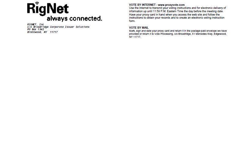 THIS PROXY CARD IS VALID ONLY WHEN SIGNED AND DATED. KEEP THIS PORTION FOR YOUR RECORDS DETACH AND RETURN THIS PORTION ONLY TO VOTE, MARK BLOCKS BELOW IN BLUE OR BLACK INK AS FOLLOWS: Signature [PLEASE SIGN WITHIN BOX] Date Signature (Joint Owners) Date 0000373859_1 R1.0.1.17 RIGNET, Inc c/o Broadridge Corporate Issuer Solutions PO Box 1342 Brentwood, NY 11717 VOTE BY INTERNET - www.proxyvote.com Use the Internet to transmit your voting instructions and for electronic delivery of information up until 11:59 P.M. Eastern Time the day before the meeting date. Have your proxy card in hand when you access the web site and follow the instructions to obtain your records and to create an electronic voting instruction form. VOTE BY MAIL Mark, sign and date your proxy card and return it in the postage-paid envelope we have provided or return it to Vote Processing, c/o Broadridge, 51 Mercedes Way, Edgewood, NY 11717. The Board of Directors recommends you vote FOR the following: 1. Election of Directors Nominees For Against Abstain 01 James H. Browning 02 Mattia Caprioli 03 Kevin Mulloy 04 Kevin J. O'Hara 05 Keith Olsen 06 Brent K. Whittington 07 Ditlef de Vibe 08 Steven E. Pickett For Against Abstain 09 Gail Smith The Board of Directors recommends you vote FOR proposals 2 and 3. For Against Abstain 2 To ratify the selection of Deloitte & Touche LLP as the Company's Independent Registered Public Accounting Firm for the fiscal year ending December 31, 2018. 3 Approve named executive officers' compensation as a non-binding advisory vote. NOTE: In their discretion, the proxies are authorized to vote upon such other matters as may properly come before the annual meeting or any postponements or adjournments thereof or other matters permitted by Rule 14a-4(c)under the Exchange Act. Please sign exactly as your name(s) appear(s) hereon. When signing as attorney, executor, administrator, or other fiduciary, please give full title as such. Joint owners should each sign personally. All holders must sign. If a corporation or partnership, please sign in full corporate or partnership name, by authorized officer. Yes No Please indicate if you plan to attend this meeting