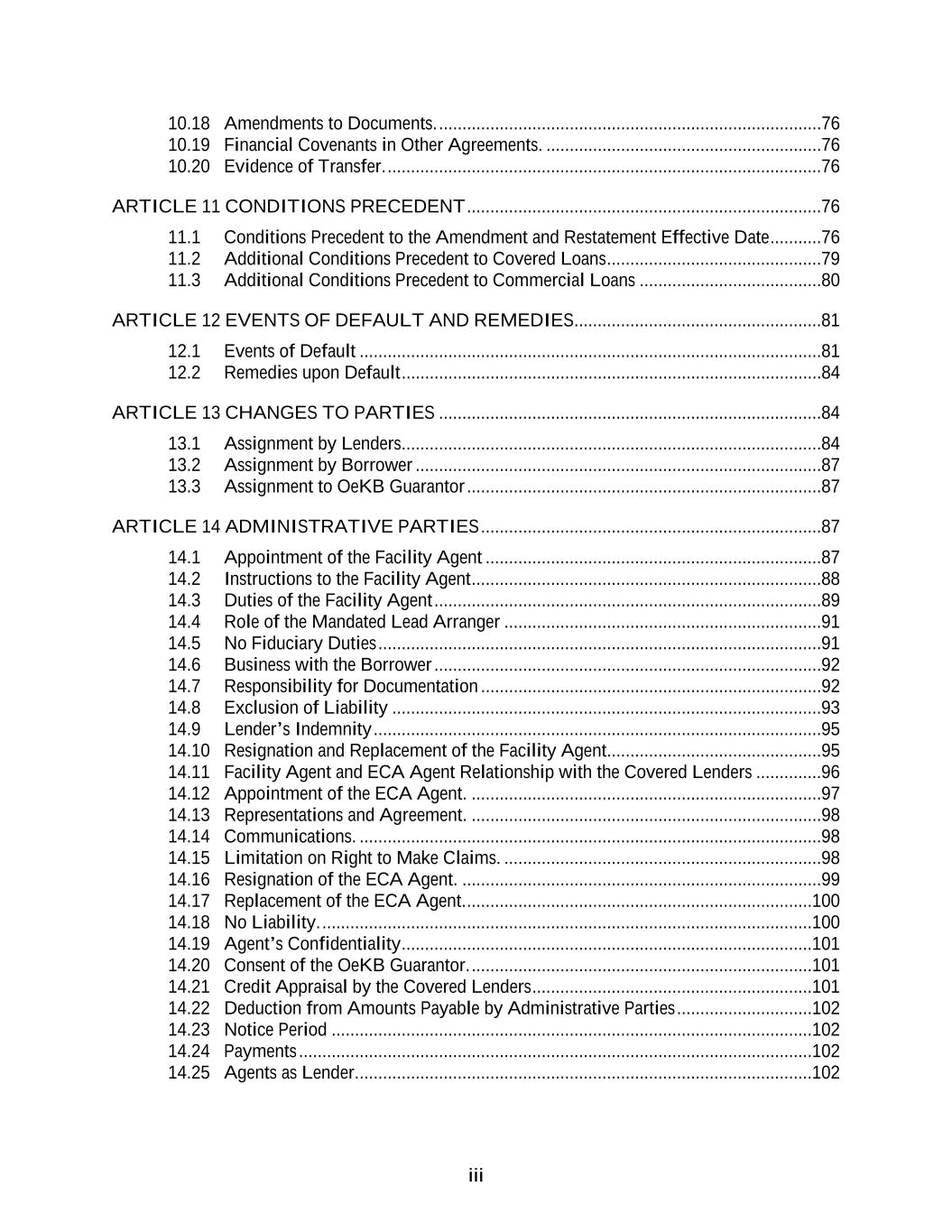 iii 10.18 Amendments to Documents. ..................................................................................76 10.19 Financial Covenants in Other Agreements. ...........................................................76 10.20 Evidence of Transfer. .............................................................................................76 ARTICLE 11 CONDITIONS PRECEDENT ............................................................................76 11.1 Conditions Precedent to the Amendment and Restatement Effective Date ...........76 11.2 Additional Conditions Precedent to Covered Loans ..............................................79 11.3 Additional Conditions Precedent to Commercial Loans .......................................80 ARTICLE 12 EVENTS OF DEFAULT AND REMEDIES .....................................................81 12.1 Events of Default ...................................................................................................81 12.2 Remedies upon Default ..........................................................................................84 ARTICLE 13 CHANGES TO PARTIES ..................................................................................84 13.1 Assignment by Lenders..........................................................................................84 13.2 Assignment by Borrower .......................................................................................87 13.3 Assignment to OeKB Guarantor ............................................................................87 ARTICLE 14 ADMINISTRATIVE PARTIES .........................................................................87 14.1 Appointment of the Facility Agent ........................................................................87 14.2 Instructions to the Facility Agent ...........................................................................88 14.3 Duties of the Facility Agent ...................................................................................89 14.4 Role of the Mandated Lead Arranger ....................................................................91 14.5 No Fiduciary Duties ...............................................................................................91 14.6 Business with the Borrower ...................................................................................92 14.7 Responsibility for Documentation .........................................................................92 14.8 Exclusion of Liability ............................................................................................93 14.9 Lender’s Indemnity ................................................................................................95 14.10 Resignation and Replacement of the Facility Agent..............................................95 14.11 Facility Agent and ECA Agent Relationship with the Covered Lenders ..............96 14.12 Appointment of the ECA Agent. ...........................................................................97 14.13 Representations and Agreement. ...........................................................................98 14.14 Communications. ...................................................................................................98 14.15 Limitation on Right to Make Claims. ....................................................................98 14.16 Resignation of the ECA Agent. .............................................................................99 14.17 Replacement of the ECA Agent. ..........................................................................100 14.18 No Liability. .........................................................................................................100 14.19 Agent’s Confidentiality ........................................................................................101 14.20 Consent of the OeKB Guarantor. .........................................................................101 14.21 Credit Appraisal by the Covered Lenders ............................................................101 14.22 Deduction from Amounts Payable by Administrative Parties .............................102 14.23 Notice Period .......................................................................................................102 14.24 Payments ..............................................................................................................102 14.25 Agents as Lender..................................................................................................102