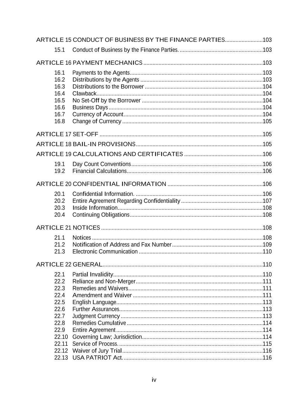 iv ARTICLE 15 CONDUCT OF BUSINESS BY THE FINANCE PARTIES .........................103 15.1 Conduct of Business by the Finance Parties. .......................................................103 ARTICLE 16 PAYMENT MECHANICS ...............................................................................103 16.1 Payments to the Agents ........................................................................................103 16.2 Distributions by the Agents .................................................................................103 16.3 Distributions to the Borrower ..............................................................................104 16.4 Clawback..............................................................................................................104 16.5 No Set-Off by the Borrower ................................................................................104 16.6 Business Days ......................................................................................................104 16.7 Currency of Account ............................................................................................104 16.8 Change of Currency .............................................................................................105 ARTICLE 17 SET-OFF ............................................................................................................105 ARTICLE 18 BAIL-IN PROVISIONS ....................................................................................105 ARTICLE 19 CALCULATIONS AND CERTIFICATES ....................................................106 19.1 Day Count Conventions .......................................................................................106 19.2 Financial Calculations ..........................................................................................106 ARTICLE 20 CONFIDENTIAL INFORMATION ...............................................................106 20.1 Confidential Information. ....................................................................................106 20.2 Entire Agreement Regarding Confidentiality ......................................................107 20.3 Inside Information ................................................................................................108 20.4 Continuing Obligations ........................................................................................108 ARTICLE 21 NOTICES ...........................................................................................................108 21.1 Notices .................................................................................................................108 21.2 Notification of Address and Fax Number ............................................................109 21.3 Electronic Communication ..................................................................................110 ARTICLE 22 GENERAL..........................................................................................................110 22.1 Partial Invalidity...................................................................................................110 22.2 Reliance and Non-Merger ....................................................................................111 22.3 Remedies and Waivers .........................................................................................111 22.4 Amendment and Waiver ......................................................................................111 22.5 English Language.................................................................................................113 22.6 Further Assurances...............................................................................................113 22.7 Judgment Currency ..............................................................................................113 22.8 Remedies Cumulative ..........................................................................................114 22.9 Entire Agreement .................................................................................................114 22.10 Governing Law; Jurisdiction................................................................................114 22.11 Service of Process. ...............................................................................................115 22.12 Waiver of Jury Trial .............................................................................................116 22.13 USA PATRIOT Act. ............................................................................................116